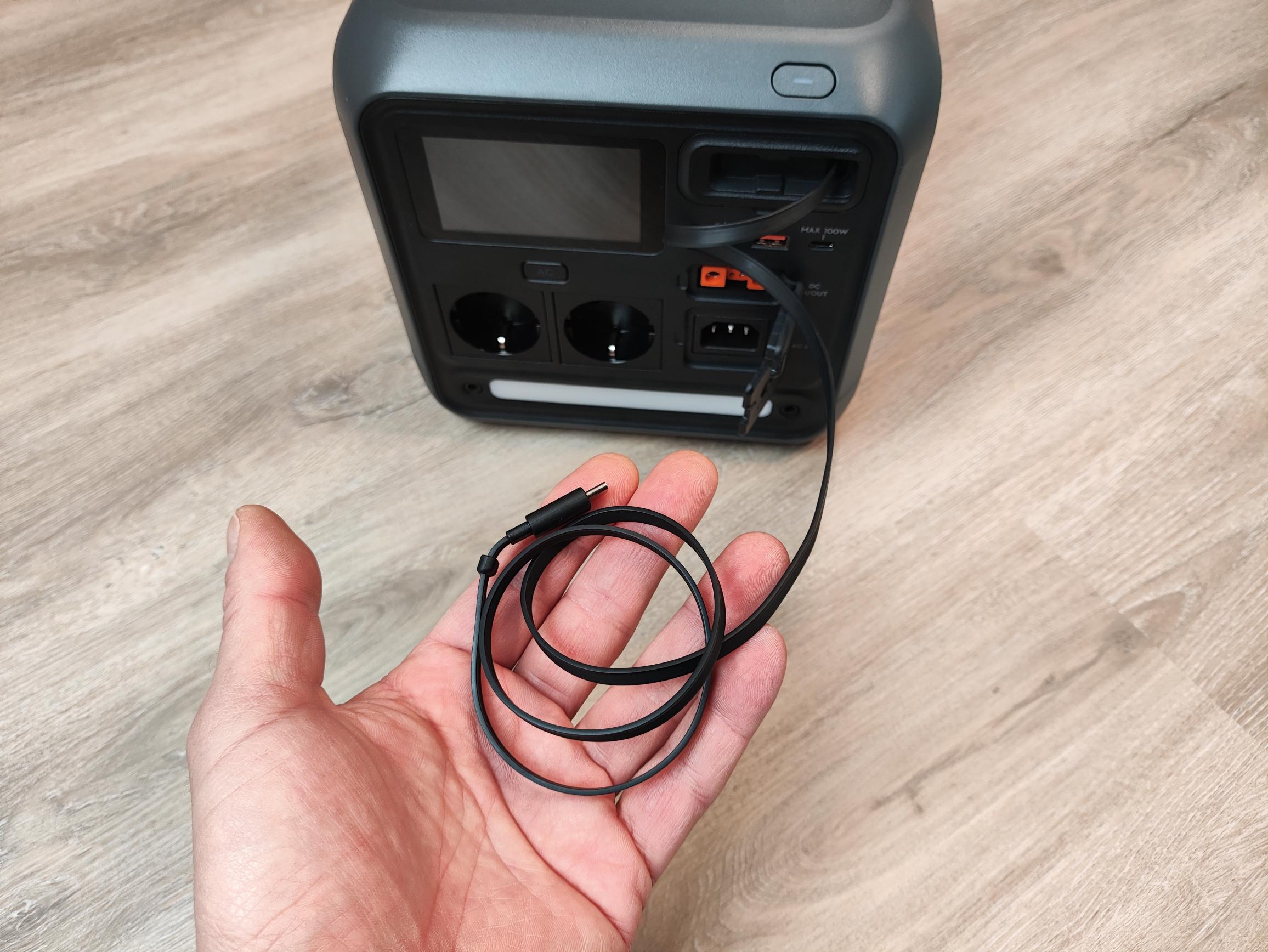 Laut Hersteller liefern beide USB-C-Ports bei gleichzeitiger Belastung eine Leistung von jeweils 100W. In unserem Test konnten aus dem ausziehbaren USB-C-Kabel (USB-C1) immer bis zu 100W entnommen werden. Werden aber beide Ports gleichzeitig verwendet, sinkt die Leistung an der USB-C-Buchse (USB-C2) auf maximal 50W (2,5A Strombegrenzung). Selbst wenn an dem ausziehbaren Kabel nur 5W entnommen werden, wird die Strombegrenzung am zweiten USB-C-Port aktiv. Somit stehen bei der Nutzung beider Ausgänge maximal 150W (100W USB-C1 / 50W USB-C2) zur Verfügung.