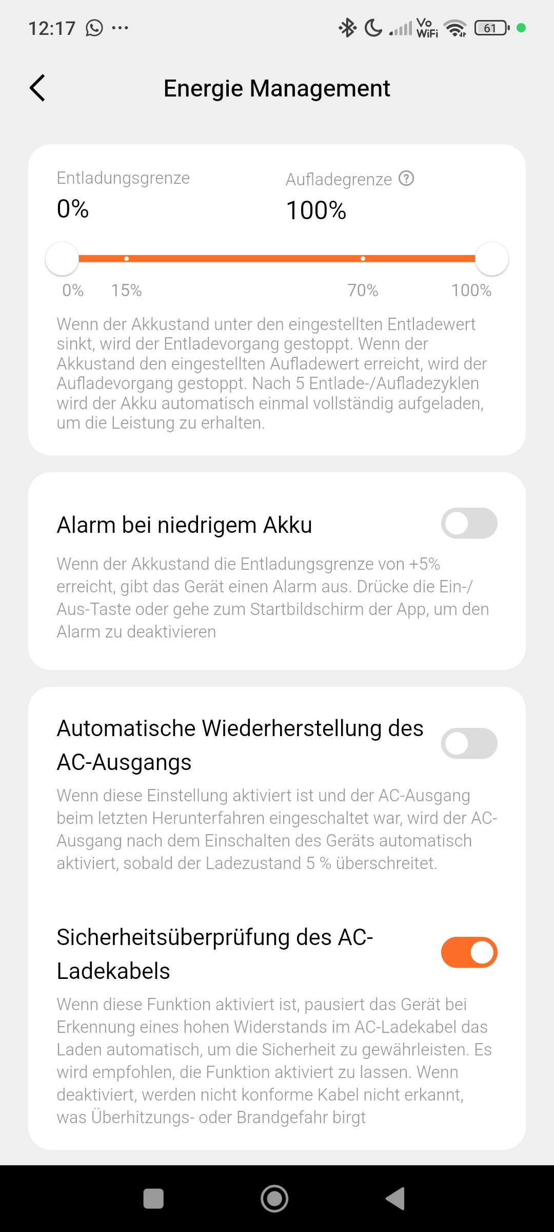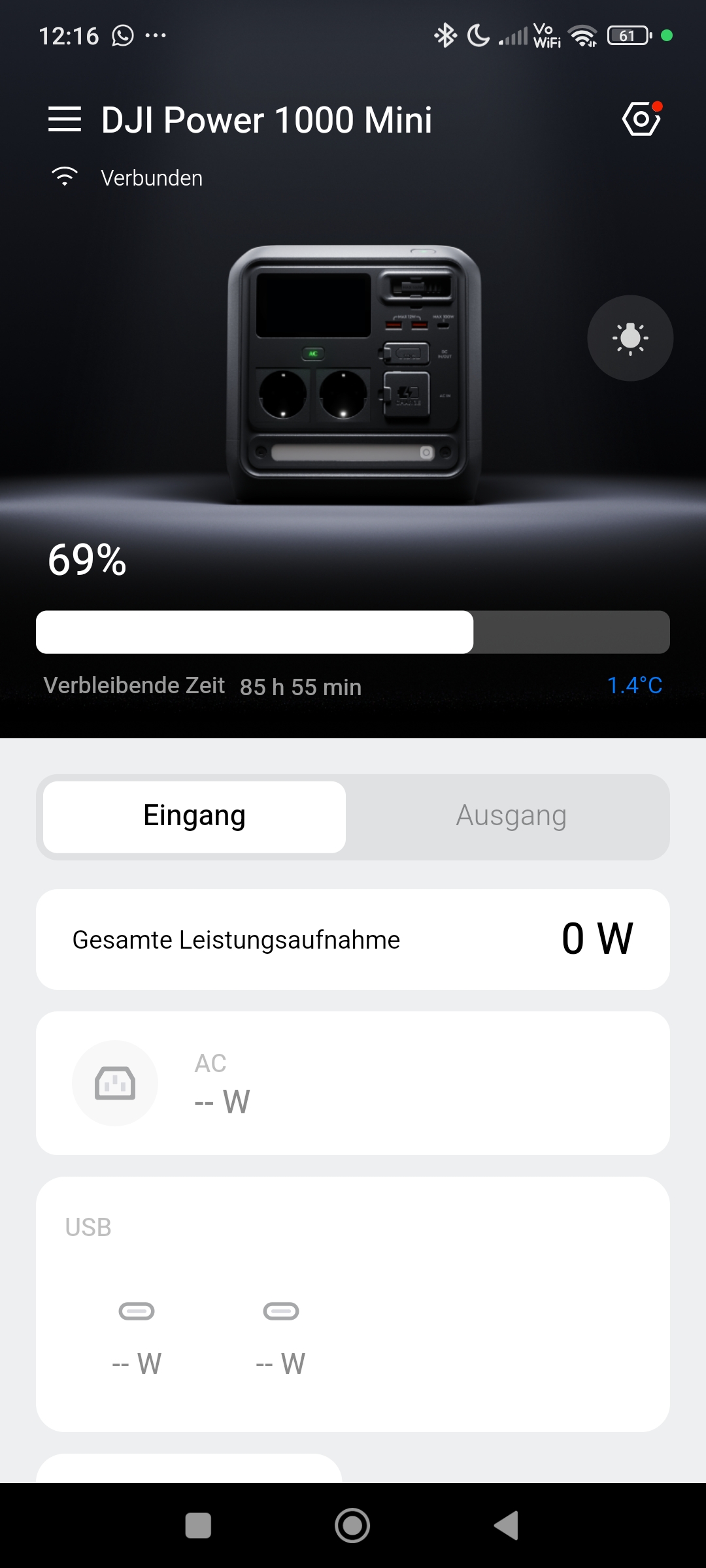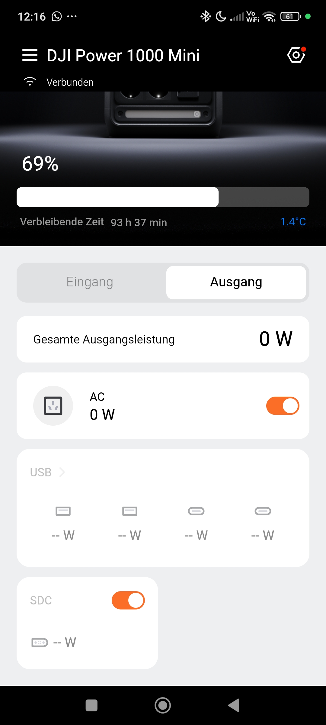 Auf der Startseite erhaltet ihr Informationen über den derzeitigen Ladestand sowie die Eingangs- und Ausgangsleistung. Weiterhin habt ihr die Möglichkeit, die aktuelle Temperatur und Restlaufzeit einzusehen. Die AC-Ausgänge, die LED-Leiste und der SDC-Port lassen sich per App bequem aus der Ferne aktivieren/deaktivieren. Weiterhin könnt ihr Funktionen wie Display-/Geräte-/AC-Timeout und die obere und untere Ladegrenze konfigurieren. Für eine besonders schonende und geräuscharme Ladung der Powerstation kann in den erweiterten Einstellungen auch die Ladegeschwindigkeit von 1.000W auf 500W gesenkt werden. Schaltet sich eure Powerstation aufgrund eines entleerten Akkus ab, kann sich der AC-Ausgang bei Bedarf automatisch wiedereinschalten, wenn der Ladestand des Akkus die 5% überschreitet. Dieses Feature kann für einen autonomen Betrieb in Verbindung mit der Solarladung sehr interessant sein. Insgesamt ist die DJI Home App sehr übersichtlich gehalten, selbsterklärend und bietet einen stimmigen Funktionsumfang.