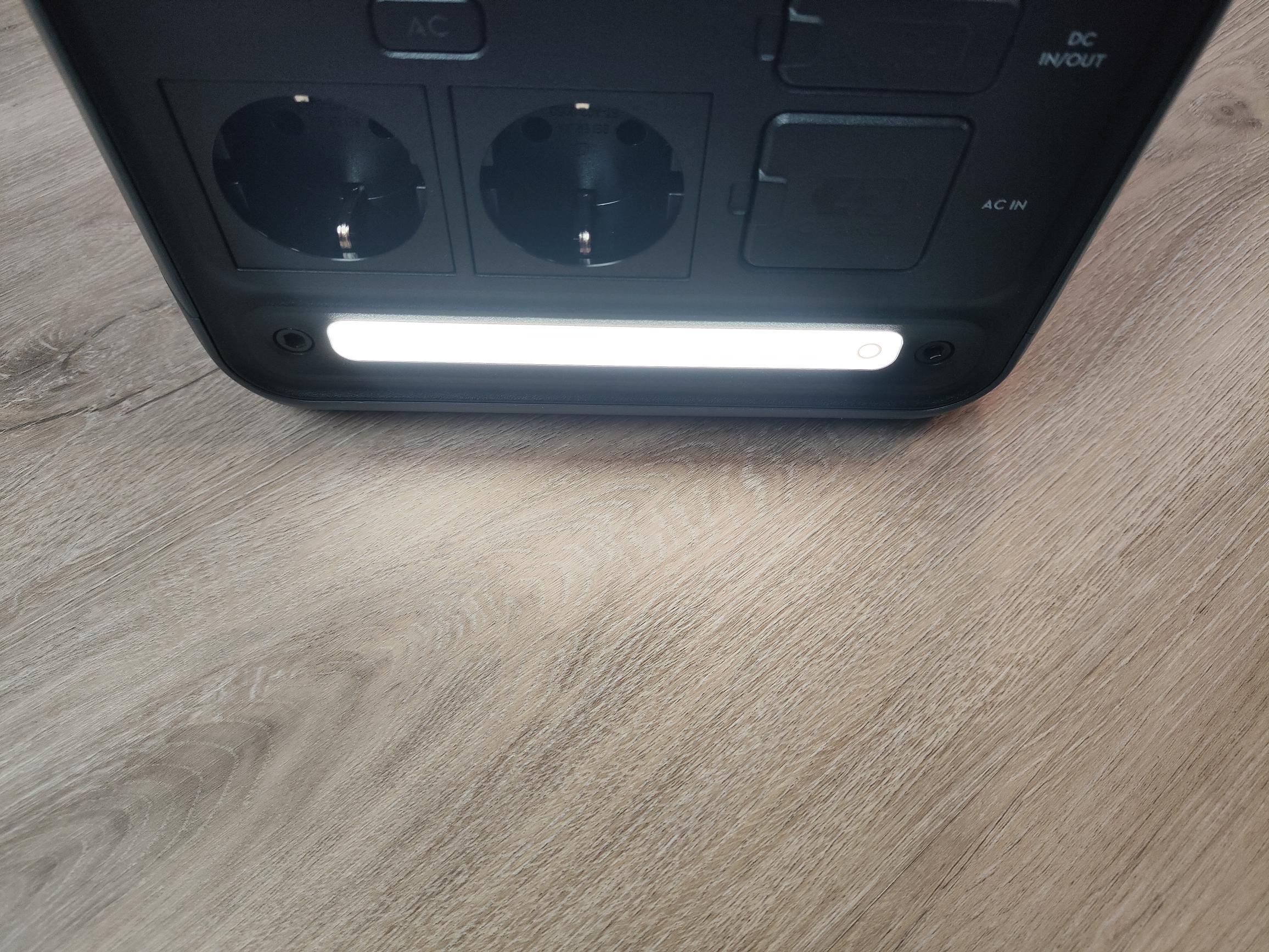 Die Bedienung erfolgt klassisch über Taster auf der Powerstation. Auf der Oberseite befindet sich der Power-Button, der die Powerstation aktiviert/deaktiviert. Während die DC-Ausgänge dauerhaft aktiv sind, müssen die Wechselstromsteckdosen mittels des darüberliegenden Tasters aktiviert werden. Eine grüne Hintergrundbeleuchtung des Tasters informiert euch über den jeweiligen Betriebszustand. Die LED-Lichtleiste auf der Unterseite lässt sich durch den danebenliegenden Taster aktivieren/deaktivieren. Sie bietet eine stufenlose Helligkeitsregulierung (Taster gedrückt halten) und eine SOS-Blinkfunktion (2x kurz drücken).