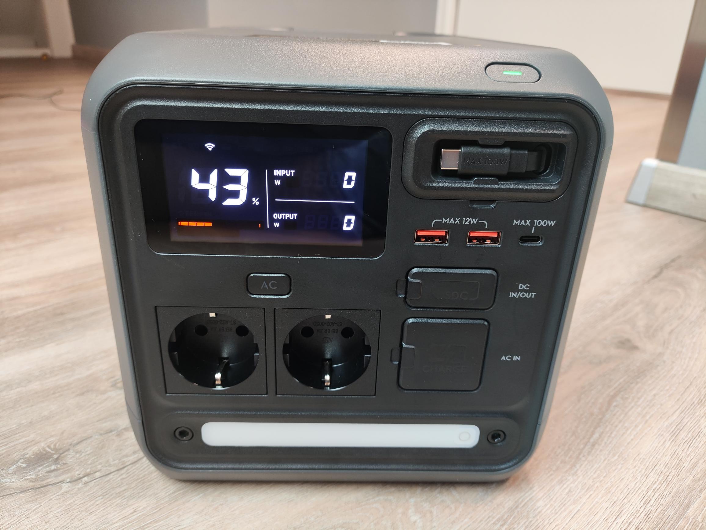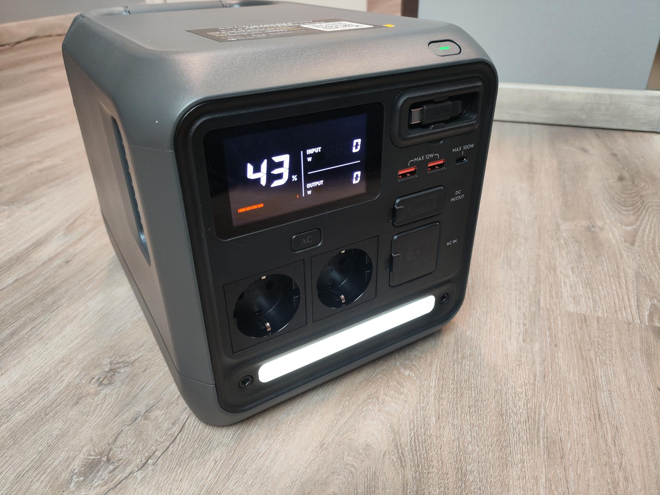 Die Ladegeschwindigkeit ist von Ladestand und der Temperatur abhängig. Die volle Ladeleistung von 1.000W konnten wir nur bei Temperaturen von über 20°C und bei einem Ladezustand (SoC) zwischen 20 und 80% messen. Eine komplette Ladung von 0-100% im Schnelllademodus dauert bei Zimmertemperatur somit rund 80 Minuten. Für eine vollständige Ladung werden 1.175Wh aus dem Stromnetz benötigt. Somit stehen 866Wh nutzbare Energie einem Energiebedarf von 1.180Wh entgegen. Dies entspricht einer Effizienz von 74% (26% kombinierte Lade-/Entladeverluste).