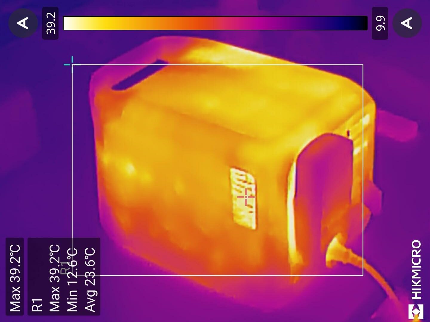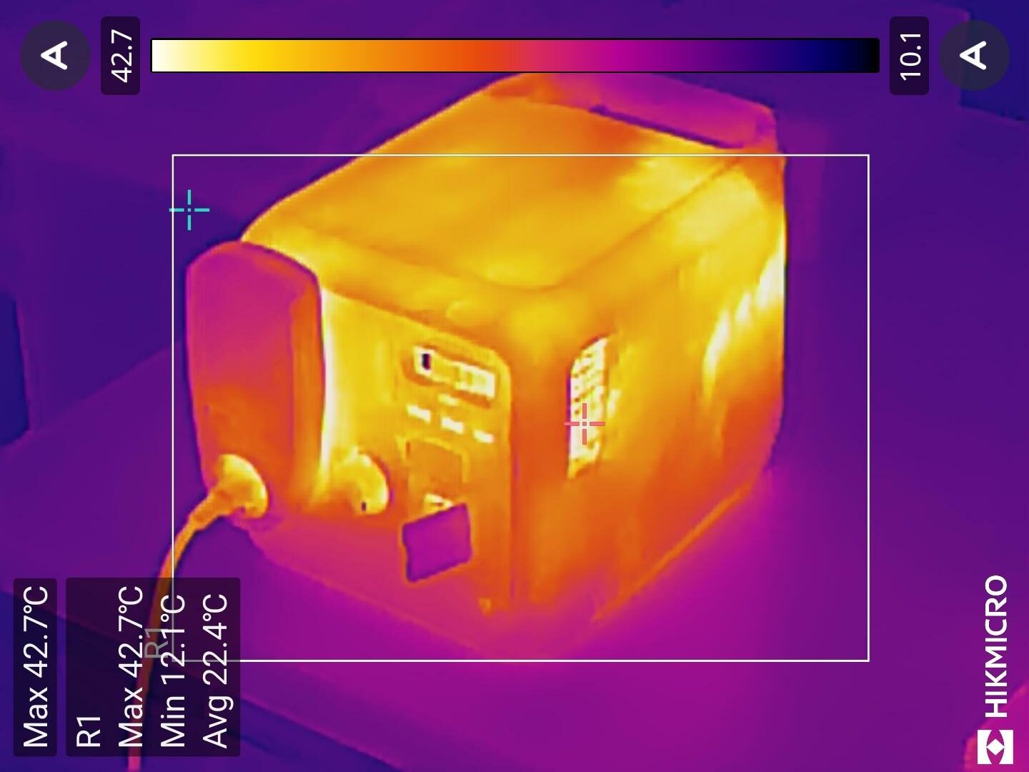 Um eine möglichst hohe Temperaturentwicklung zu generieren, haben wir die Powerstation vollständig geladen und dann mit der maximalen Ausgangsleistung von 1.000W entladen. Kurz vor Erreichen der unteren Ladegrenze wurden die Aufnahmen mittels Wärmebildkamera angefertigt. Bei einer Raumtemperatur von 15°C wurden Oberflächentemperaturen von 25-35°C ermittelt. Lediglich an den Luftauslässen der Powerstation konnten Temperaturen von 40-42°C gemessen werden. Der interne Sensor der DJI Power 1000 Mini zeigte eine Temperatur von 32°C an. Trotz der geringen Geräuschentwicklung funktioniert das Kühlkonzept der DJI Power 1000 Mini und überzeugt mit vergleichsweise niedrigen Betriebstemperaturen.