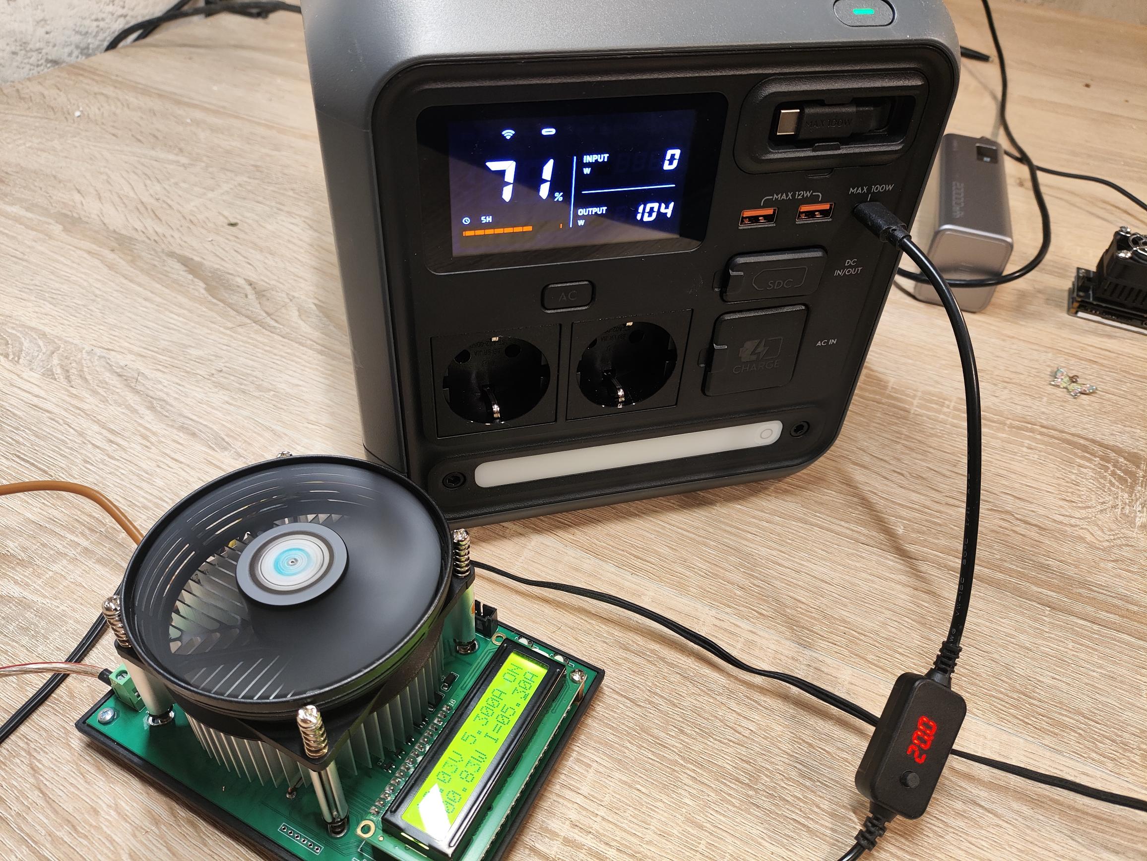 Die Steuerung der Lüfter erfolgt nicht rein temperaturgesteuert. Wird eine hohe Last angeschlossen, regeln die Lüfter innerhalb weniger Sekunden bis an die Maximaldrehzahl heran, obwohl die Powerstation noch vergleichsweise kalt ist. Bis zum mittleren Leistungsbereich 400-500W bleiben die Lüfter mit 40-45dB(B) angenehm leise. Im DC-Betrieb konnten wir bei Zimmertemperatur und 100W Leistungsentnahme keine Lüfteraktivität feststellen.