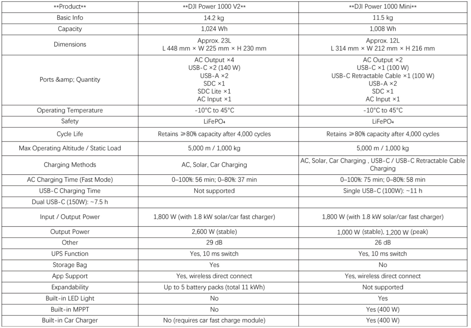 Das herausragendste Merkmal der DJI Power 1000 Mini sind ihre kompakten Abmessungen in Bezug auf die Kapazität von 1.008Wh. Im Vergleich zur DJI Power 1000 V2 ist die Mini 14 Zentimeter kürzer und zugleich auch etwas schmaler und flacher geworden. Weiterhin wurde die DJI Power 1000 Mini mit Features wie USB-Ladung und einem integrierten 400W MPPT-Laderegler aufgewertet. Zusätzlich soll die LiFePO4-Powerstation sogar bei Temperaturen von -10°C geladen werden können.