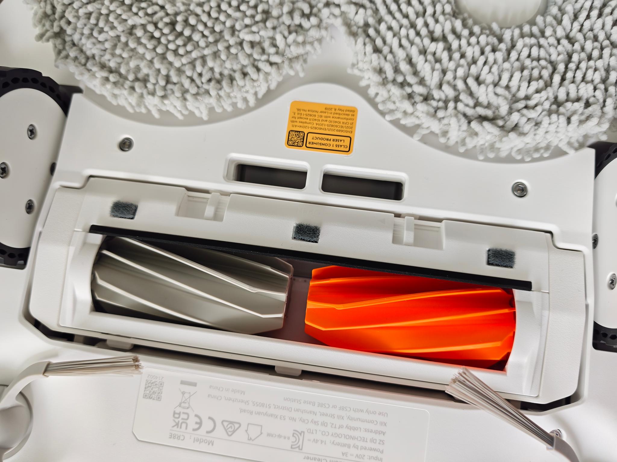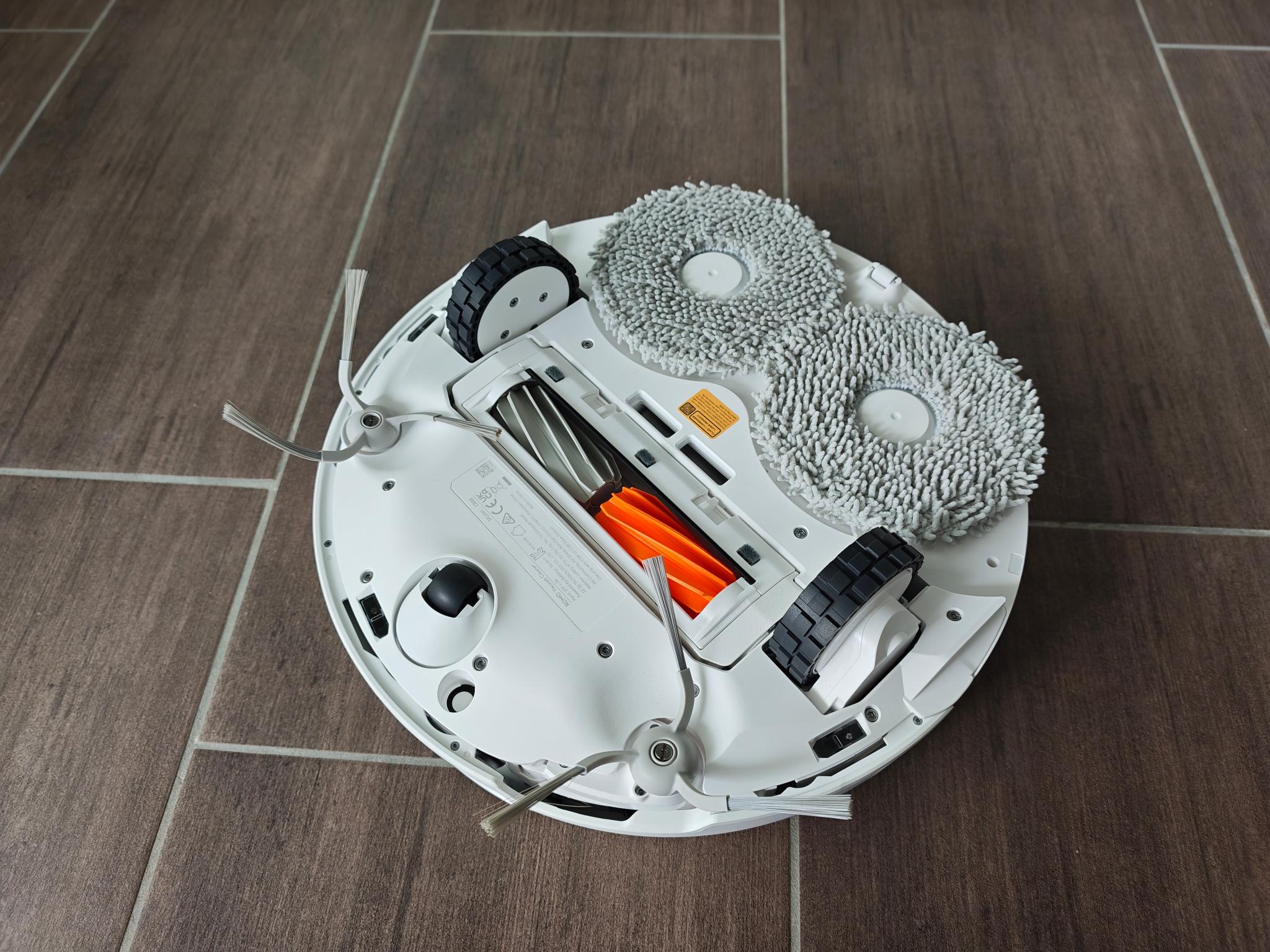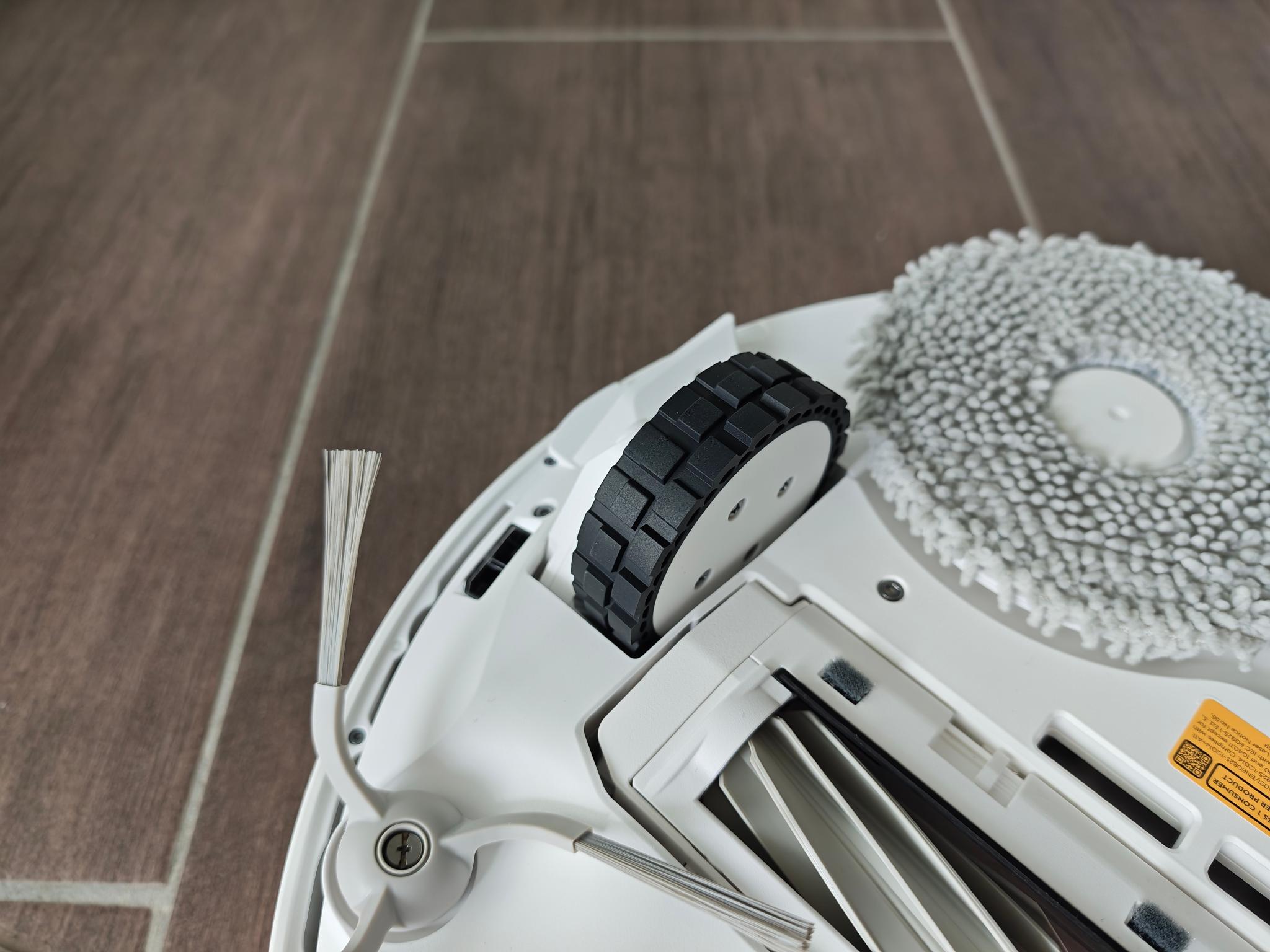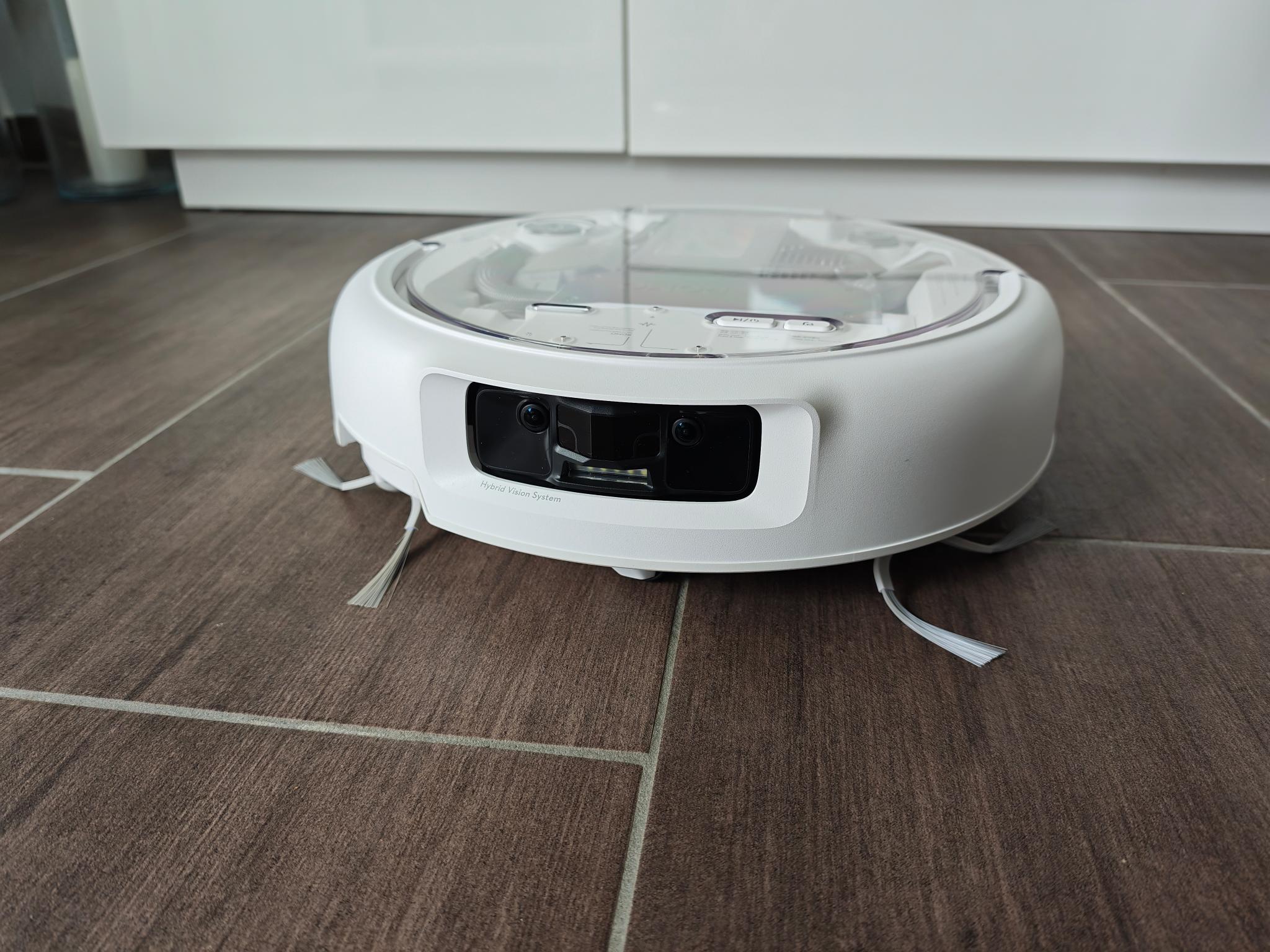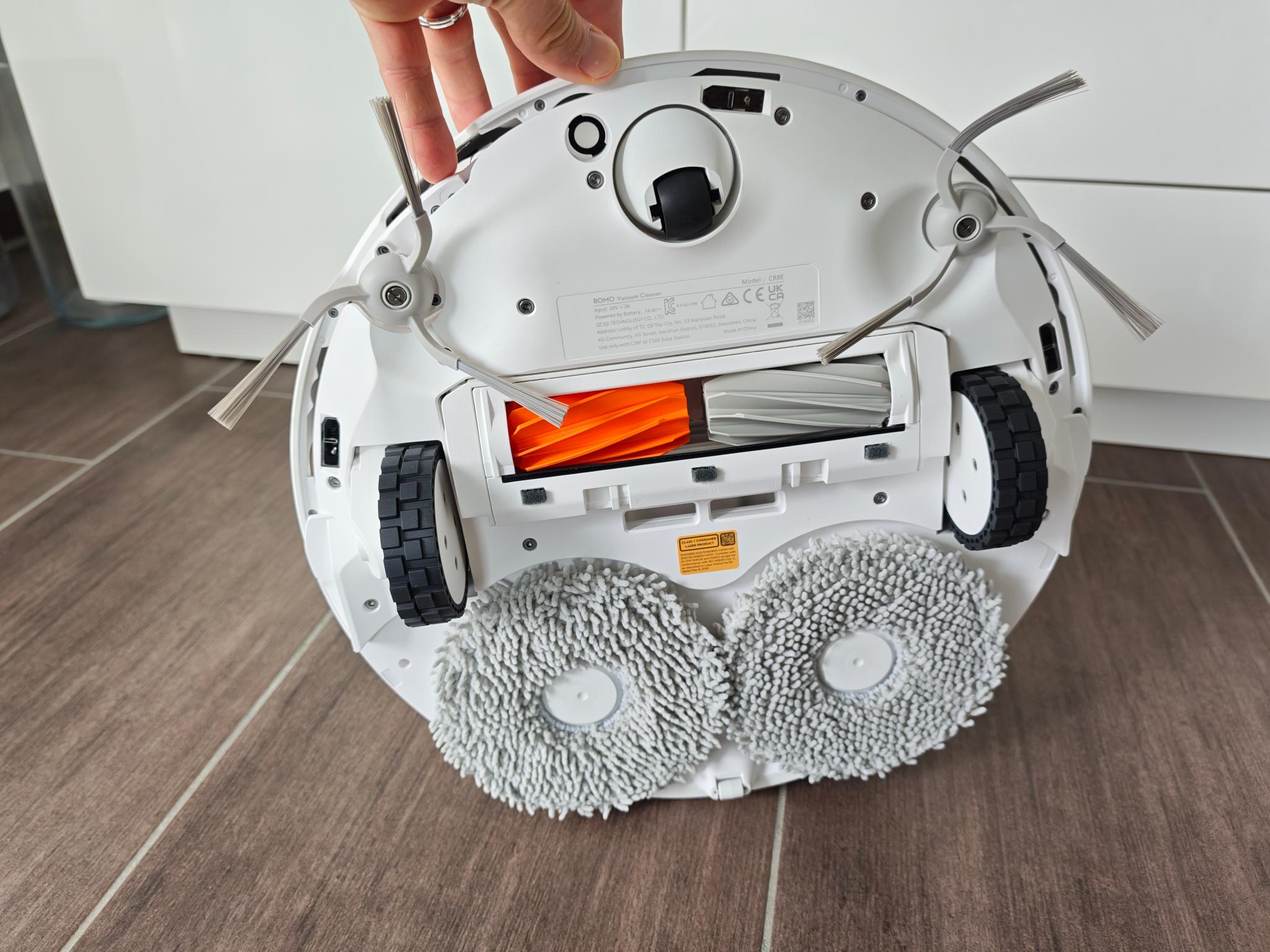 Dass der DJI Romo P etwas höher als die Konkurrenten ist, solltet ihr individuell bei euren Möbeln zu Hause bedenken. Der DJI Romo P setzt auf eine bekannte Stollenbereifung, hat aber keine besondere Steigfähigkeit zu bieten. 2cm sind das Höchste der Gefühle. Ansonsten sind rundherum Sensoren und vorn die Kamera zur Navigation angebracht, einen Laser gibt es hingegen nicht. Zwei Seitenbürsten gelten durchaus auch als Besonderheit; sie bewegen den Schmutz in Richtung des Saugschlunds, der eine zweigeteilte Bürste besitzt. Vorinstalliert ist eine Vollgummiversion, aber im Lieferumfang liegt noch eine Version mit Borsten bei. Ein Wischpad und eine Seitenbürste sind jeweils ausfahrbar und natürlich können beide Pads auch angehoben werden. Was jedoch nicht geht, ist das Ablegen der Wischpads in der Station, was gerade bei der Teppichreinigung für Probleme sorgt. Aber dazu später mehr. Den Staubbehälter (260ml) mit HEPA-Filter zieht man übrigens hinten aus dem Roboter heraus. Der Wassertank (164ml) innerhalb des Saugers ist hingegen fest verbaut.