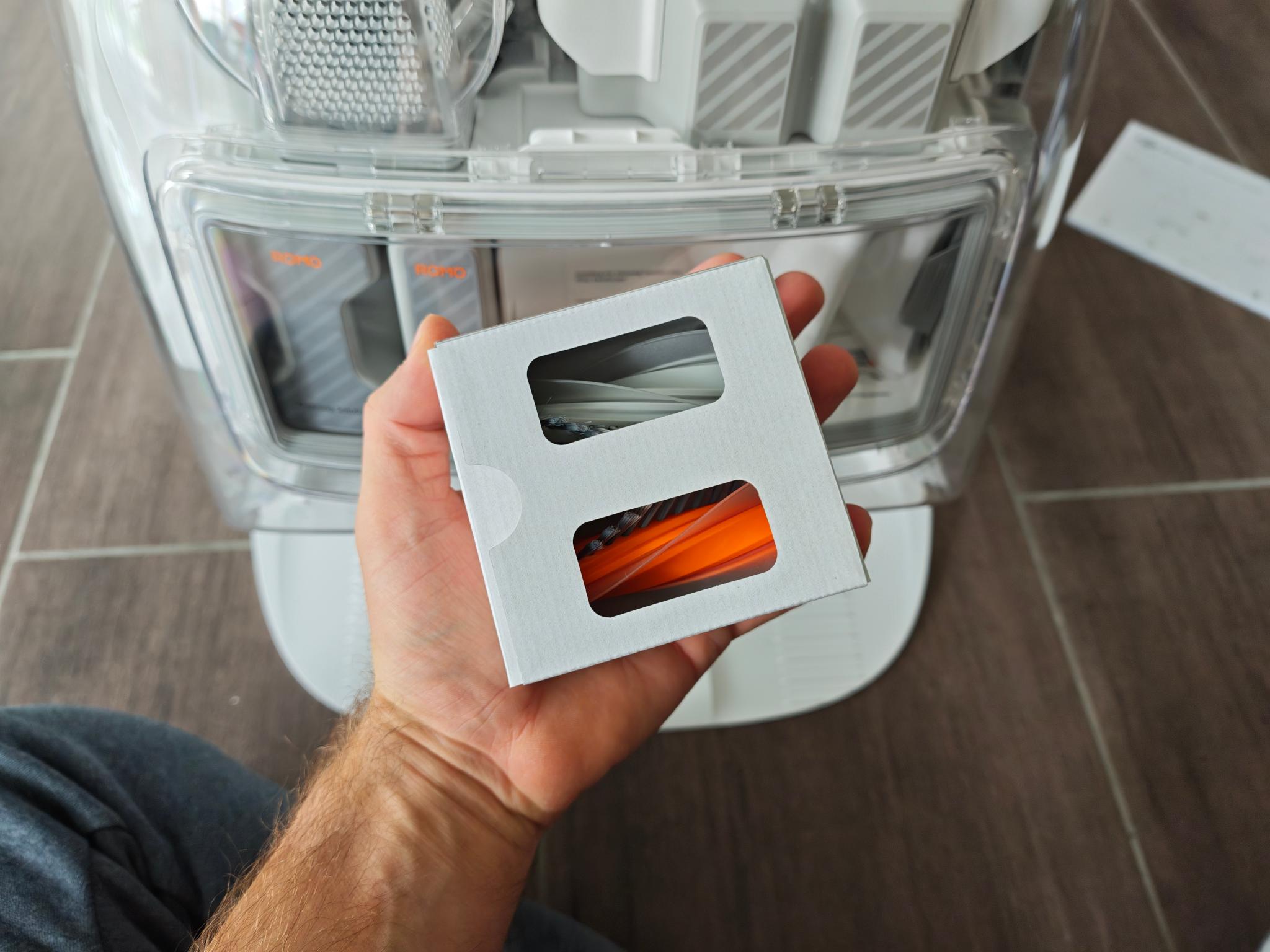 DJI macht der Transparenz von Nothing im wahrsten Sinne alle Ehre: Getreu dem Motto ‚Weniger ist mehr‘ finden sich im Karton ausschließlich eine Bedienungsanleitung und die zweigeteilte Hauptbürste. Der Sauger selbst, die Servicestation, zwei Reinigungsmittelkartuschen und ein Staubbeutel sind auch noch mit dabei. Der Staubbeutel ist vorinstalliert und die beiden Kartuschen müssen eingesteckt werden. Verschleißteile gibt es aktuell beim Hersteller zu saftigen Preisen, aber auch der Drittanbietermarkt sollte bald in Gang kommen. Dann gibt es wahrscheinlich auch alle Verschleißteile deutlich günstiger.