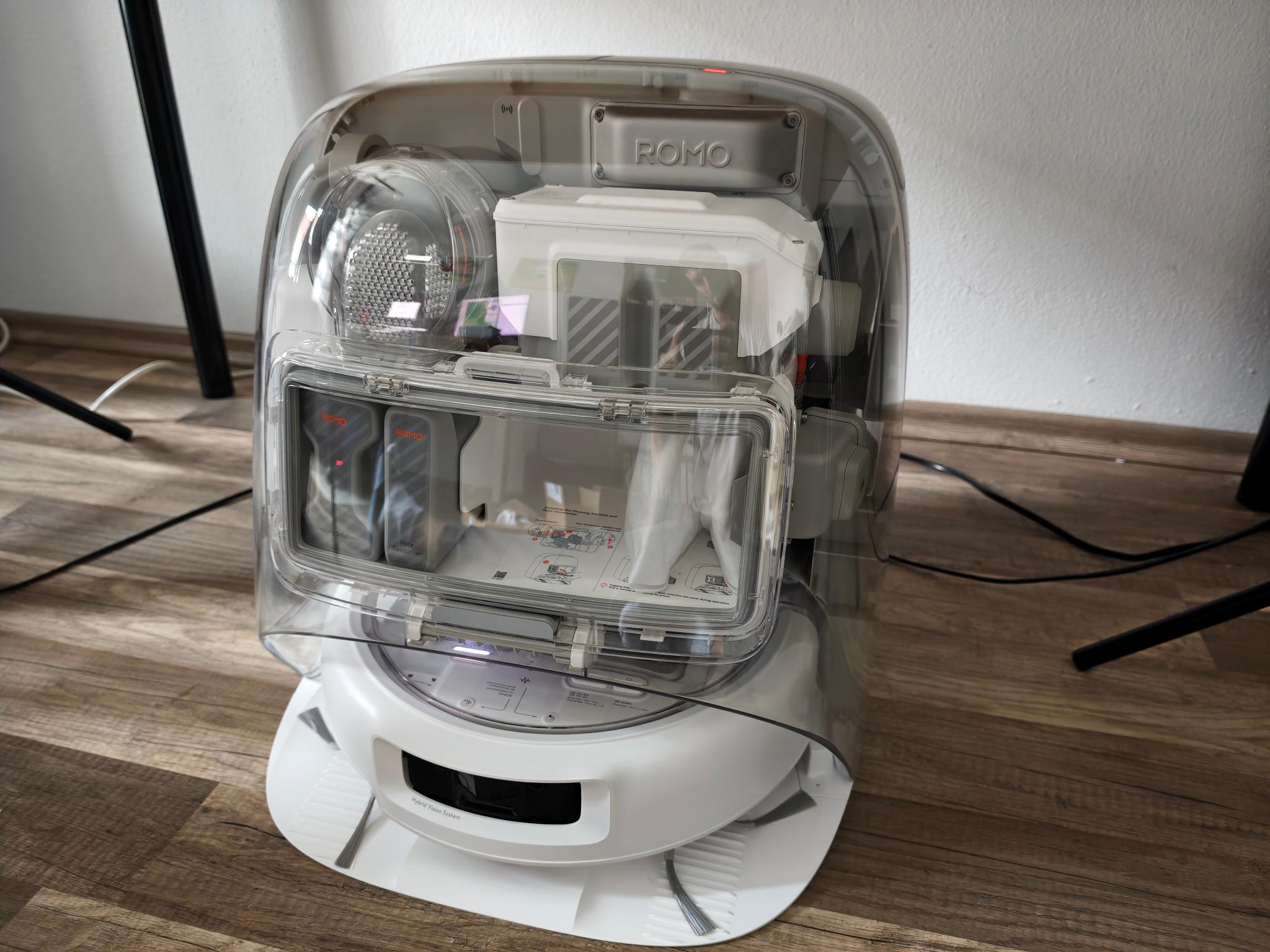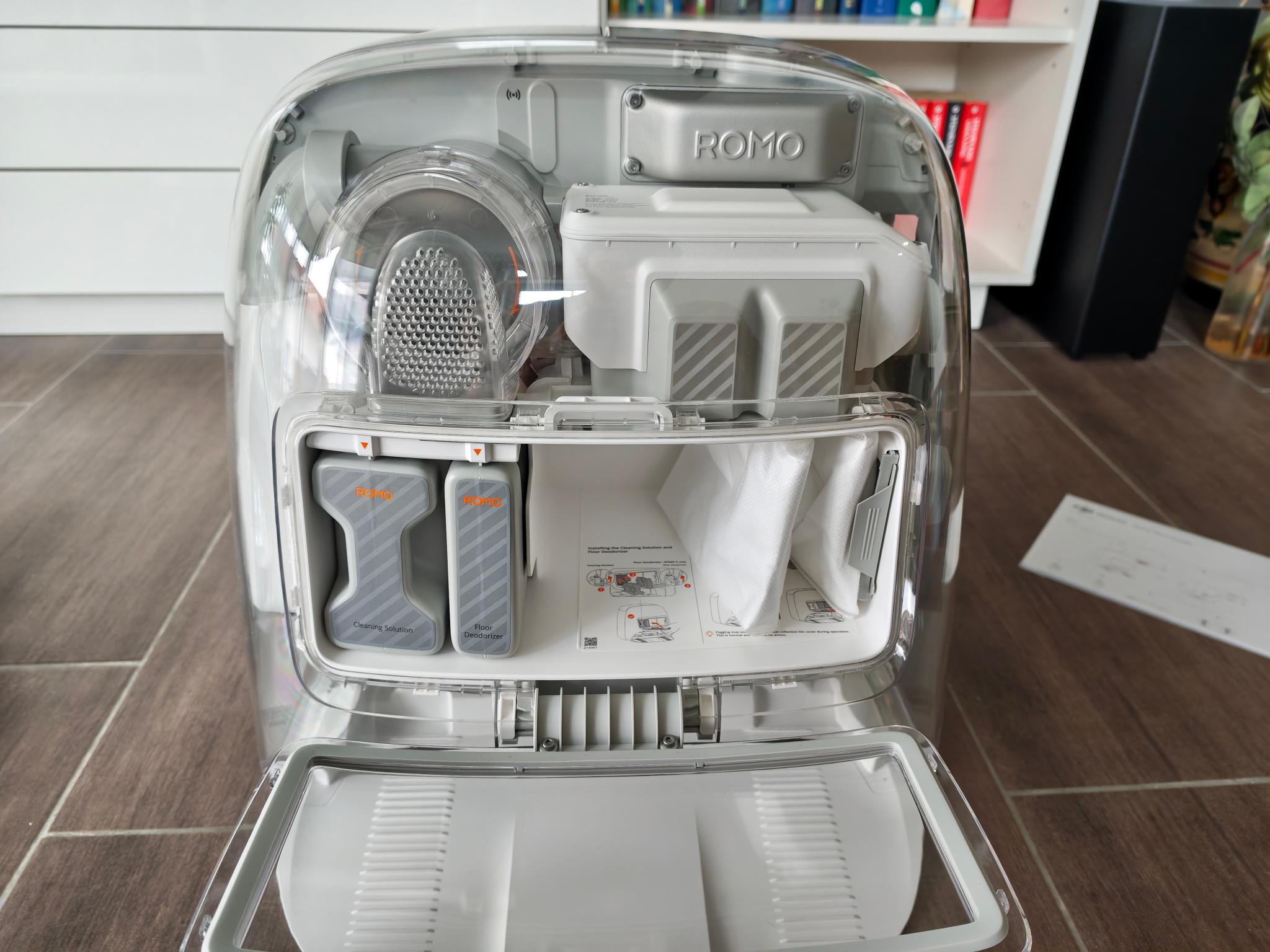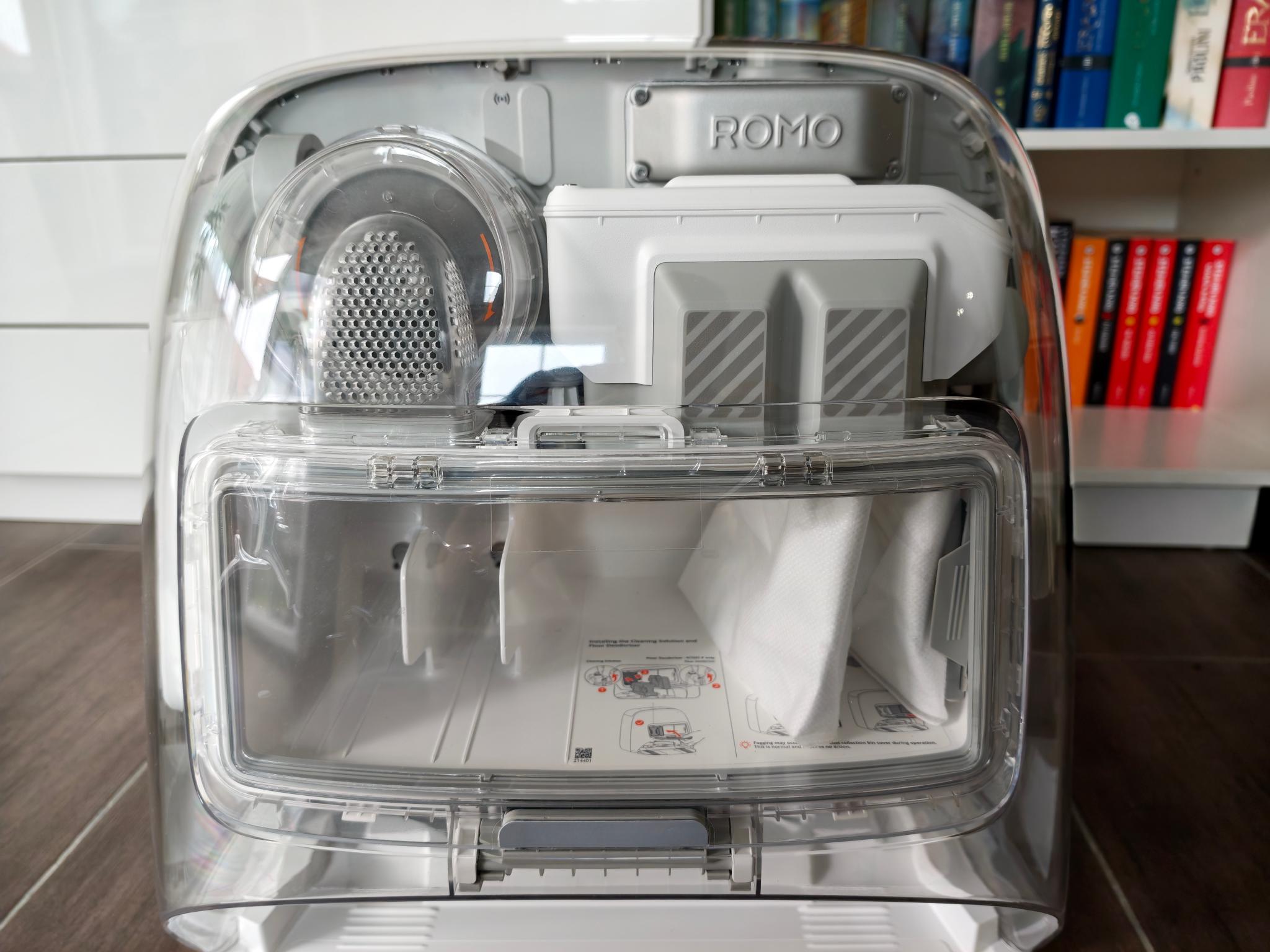 Die Servicestation (45,3 x 42,5 x 44 cm) ermöglicht wie gehabt das tagelange Arbeiten des Saugroboters ohne manuelles Eingreifen. Einzig Frischwasser muss nach einigen Reinigungsvorgängen nachgefüllt und Schmutzwasser entsorgt werden. Die Station ist ebenso wie der Saugroboter beim Romo P komplett im transparenten Design gefertigt. Auch das sieht in meinen Augen wieder richtig gut aus. Zudem hat die Station eine eigene Taste zur Steuerung des Saugers. Es gibt nicht nur ein proprietäres Fach für Reinigungsmittel, sondern auch für Desinfektion beziehungsweise Duftstoff. Beides wird automatisch dosiert, muss aber eben komplett nachgekauft und kann nicht einfach aufgefüllt werden, wie wir das mittlerweile von vielen anderen Herstellern kennen. Der Staubbeutel ist ebenfalls zu sehen und in der Station integriert.