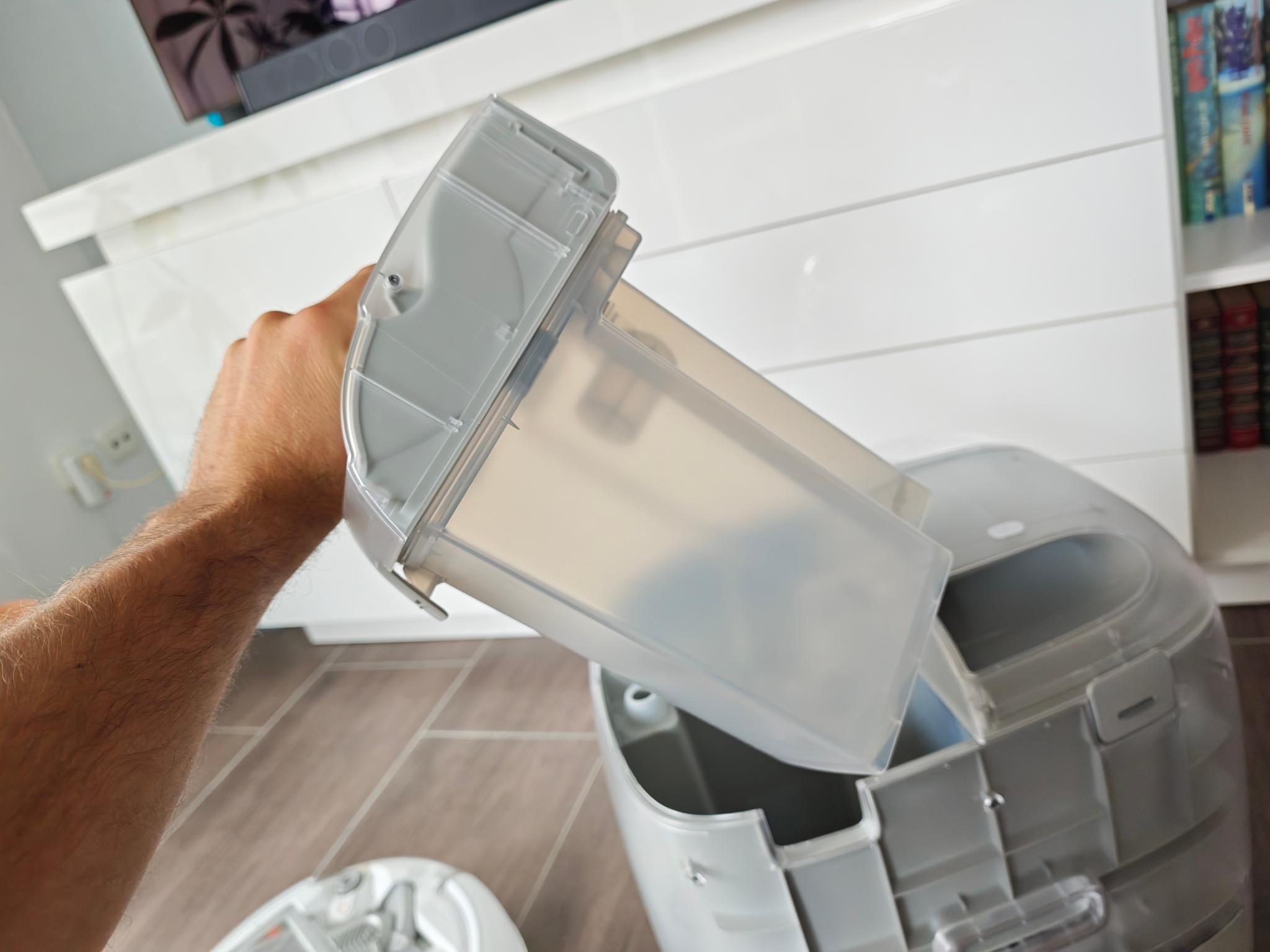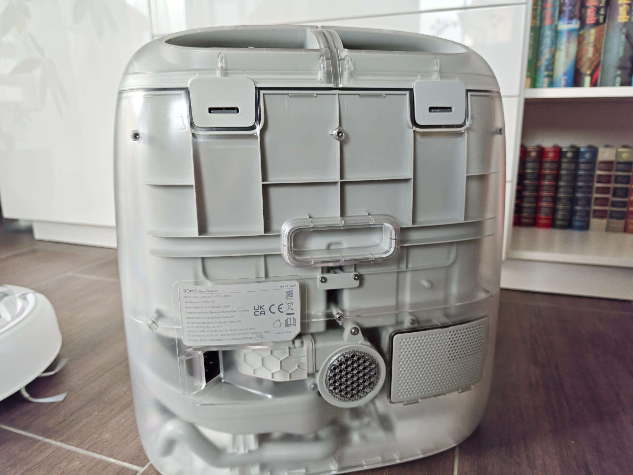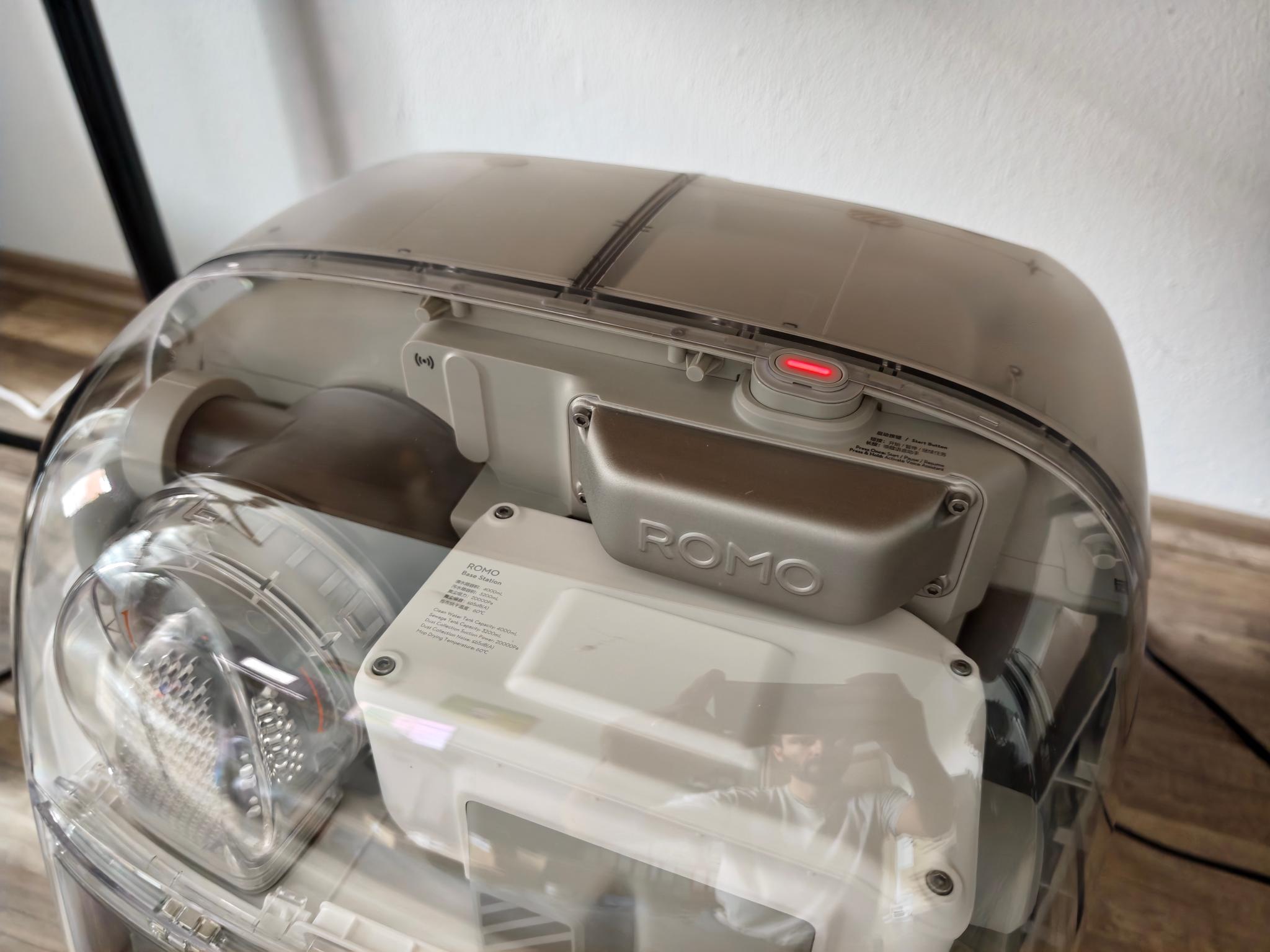 Die Servicestation (45,3 x 42,5 x 44 cm) ermöglicht wie gehabt das tagelange Arbeiten des Saugroboters ohne manuelles Eingreifen. Einzig Frischwasser muss nach einigen Reinigungsvorgängen nachgefüllt und Schmutzwasser entsorgt werden. Die Station ist ebenso wie der Saugroboter beim Romo P komplett im transparenten Design gefertigt. Auch das sieht in meinen Augen wieder richtig gut aus. Zudem hat die Station eine eigene Taste zur Steuerung des Saugers. Es gibt nicht nur ein proprietäres Fach für Reinigungsmittel, sondern auch für Desinfektion beziehungsweise Duftstoff. Beides wird automatisch dosiert, muss aber eben komplett nachgekauft und kann nicht einfach aufgefüllt werden, wie wir das mittlerweile von vielen anderen Herstellern kennen. Der Staubbeutel ist ebenfalls zu sehen und in der Station integriert.
