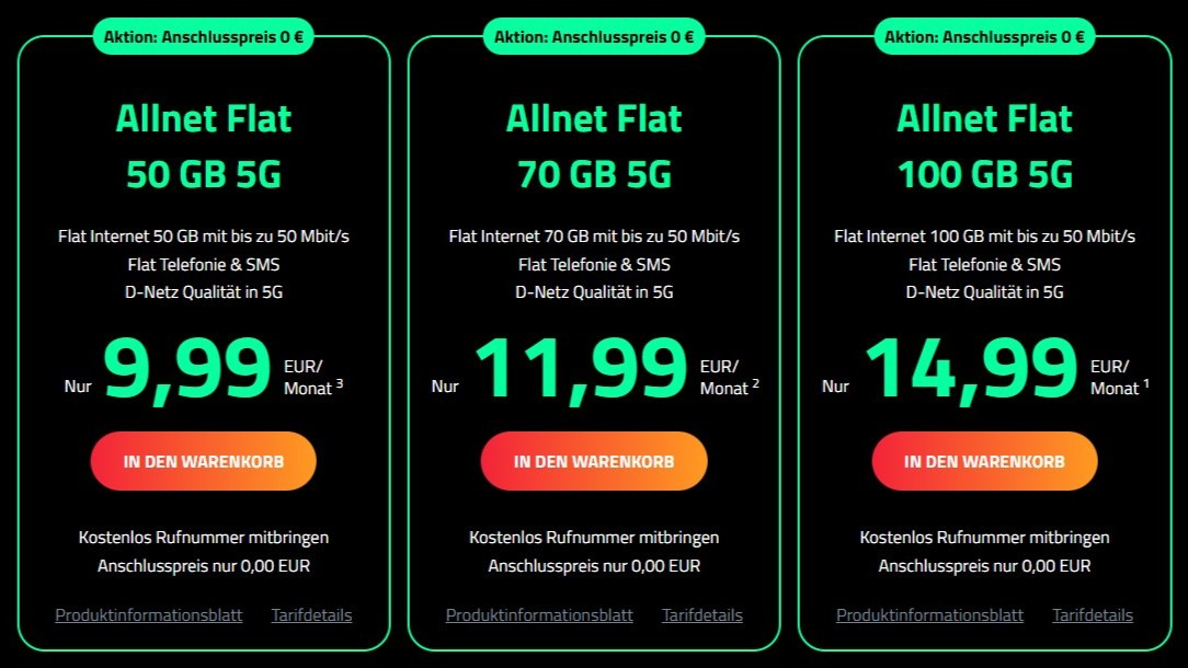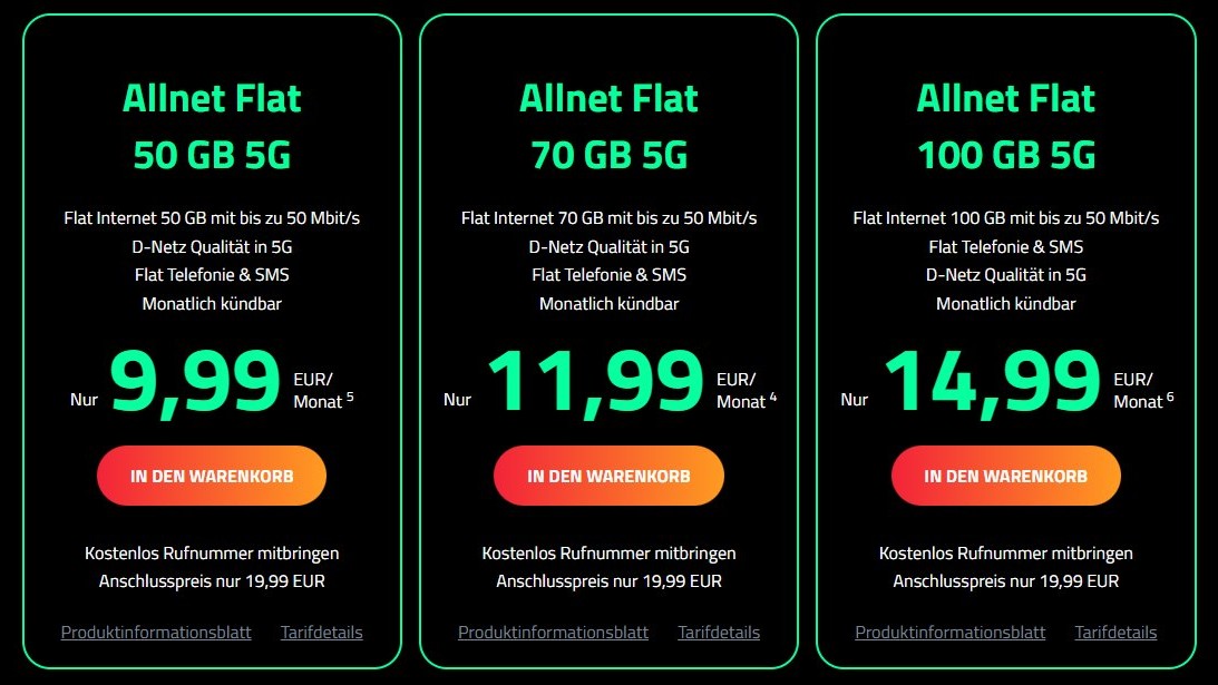 Die Wahl hat man zwischen 50GB, 70GB oder 100GB Datenvolumen und der monatlichen kündbaren Variante oder mit zwei Jahren Vertragslaufzeit. Enthalten sind stets eine Allnet-Flatrate mit unbegrenzten Minuten zum Telefonieren und zum SMS‑Schreiben.
