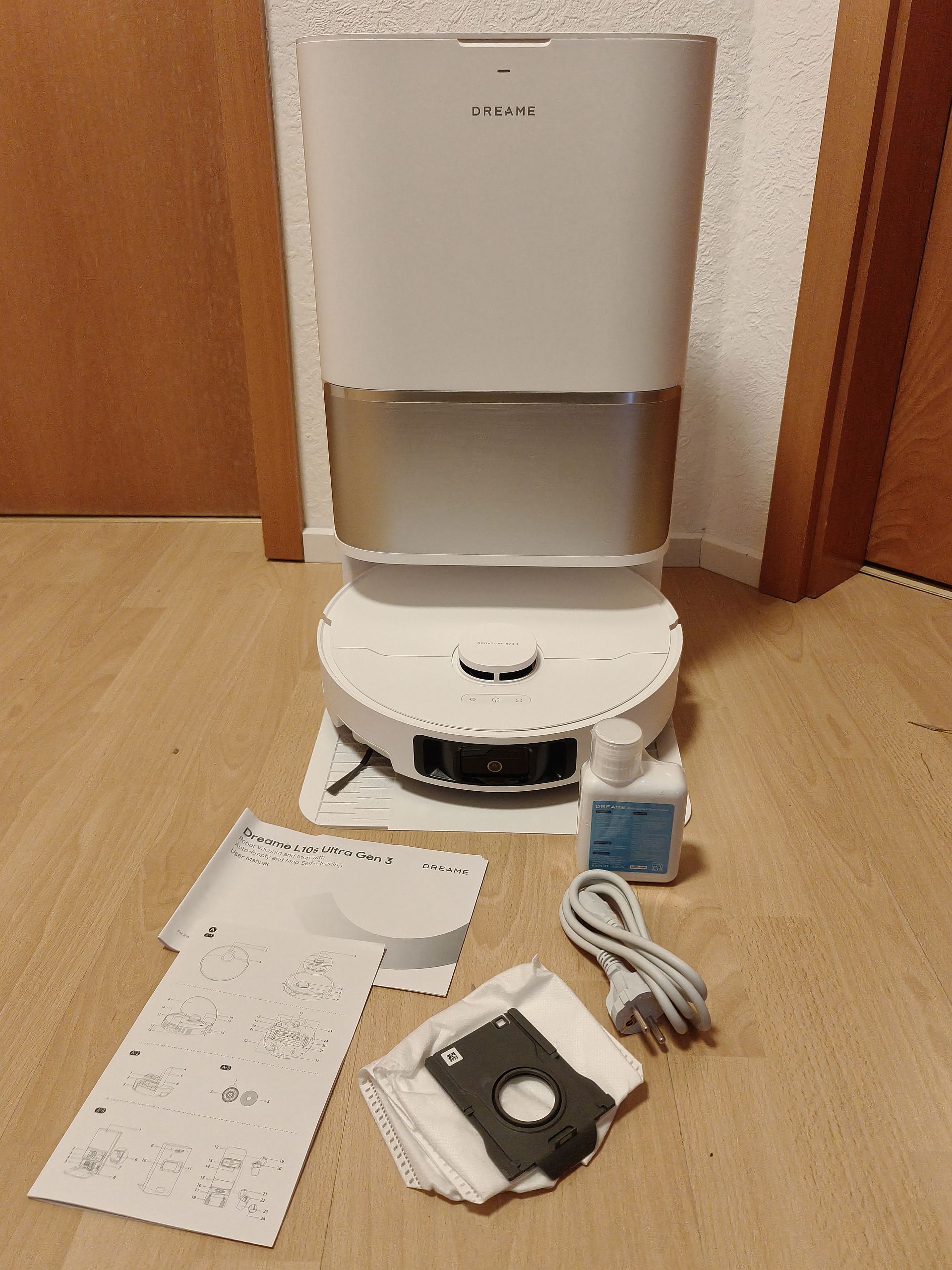 Der Dreame L10s Ultra Gen3 kommt transportsicher verpackt bei euch an. Für die erste Inbetriebnahme ist nach dem Auspacken nicht viel zu tun. Ihr müsst lediglich das Stromkabel anschließen, die Reinigungsflüssigkeit und das Frischwasser einfüllen, die Wischerpads und den Staubsaugerbeutel einsetzen, die App herunterladen und den Roboter verbinden.