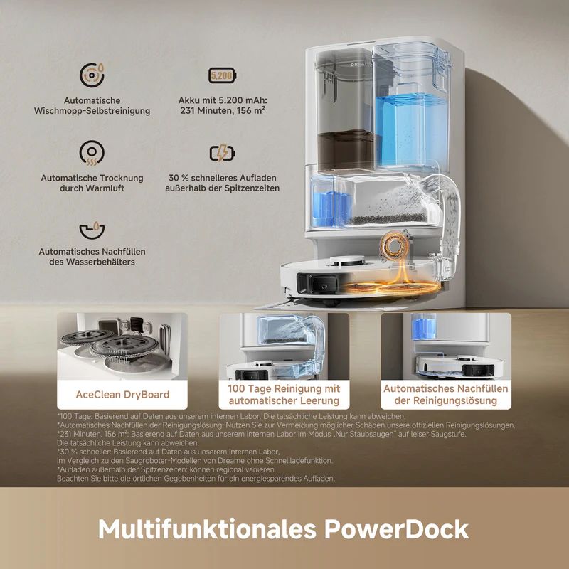- Servicestation (Absaugstation, Frisch- und Abwasser, Reinigung der Wischerpads)