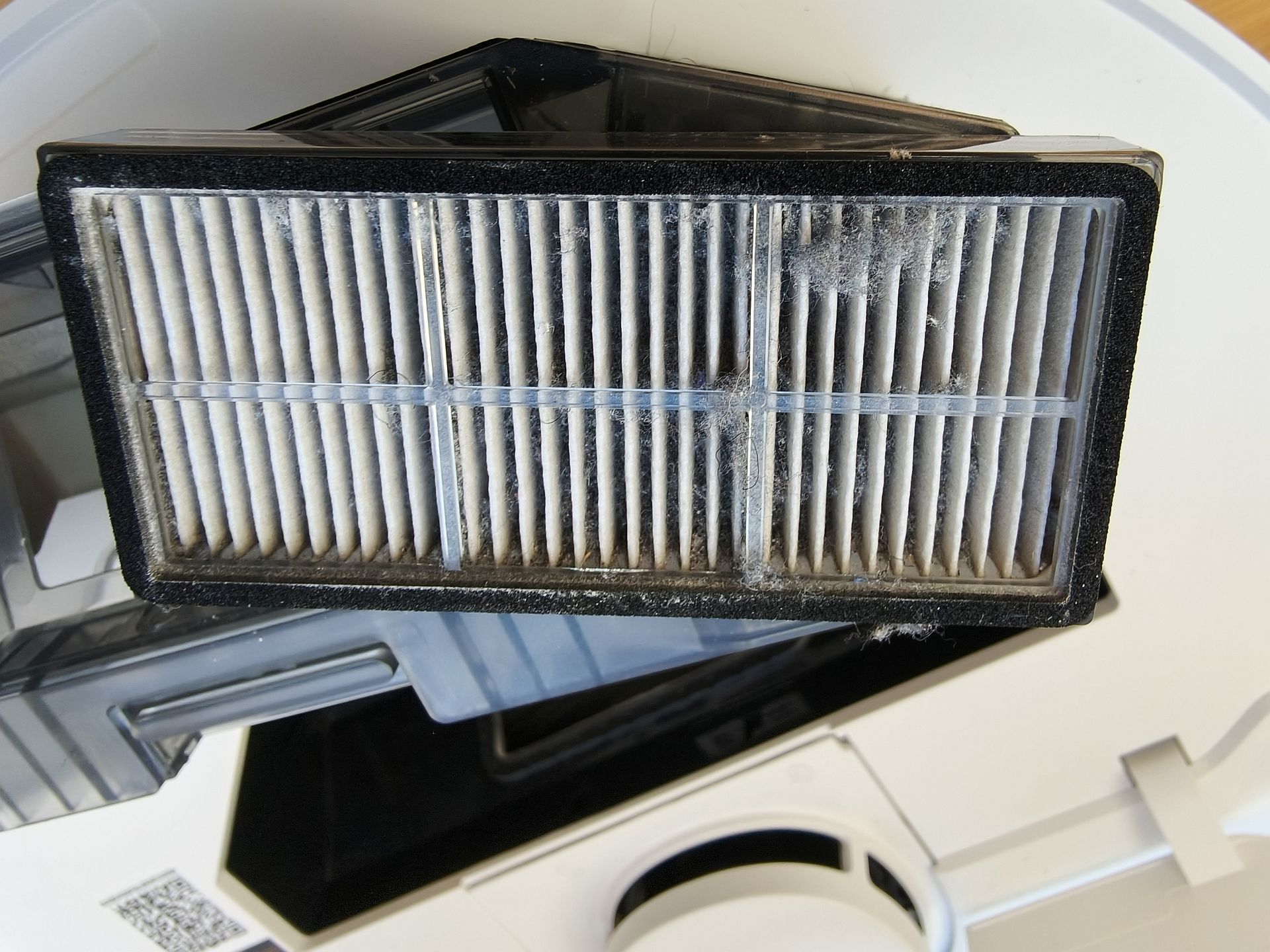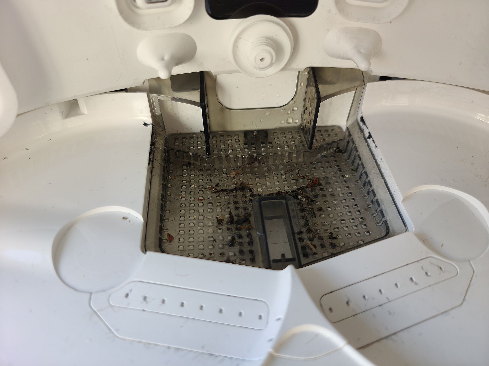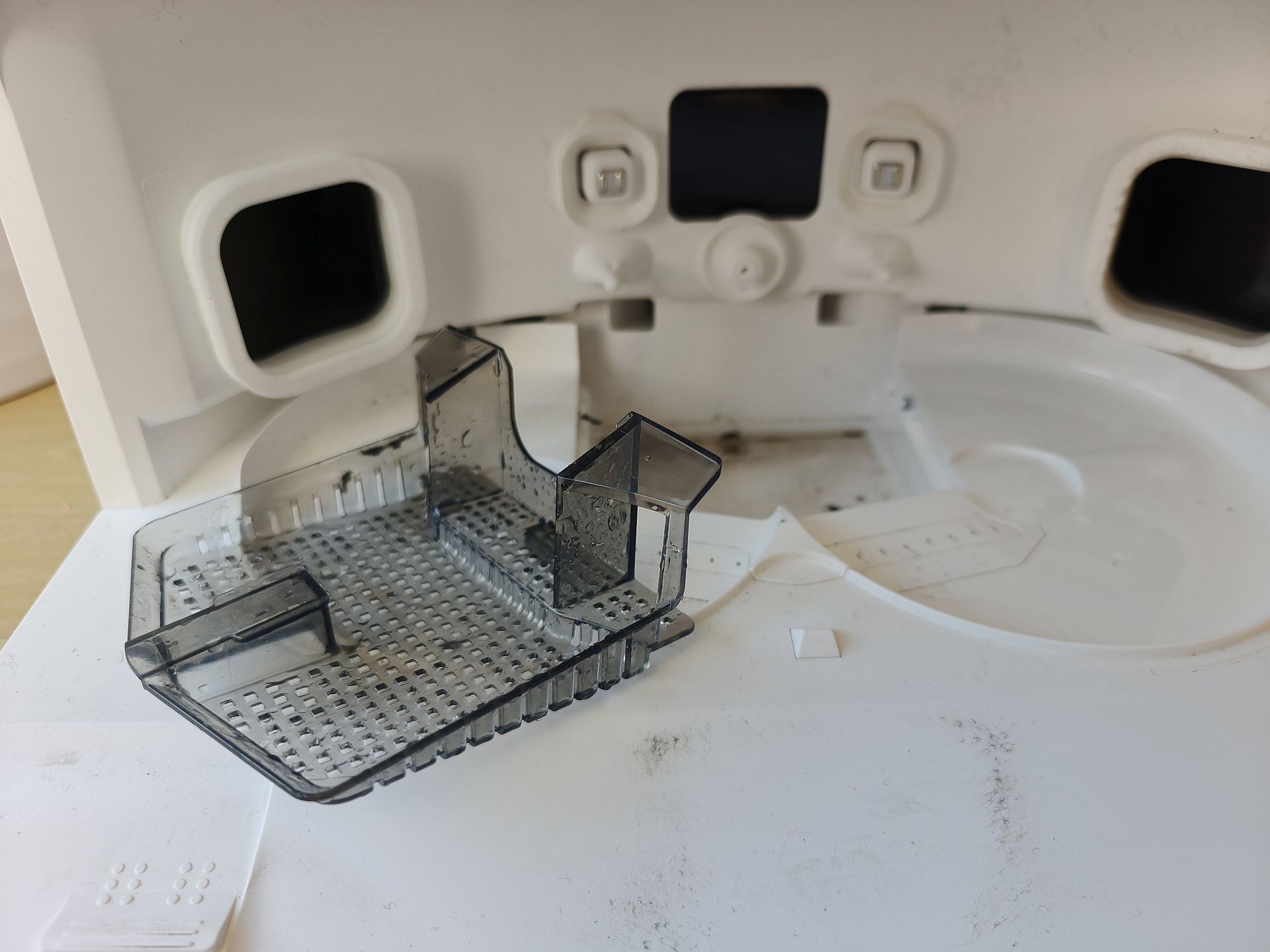Die Waschstation für die Wischmops ist zur Reinigung gut zugänglich. Das grobe Siebgitter könnt ihr einfach nach oben entnehmen. Bei mir war dies nach der Wischfahrt über meinen Balkon dringend notwendig.