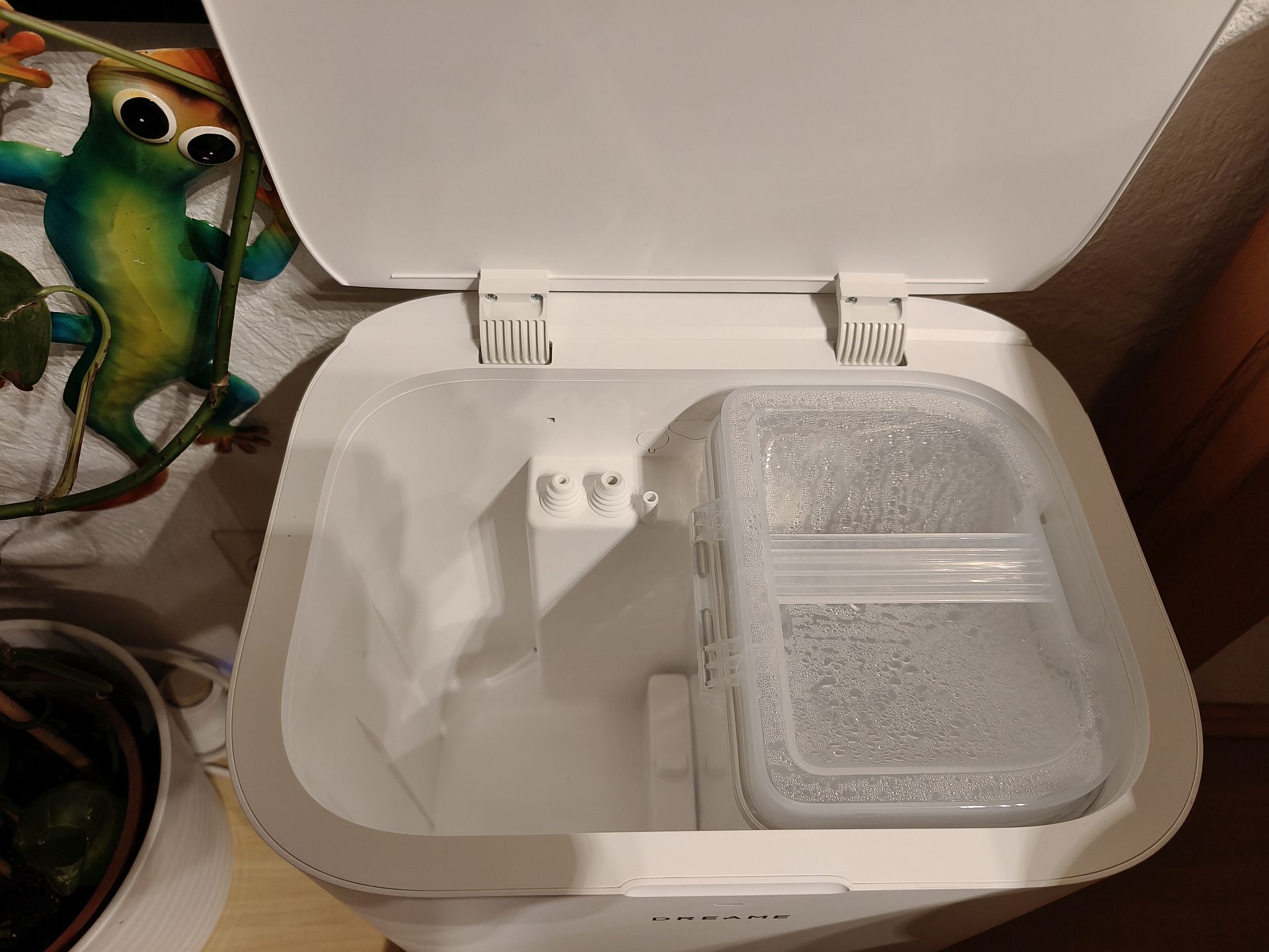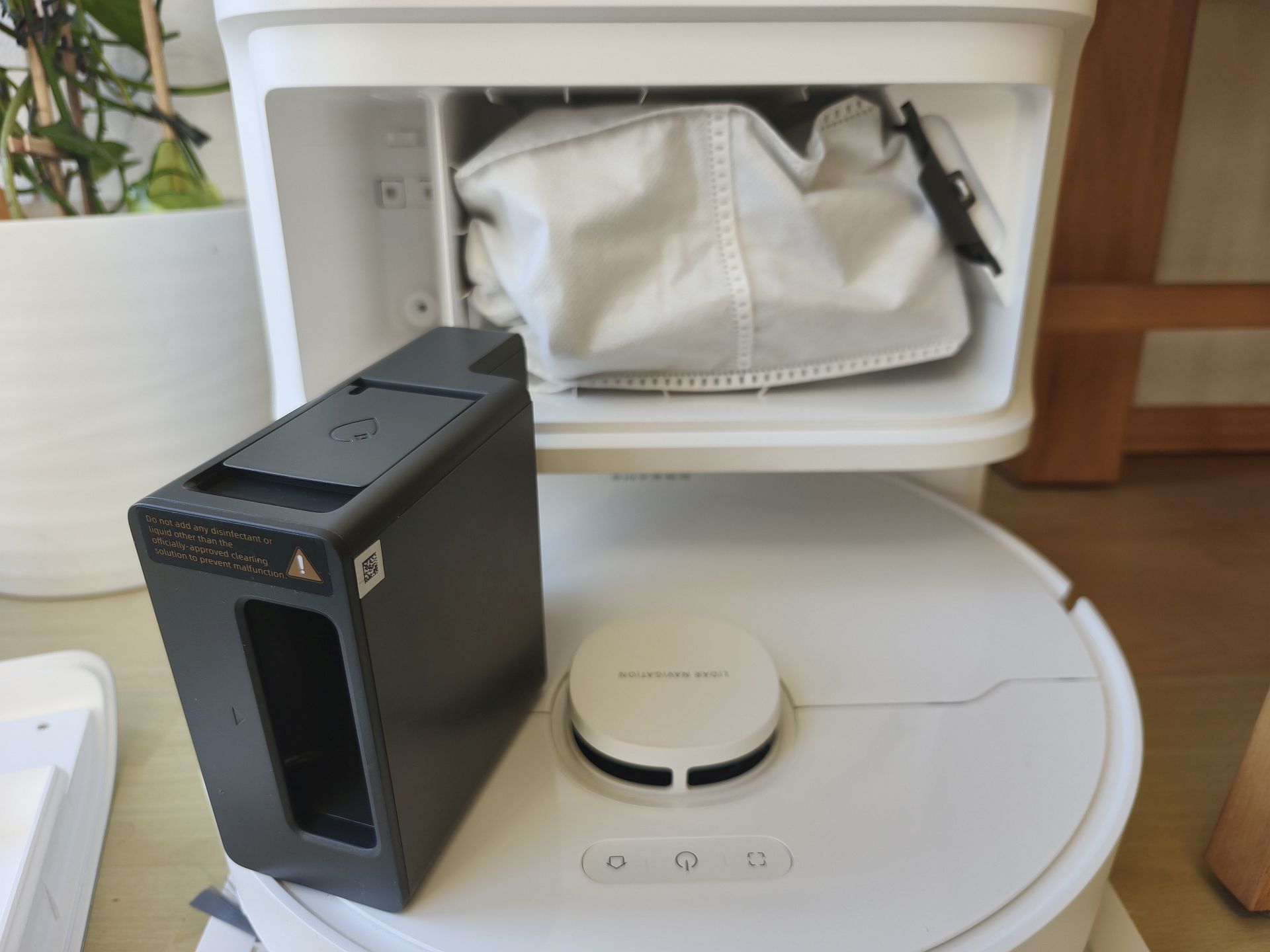 Die Servicestation des Dreame ist mit abgerundeter Form zeitlos gestaltet und im Inneren sind die Behälter für Frisch- und Schmutzwasser gut zugänglich. Ebenso gut erreichbar ist der Tank mit der Reinigungsflüssigkeit hinter der silbernen Frontplatte, die ihr einfach nach vorn abzieht. Auch der Staubsaugerbeutel hinter der Platte ist rasch gewechselt.