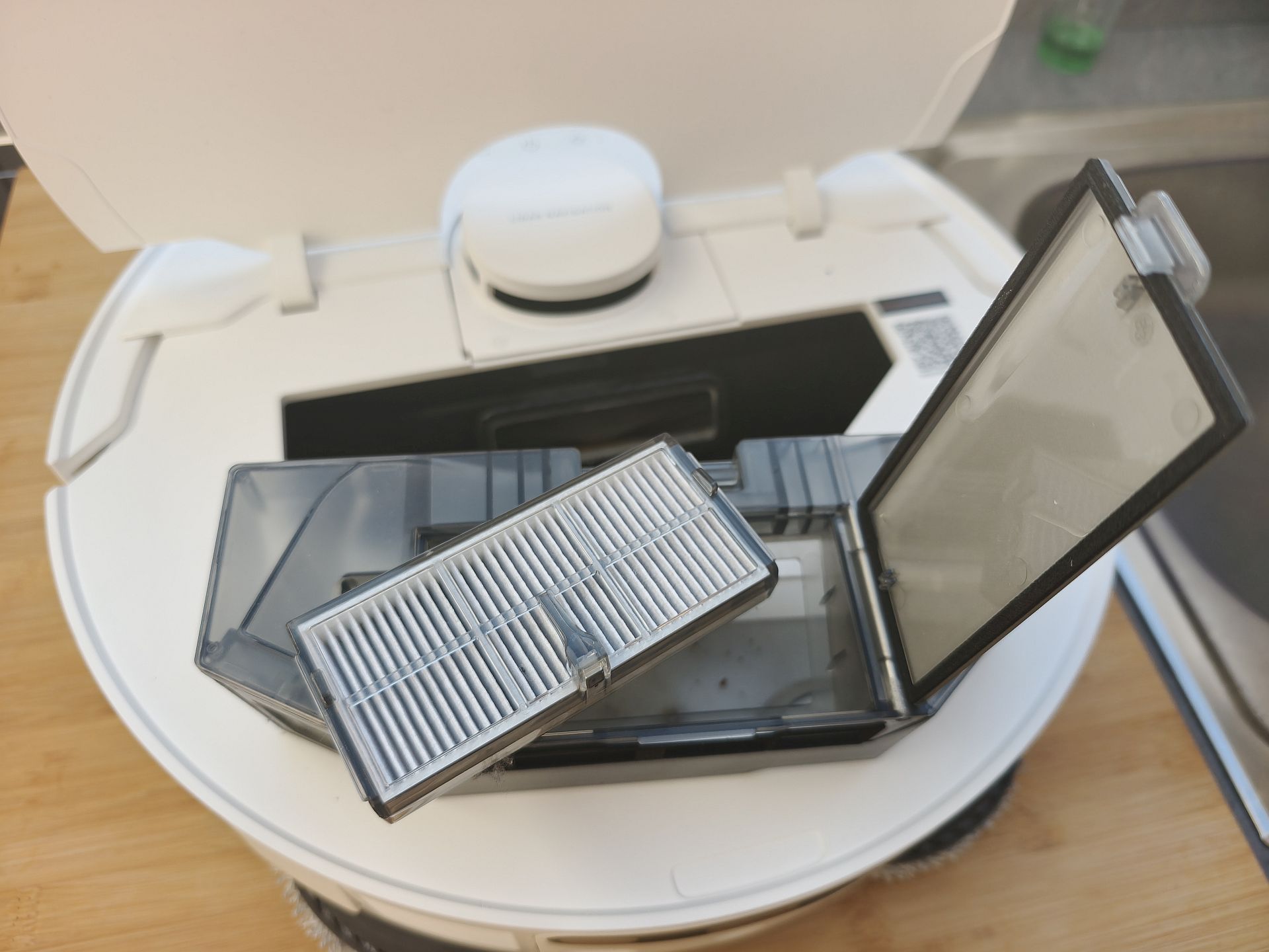 An der Oberseite des Dreame L10s Ultra Gen3 befindet sich der Staubsaugerbehälter unter einer Klappe. Diesen entnehmt ihr mit einem Handgriff. Dann kommt ihr gut an den Filter heran, den ihr gelegentlich ausklopfen oder ersetzen solltet.