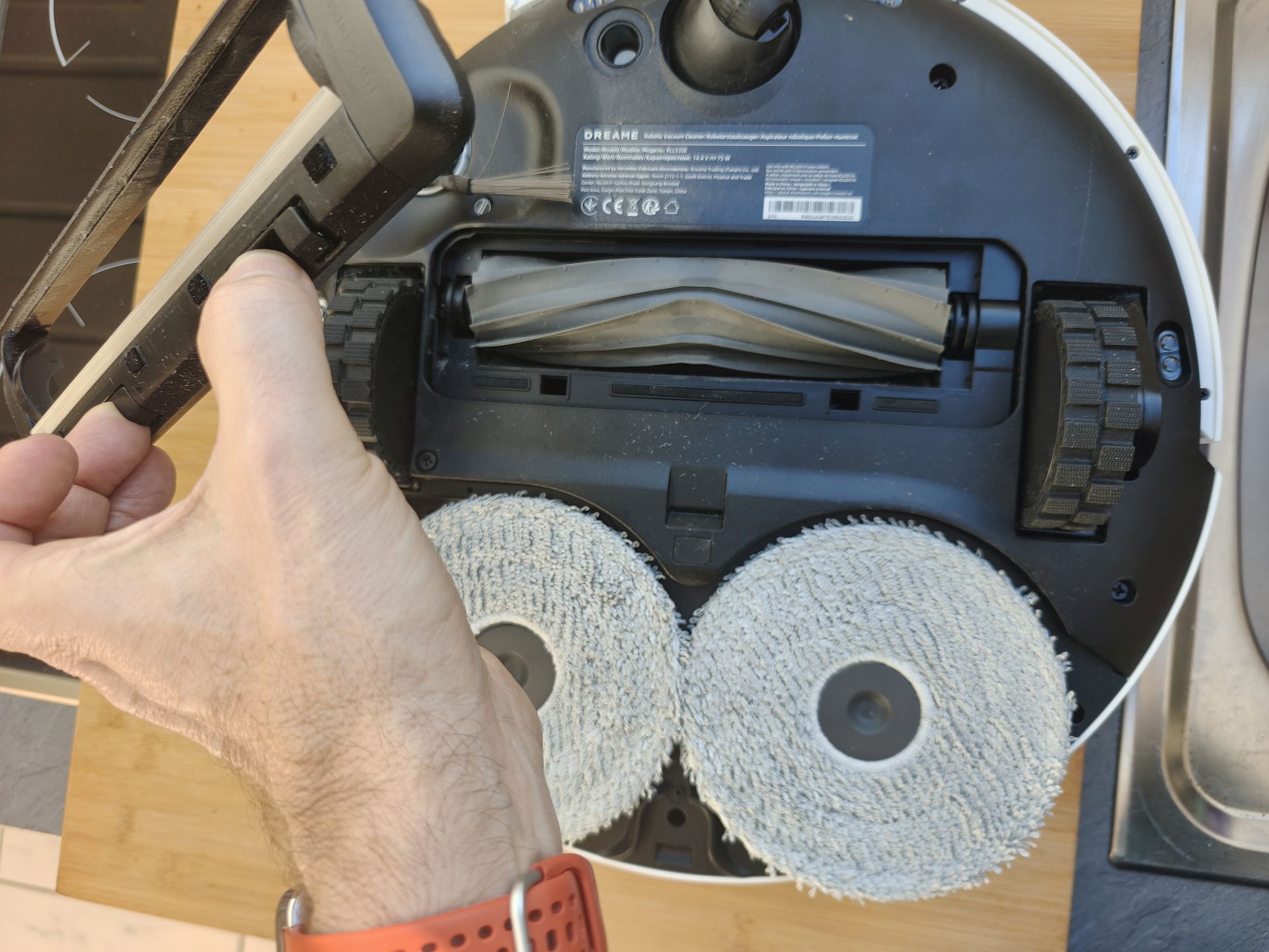 Ebenfalls an der Unterseite des Dreame L10s Ultra Gen3 solltet ihr nach Bedarf die Staubsaugerwalze und die Bürste reinigen. Die Walze lässt sich mit zwei Handgriffen zum Reinigen entfernen. Die Bürste könnt ihr mit einem kleinen Schraubendreher gut lösen, um beispielsweise Haare zu entfernen.
