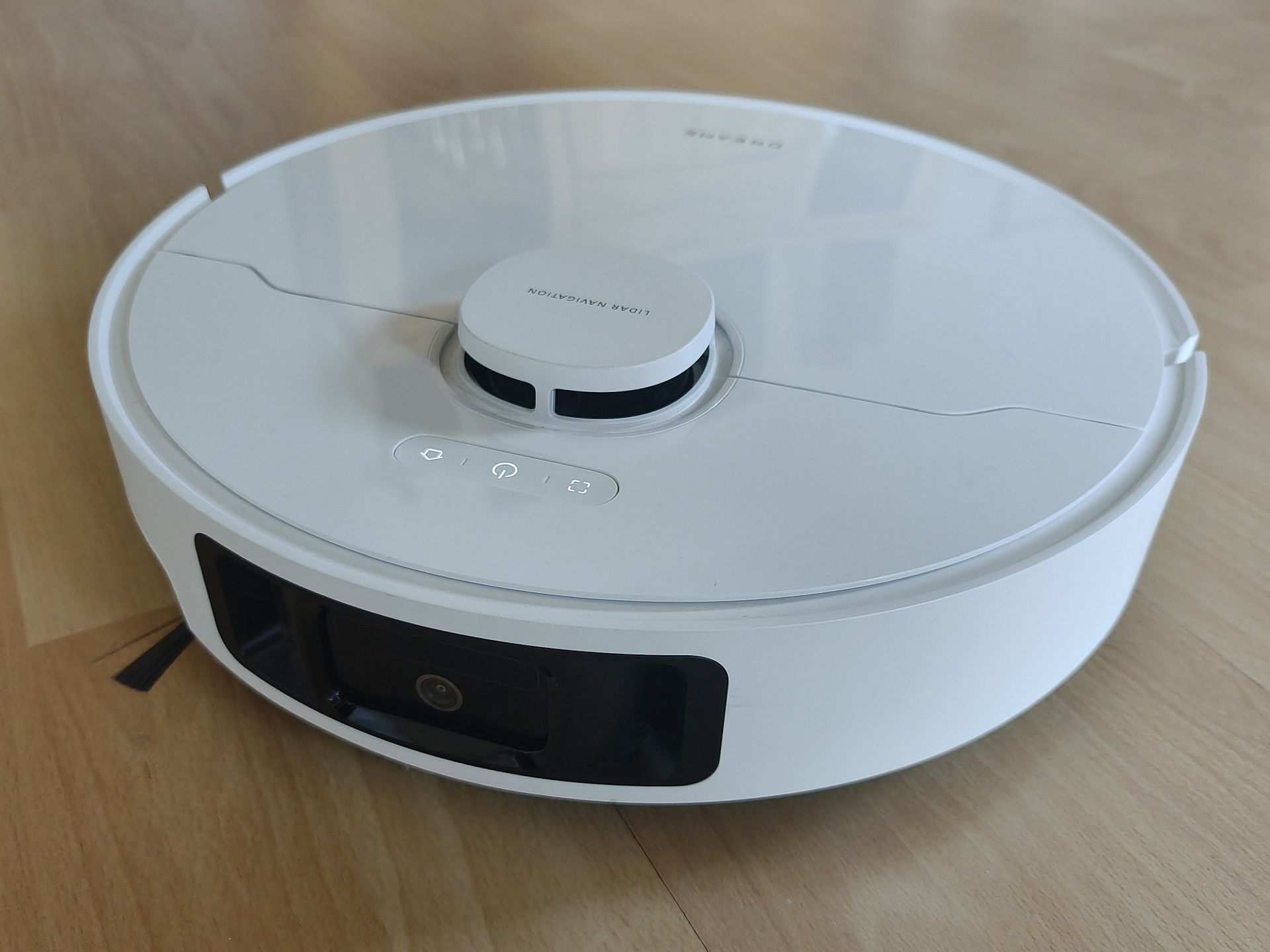Mit einem Durchmesser von 35cm und einer Höhe von 9,7cm liegt der Dreame L10s Ultra Gen3 gut im Durchschnitt. Das Gewicht von 4,1kg (Station: 8,2kg) entspricht ebenfalls dem Durchschnitt. Die weiße Oberfläche und der glänzende obere Teil lassen den Roboter elegant und schlicht aussehen. An der Oberseite befinden sich drei Tasten für Ein/Aus, Start/Stopp und Rückfahrt zur Servicestation. Auf der Oberseite sitzt der mittlerweile übliche LiDAR-Laserscanner, mit dem die Kartierung und Hinderniserkennung erfolgt. An der Unterseite verhindern optische Sensoren Treppenstürze und stoppen den Roboter rechtzeitig. Die seitliche, vordere Blende ist beweglich und über einen Tastschalter erkennt der Dreame L10s Ultra Gen3 Kollisionen.