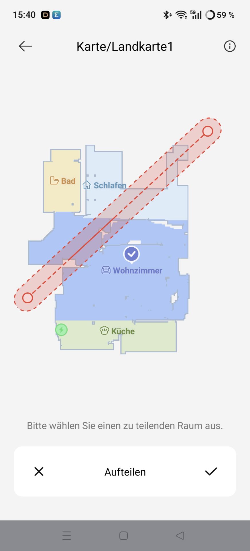 Die App lässt von den Funktionen keine Wünsche offen, ist übersichtlich und einfach zu bedienen. Nach der Installation und der Kartierung könnt ihr die Karte individuell anpassen. Bei mir wurden Schlafzimmer, Flur und Küche nicht erkannt und mit dem Wohnzimmer als ein Raum erstellt. Bei der Anpassung der Räume könnt ihr den aufzuteilenden Raum nur mit einer Linie aufteilen, die ihr dafür verschieben könnt. Das hat bei mir dazu geführt, dass ich keinen Raum korrekt aufteilen kann. Bei der Küche bleibt ein Stück vom Wohnzimmer dran. Auch meinen Flur kann ich vom Wohnzimmer nicht abtrennen, dafür würde ich zwei Linien benötigen. Das ist schade, aber vielleicht wird Dreame hier mit einem der nächsten Updates nachbessern.
