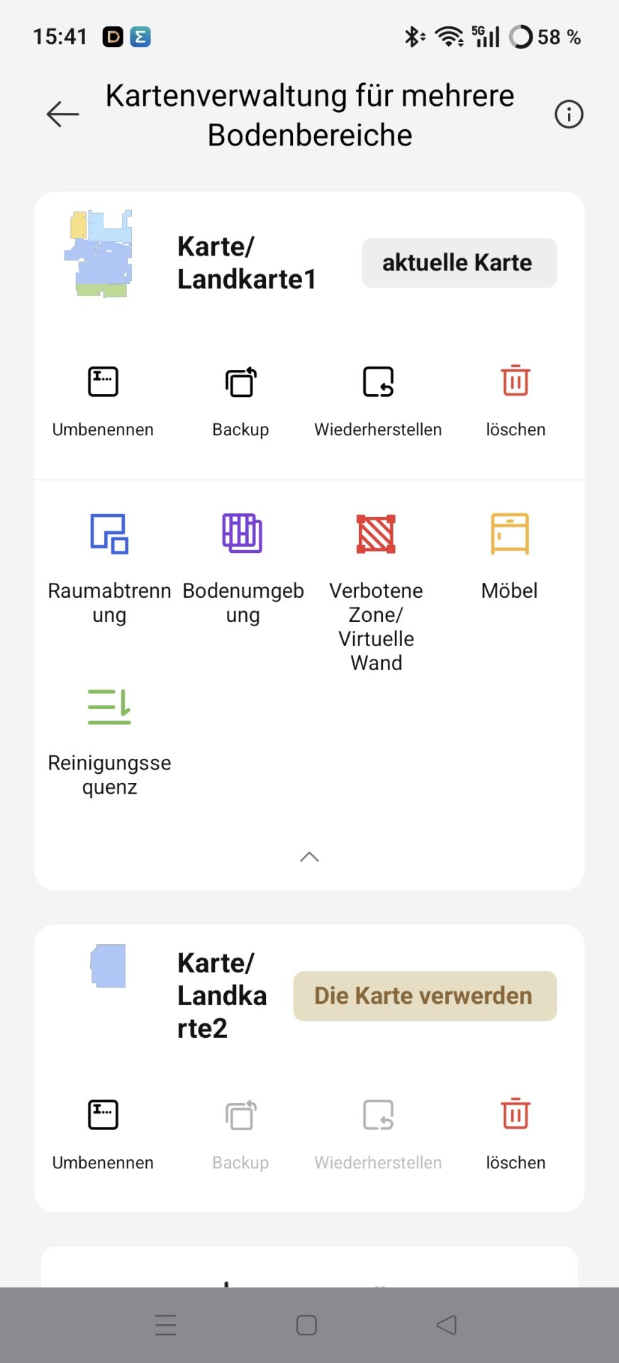 Das Kartenmenü ist einfach und übersichtlich gestaltet und auch an verschiedene Karten für mehrere Etagen ist gedacht worden. In meinem Fall gibt es zwar nur eine Etage, aber ich habe für den Balkon eine zweite Etage angelegt, um hier eine separate Karte zu haben. Für die Reinigung vom Balkon muss ich daher die entsprechende Karte anwählen und aktivieren. Im Kartenmenü könnt ihr Verbotszonen festlegen, Möbel einzeichnen, die Ursprungskarte wiederherstellen und so weiter. Über die App lässt sich der Dreame L10s Ultra Gen3 manuell fahren, ihr bekommt Statistikwerte über gereinigte Quadratmeter und vieles mehr.