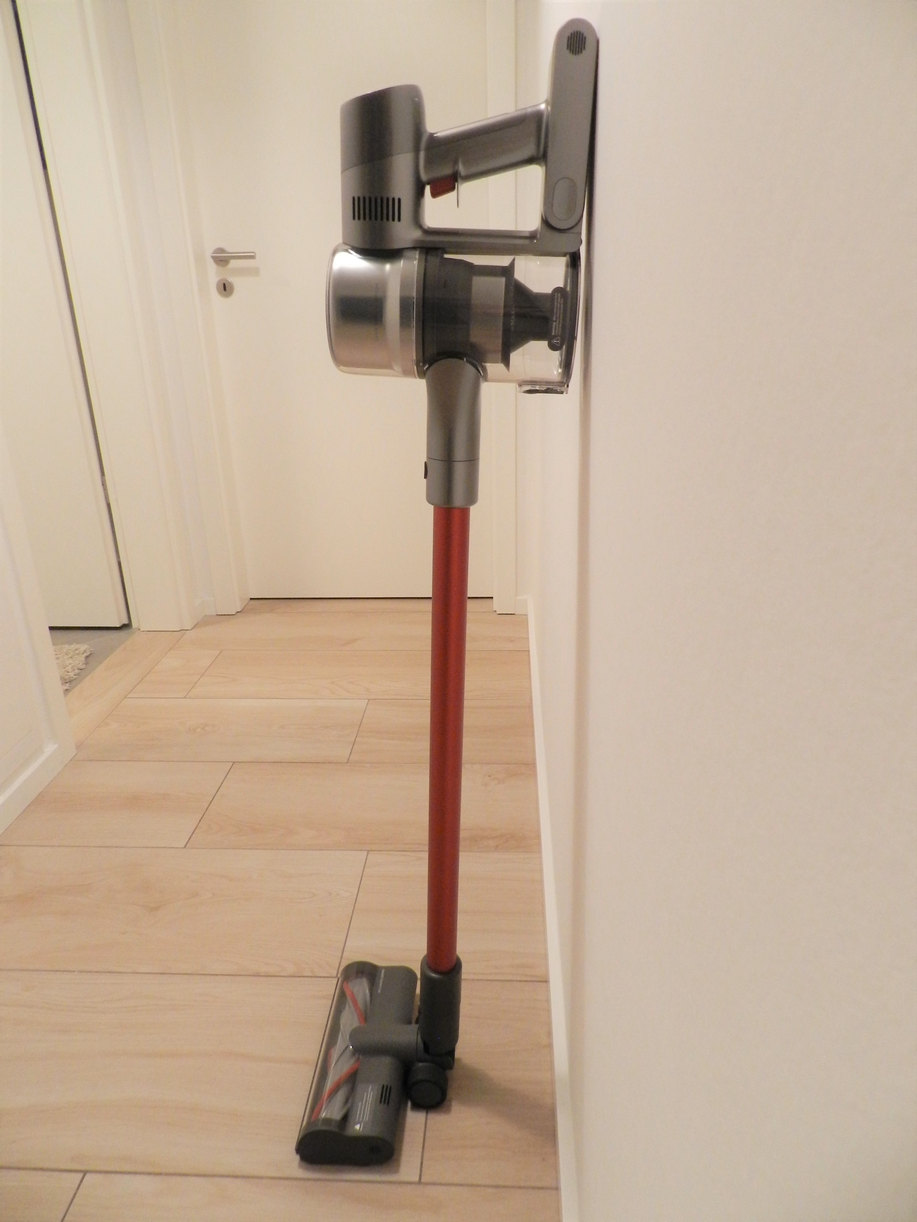Da unser Modell aber eh nur eine Batterie enthält, spielt das aber eine untergeordnete Rolle. Dann lädt man den T20 eben, wenn der Sauger an die Wand und in die Abstellkammer wandert. Voraussetzung ist dann natürlich, dass die Halterung in der Nähe einer Steckdose installiert wird. Nebenbei gesagt ist der schöne Sauger aber fast zu schade, um in die Kammer zu wandern.