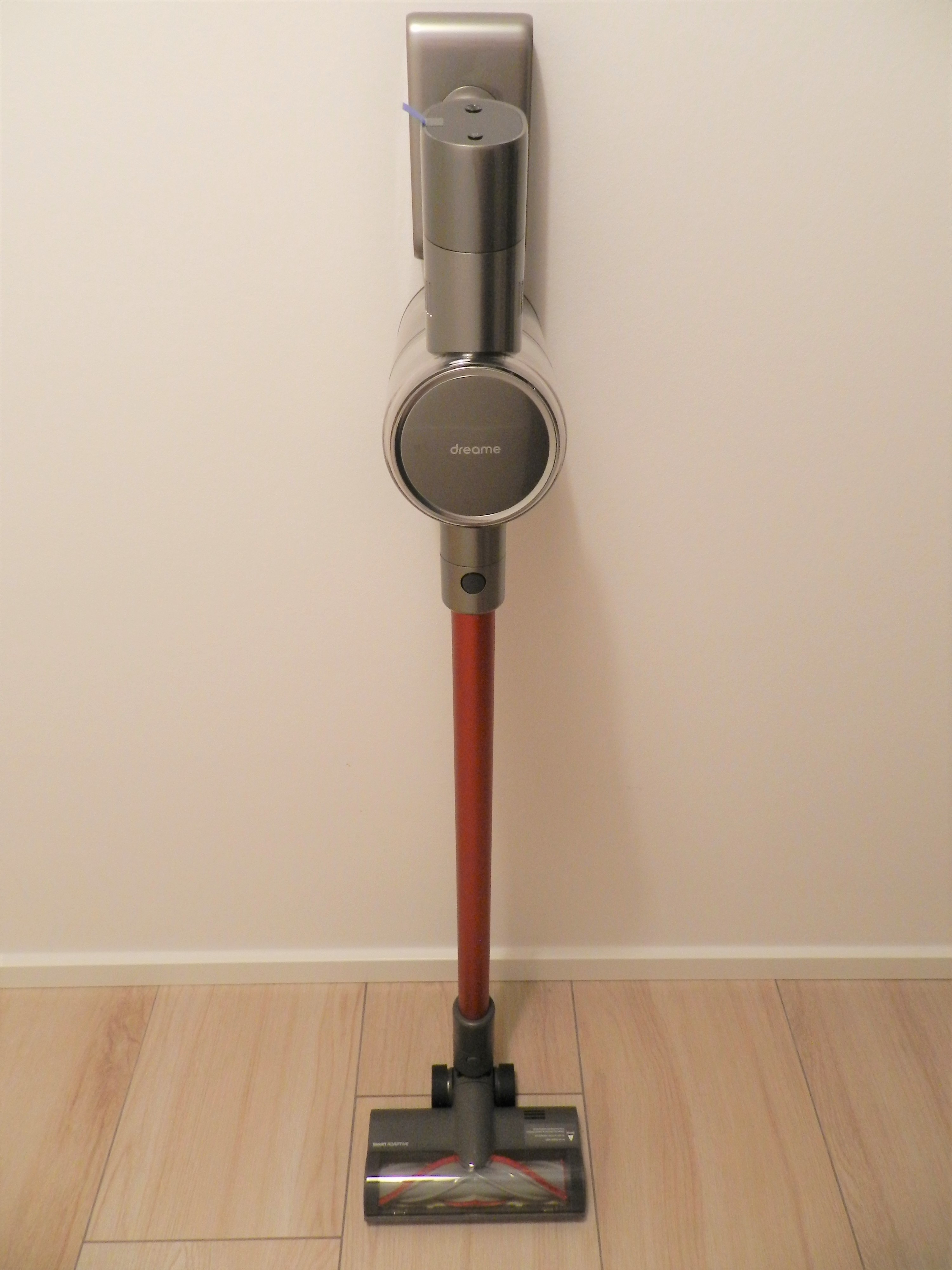 Wie schon euphorisch verkündet, kann der Akku nun endlich entnommen werden. Sofern man also einen Ersatzakku sein Eigen nennt, kann man die Arbeitszeit also verdoppeln eh man nachladen muss. Dreame lässt euch den Akku (theoretisch) auf insgesamt 3 Wegen laden. Entweder direkt am Griffschaft mittels DC-Anschluss oder bei installierter Wandhalterung durch die vorhandenen Kontaktpins. Die 3. Möglichkeit des Ladens, ist den entnommenen Akku direkt auf die Wandhalterung zu stellen. Letztere Option käme aber eher nur in Betracht, wenn ihr über einen zweiten Akku verfügt. Leider bin ich mir hier nicht ganz sicher, inwieweit Dreame noch an dem finalen Produkt feilt, denn diese Möglichkeit des Ladens ist bei unserer Version nicht gegeben. Der Grund ist ganz einfach: In der Crowdfunding Kampagne unterscheidet sich die Wandhalterung von unserer Wandhalterung. Während die Ladestation mit Ladeaufsatz publiziert wird (linkes Bild unten), fehlt der verlängerte Aufsatz bei unserem Modell (Bild mittig & rechts). Gut möglich, dass es auch davon abhängt, welches Finanzierungspaket ihr gewählt hattet oder diese Option hat es nicht in das finale Produkt geschafft. Erwähnt wird davon nämlich nichts in der Betriebsanleitung. Komischer Weise können wir die obere Abdeckung der Wandhalterung abnehmen und es kommen 2 Kontakt-Pins zum Vorschein. Laden kann man den einzelnen Akku dann aber eben doch nicht darauf.