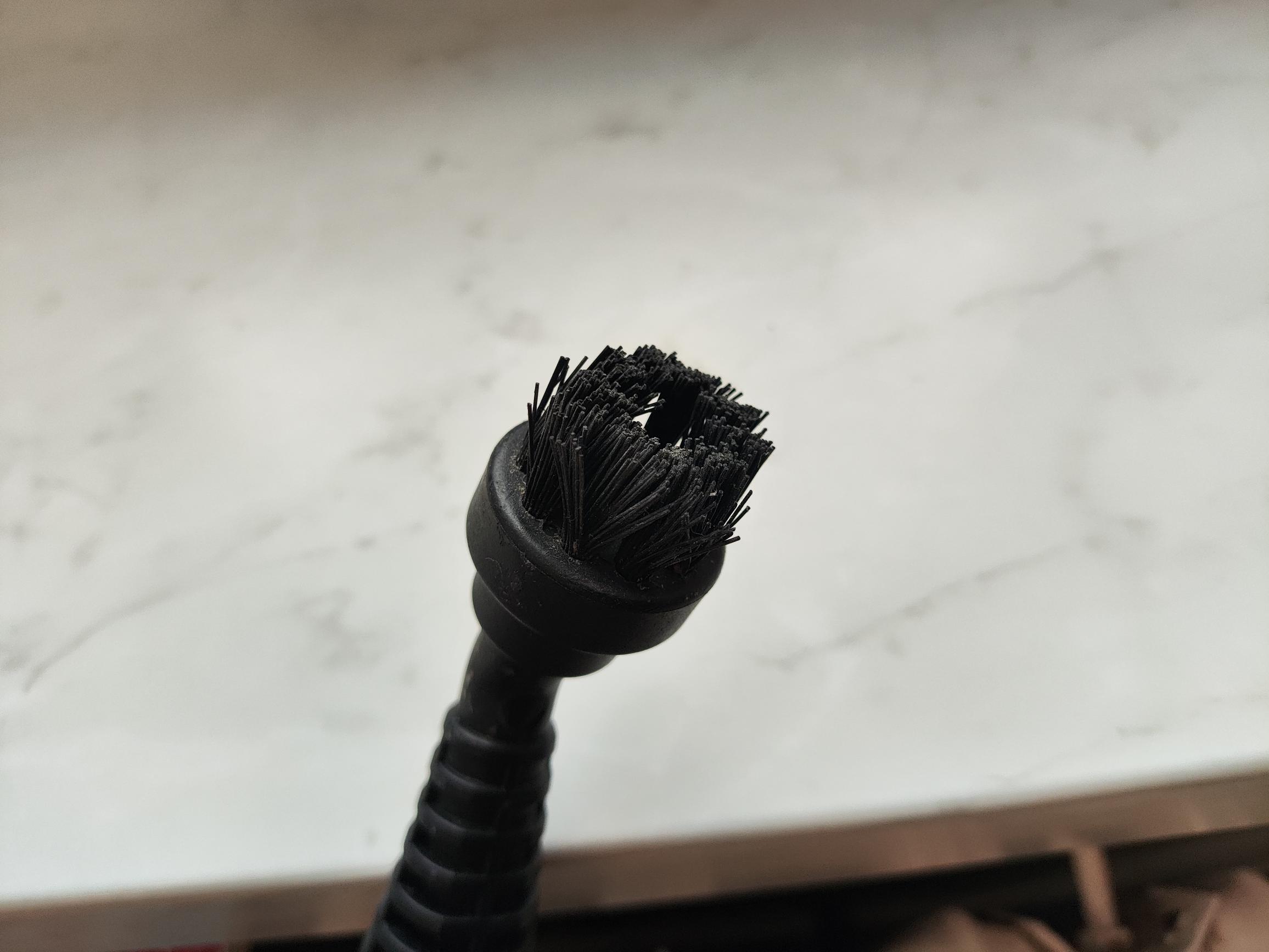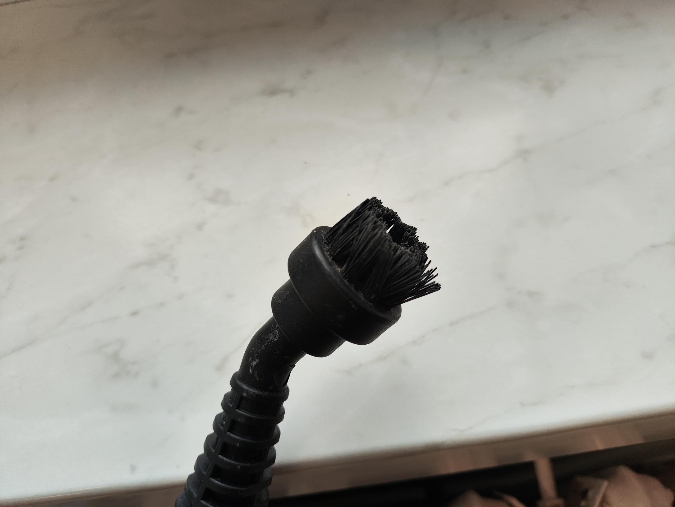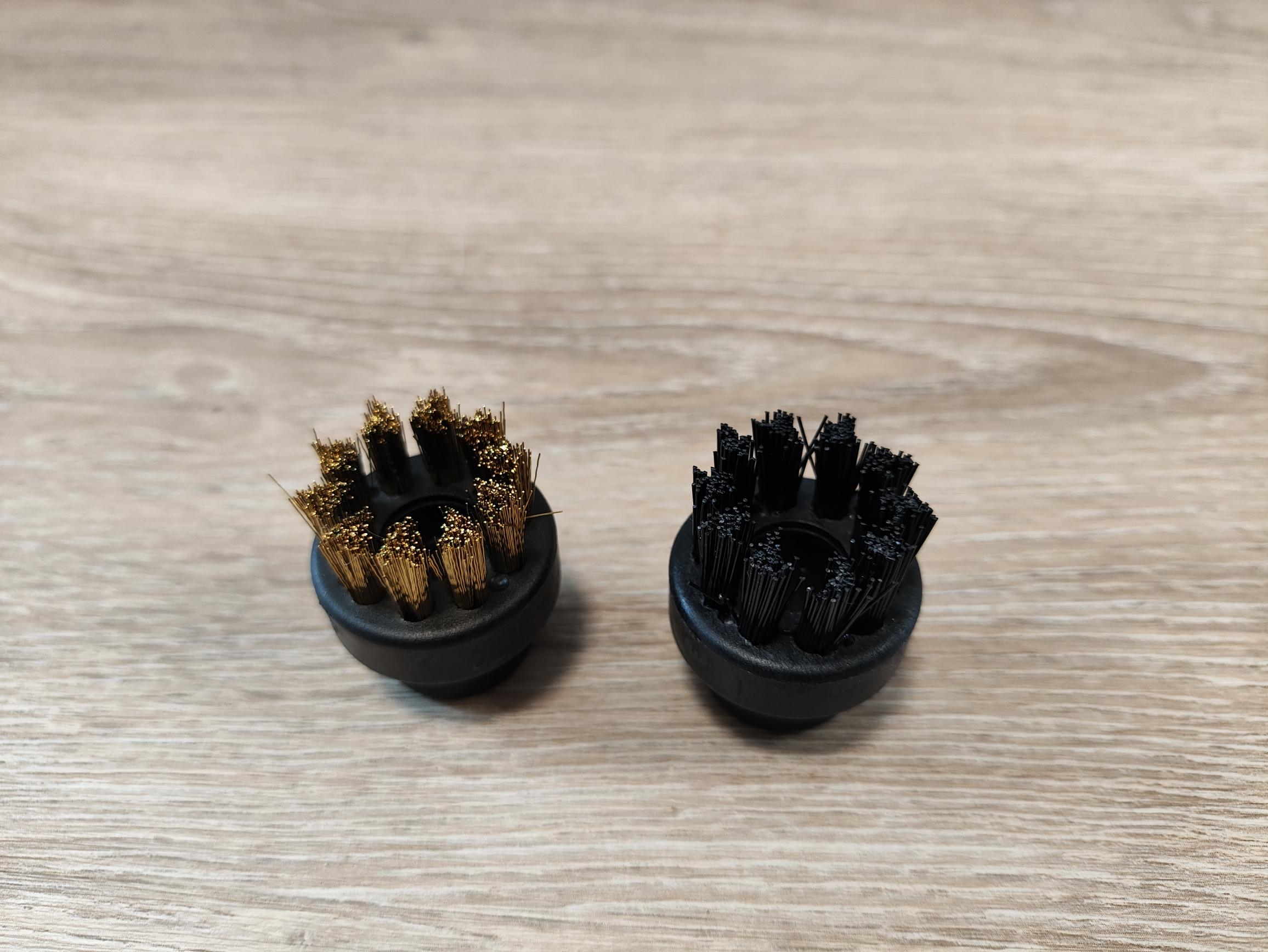 Die kleinen Rundbürsten mit Kunststoffborsten ermöglichen die punktuelle Reinigung von Fugen oder stark verschmutzten Bereichen. Im Lieferumfang befindet sich sogar ein Aufsatz mit kleinen Messingborsten. Diesen haben wir im Test jedoch nicht verwendet, da er die Oberfläche mechanisch stark beansprucht.