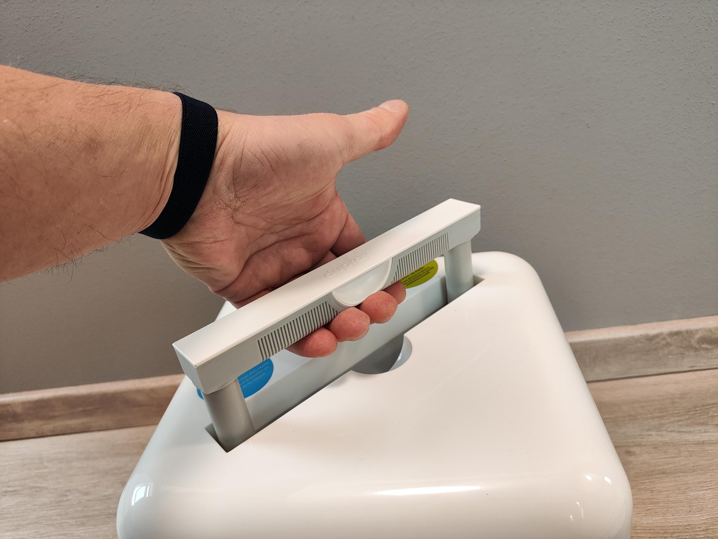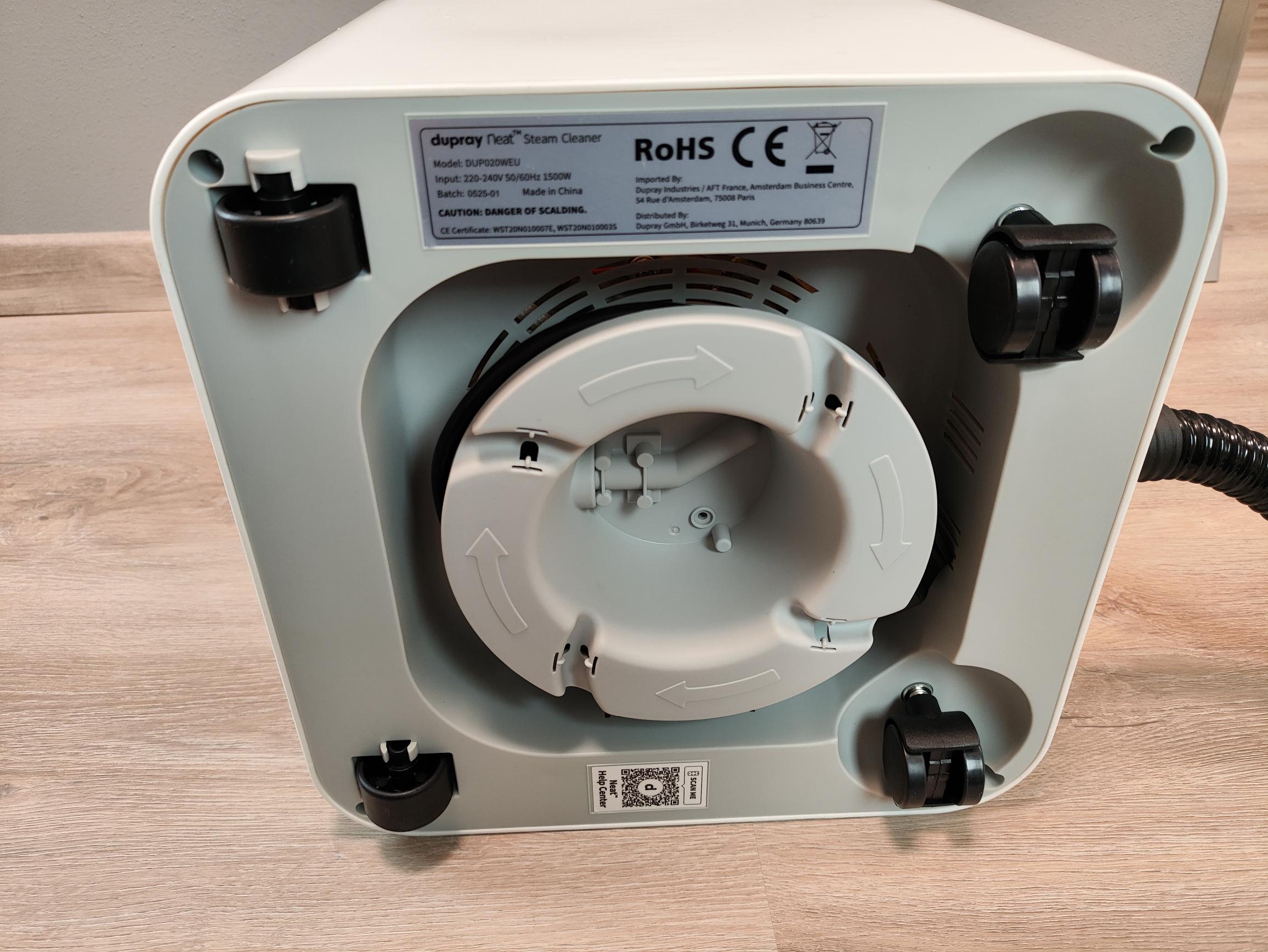 Auf der Oberseite befindet sich neben dem ausziehbaren Tragegriff der Schraubverschluss des Dampfdruckbehälters. Hier befüllt ihr das Gerät mit Frischwasser. Beachtet unbedingt die danebenstehenden Sicherheitshinweise, um Verbrühungen durch heißen Wasserdampf zu vermeiden. Auf der Unterseite ist der Dupray Neat mit Rollen ausgestattet, wodurch ihr den Dampfreiniger bequem hinterherziehen könnt. Das 3,9 Meter lange Anschlusskabel lässt sich auf der Unterseite aufwickeln, sodass es bei der Lagerung des Gerätes nicht stört. Trotz der hochwertigen Optik des Dupray Neat hinterlässt das Gerät kein Premiumgefühl. Der Kunststoff ist sehr schmutz- und kratzanfällig, der Tragegriff lässt sich etwas hakelig herausziehen und der Verschluss des Dampfdruckbehälters greift nicht ganz sauber im Gewinde.