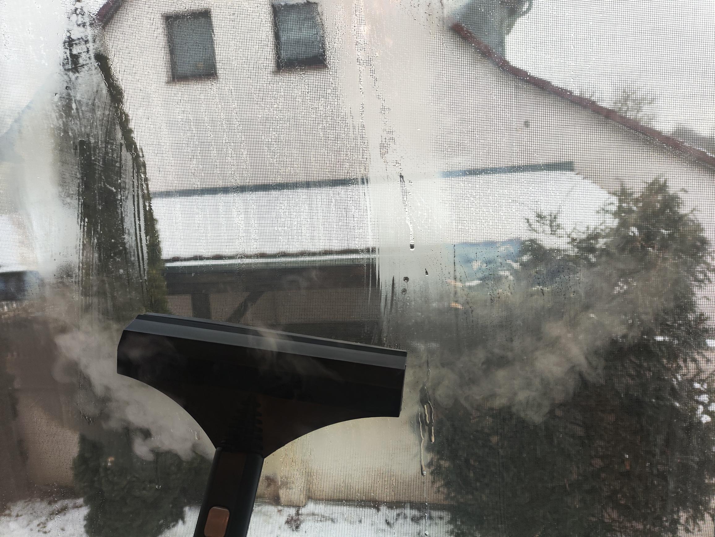 Der Fensterreinigungsaufsatz ist in unserem Test vollständig durchgefallen. Die Glasfläche wird hier lediglich bedampft und kann dann mittels der Gummilippe abgezogen werden. Die hohe Dampfmenge sorgt für eine extrem nasse Scheibe. An allen Seiten läuft das Wasser herunter und tropft auf Rahmen, Fensterbrett und Fußboden. Das Wasser verteilt sich überall, nur nicht dort, wo ihr es haben möchtet. Der Abzieher funktioniert zudem miserabel und quietscht auf der Scheibe. Wie man mit diesem Aufsatz eine Glasfront säubern soll, können wir nicht nachvollziehen.