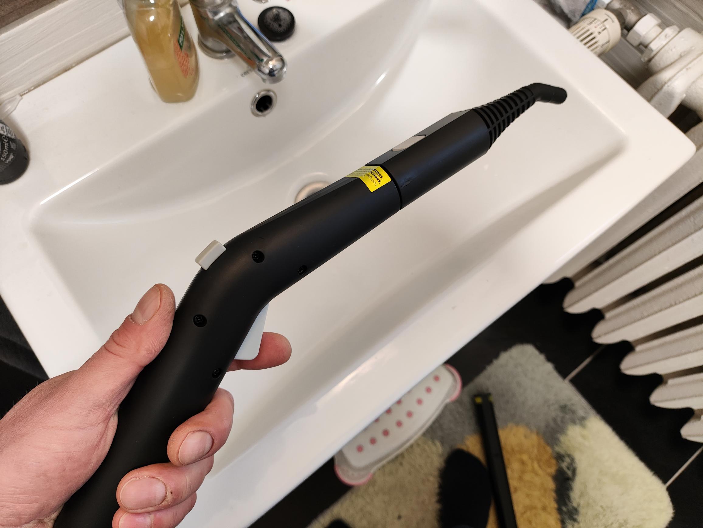 Die Bedienung des Dupray Neat Dampfreinigers erfolgt ausschließlich am Handstück. Der untere Taster aktiviert den Dampfausstoß, während ihr den oberen Taster für den Dauerbetrieb drücken könnt. In dieser Kombination müsst ihr den unteren Taster nicht während der kompletten Reinigung halten.