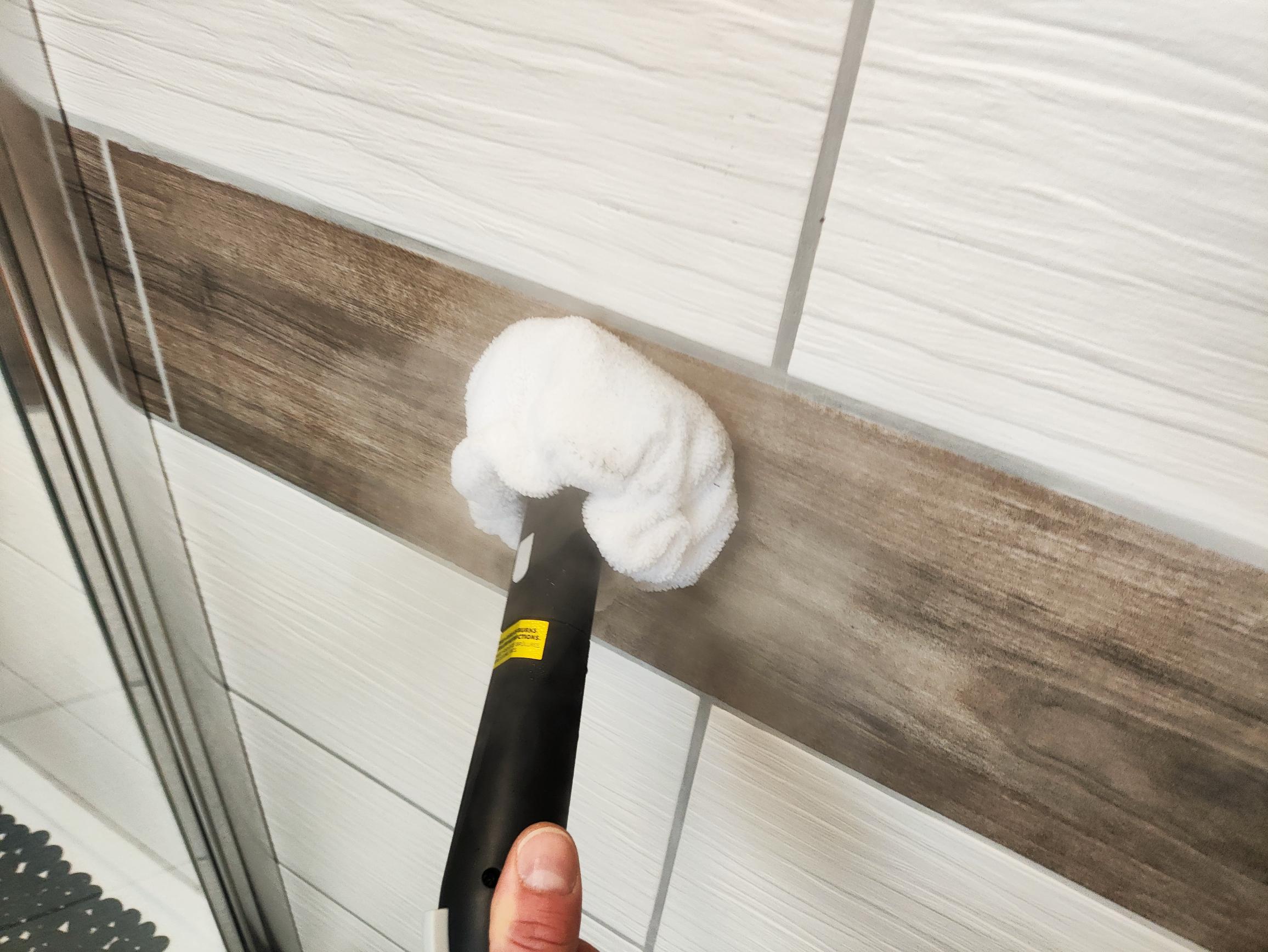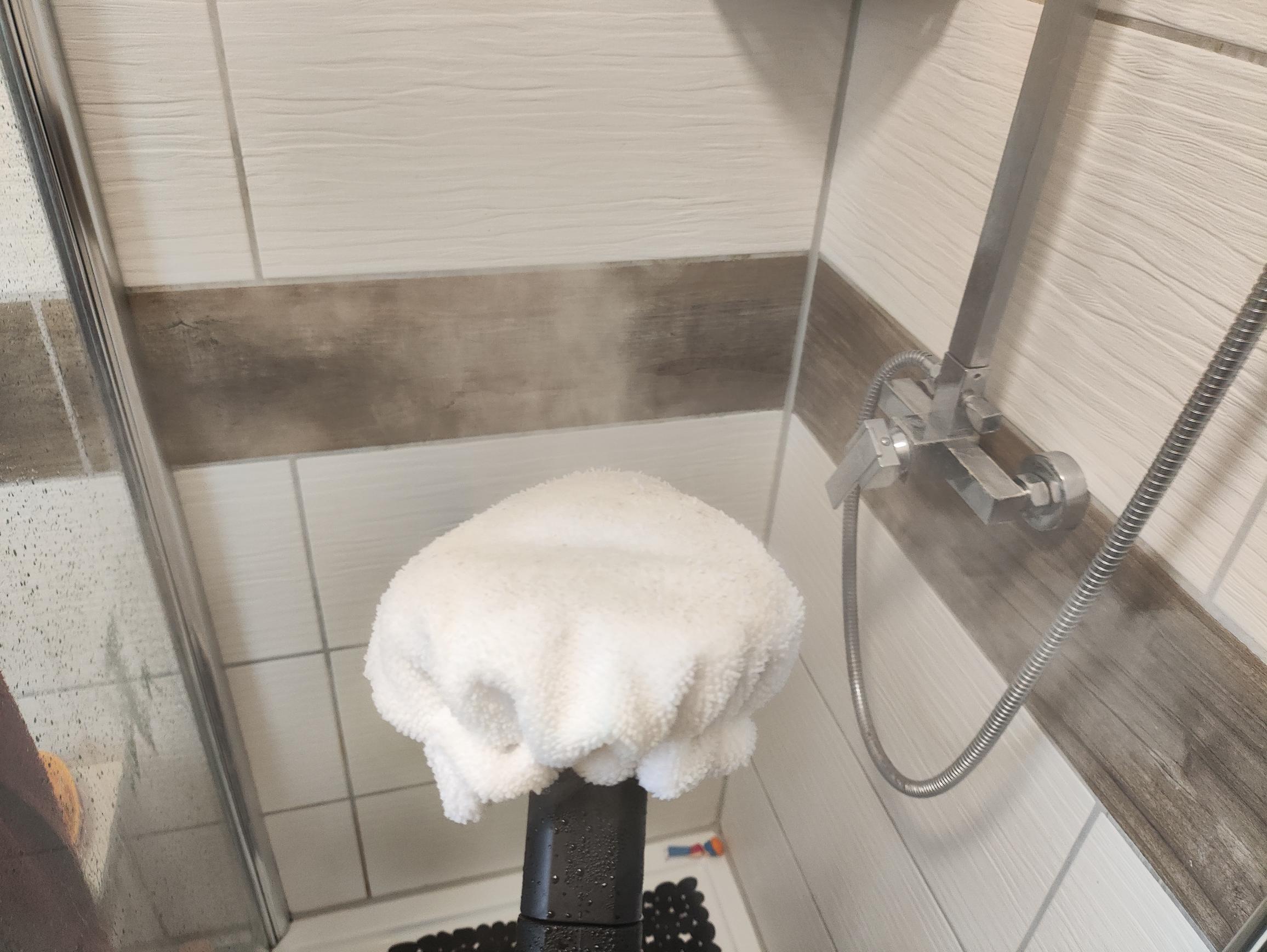 Die Reinigung mit der Dreiecksbürste und dem Mikrofasertuch ist hingegen flüsterleise. Das Tuch dämpft die Geräusche vorbildlich. Die Dreieckbürste eignet sich perfekt für die Reinigung von Duschkabinen, Wandfliesen, Badspiegeln oder auch Polstermöbeln. Das Mikrofasertuch nimmt den Schmutz sehr gut auf und entfernt in Verbindung mit dem heißen Dampf und den Borsten der Dreieckbürste sogar Kalkflecken zuverlässig. Auf Polstermöbeln entfernt ihr Flecken mit mäßigem Erfolg. Diese werden aufgrund der hohen Dampf- und Wassermenge vorwiegend in die Polster eingearbeitet. Zurück bleibt ein sehr stark durchnässtes Polster. Aufgrund des heißen Dampfes erwärmt sich selbstverständlich auch das Mikrofasertuch. Möchtet ihr es während der Reinigung auswaschen, solltet ihr es vor dem Abnehmen kalt abspülen. Hier besteht ansonsten Verbrennungsgefahr.