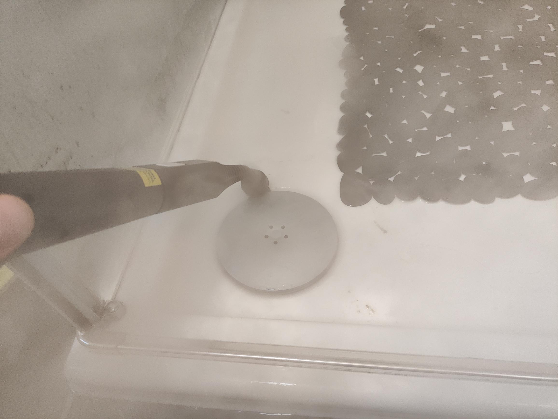 Mit der kleinen Rundbürste lassen sich selbst hartnäckige Kalkflecken fast vollständig entfernen. Die Dampfentwicklung bei der Reinigung mit der Dampflanze und den Rundbürsten ist enorm, sodass ihr zeitweise das zu reinigende Objekt kaum noch erkennt. Noch besser eignet sich die kleine Bürste für Fliesenfugen, Waschtischarmaturen oder den Randbereich der Duschwanne. Selbst stark verschmutzte Fugen erstrahlen nach wenigen Minuten wieder im ursprünglichen Farbton. Während die Bodenstation fast geräuschlos arbeitet, ist der Betrieb mit der Dampflanze extrem laut. Diese erzeugt ein sehr lautes, zischendes Geräusch, das eine Lautstärke von 86dB(A) in einem Meter Abstand erreicht. Da ihr euch vorwiegend sehr nah am Reinigungsgerät aufhaltet, haben wir die Lautstärke nochmals im Abstand von 50 Zentimetern gemessen. Hier beträgt die Lautstärke im Reinigungsbetrieb bis zu 90dB(A). Somit sind längere Reinigungsaktionen mit der kleinen Rundbürste eine echte Belastungsprobe für die Ohren.