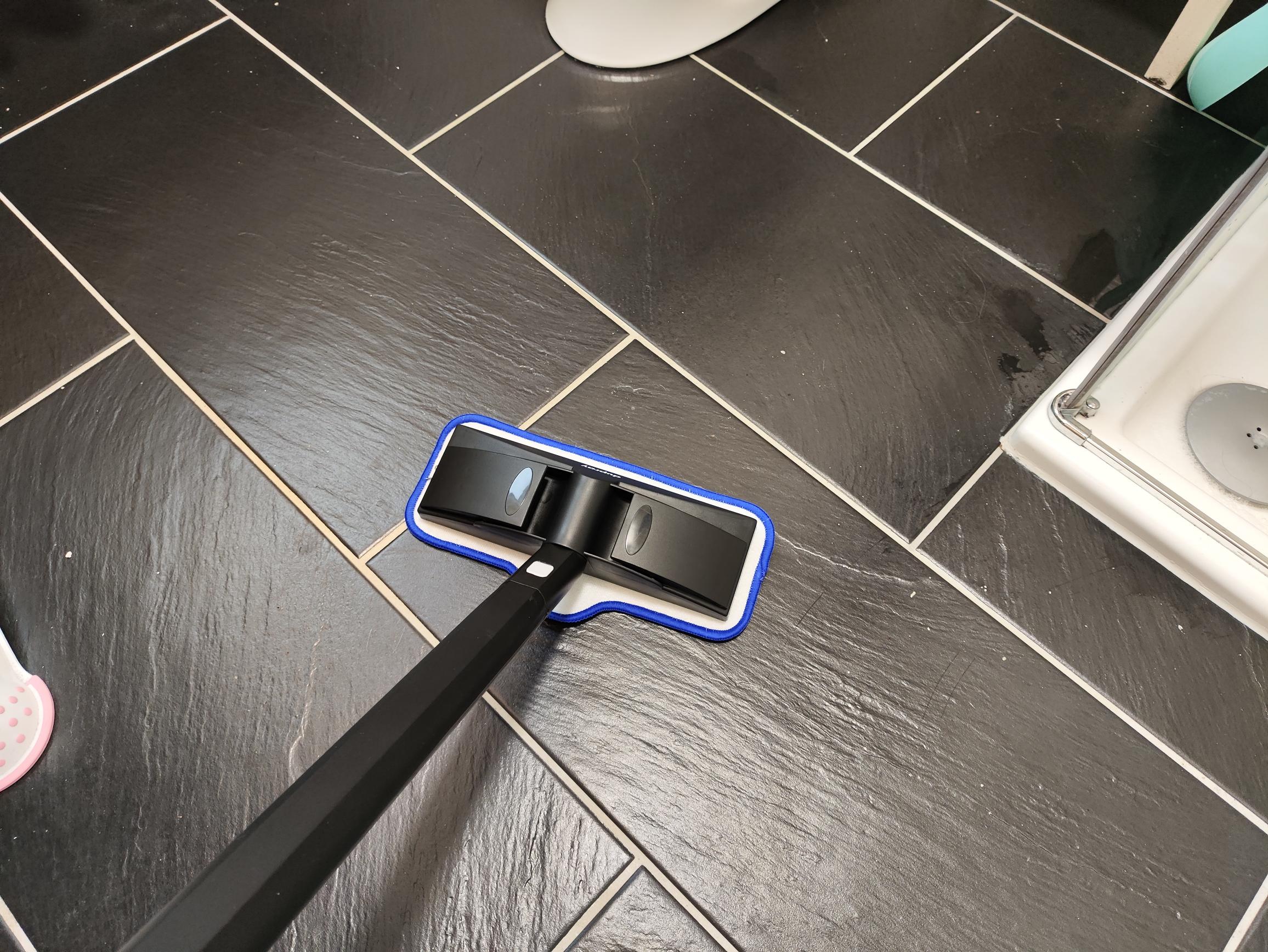 Die Bodenreinigung kann wahlweise mit den drei mitgelieferten Mikrofasertüchern oder dem großen Mikrofaserlappen erfolgen. Während die Tücher selbstständig an der Unterseite des Bodenaufsatzes haften (klettähnliches Prinzip), spannt ihr den Mikrofaserlappen an den Seiten ein. Für die Reinigung großer Flächen solltet ihr alle drei Mikrofasertücher einplanen, da die Schmutzaufnahmekapazität nicht besonders hoch ist. Durch die hohe Dampfentwicklung wischt ihr den Boden sehr nass. Es dauert dementsprechend lange, bis dieser wieder trocken ist. Das Reinigungsergebnis konnte allerdings überzeugen. Selbst eingetrocknete Flecken entfernt ihr nach ein paar Sekunden Einwirkzeit. Wie bereits angesprochen, lässt sich die Bodendüse lediglich nach rechts und links neigen. Aufgrund eines fehlenden Dreh-Kipp-Gelenks, wie ihr es von Bodenstaubsaugern kennt, ist die Bürste in ihrer Handhabung eingeschränkt und kann somit unter flachen Hindernissen wie Tischen oder Badschränken nur bedingt verwendet werden.