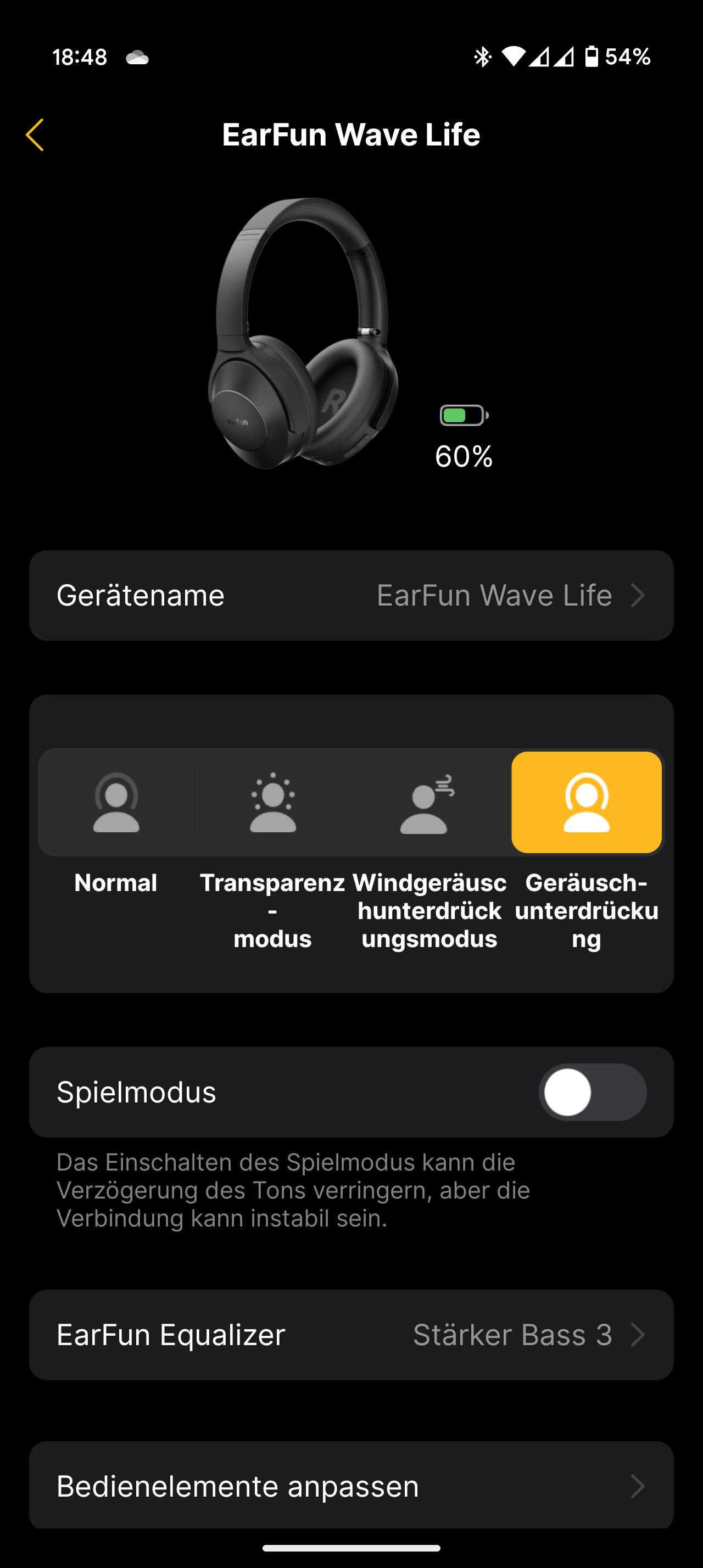 Den Akku konnte ich während meines Tests nicht vollständig leeren. Der Hersteller gibt eine Laufzeit von bis zu 60 Stunden an. Nach rund 24 Stunden Nutzung – überwiegend mit aktivem ANC – waren noch 60 % Akku übrig.