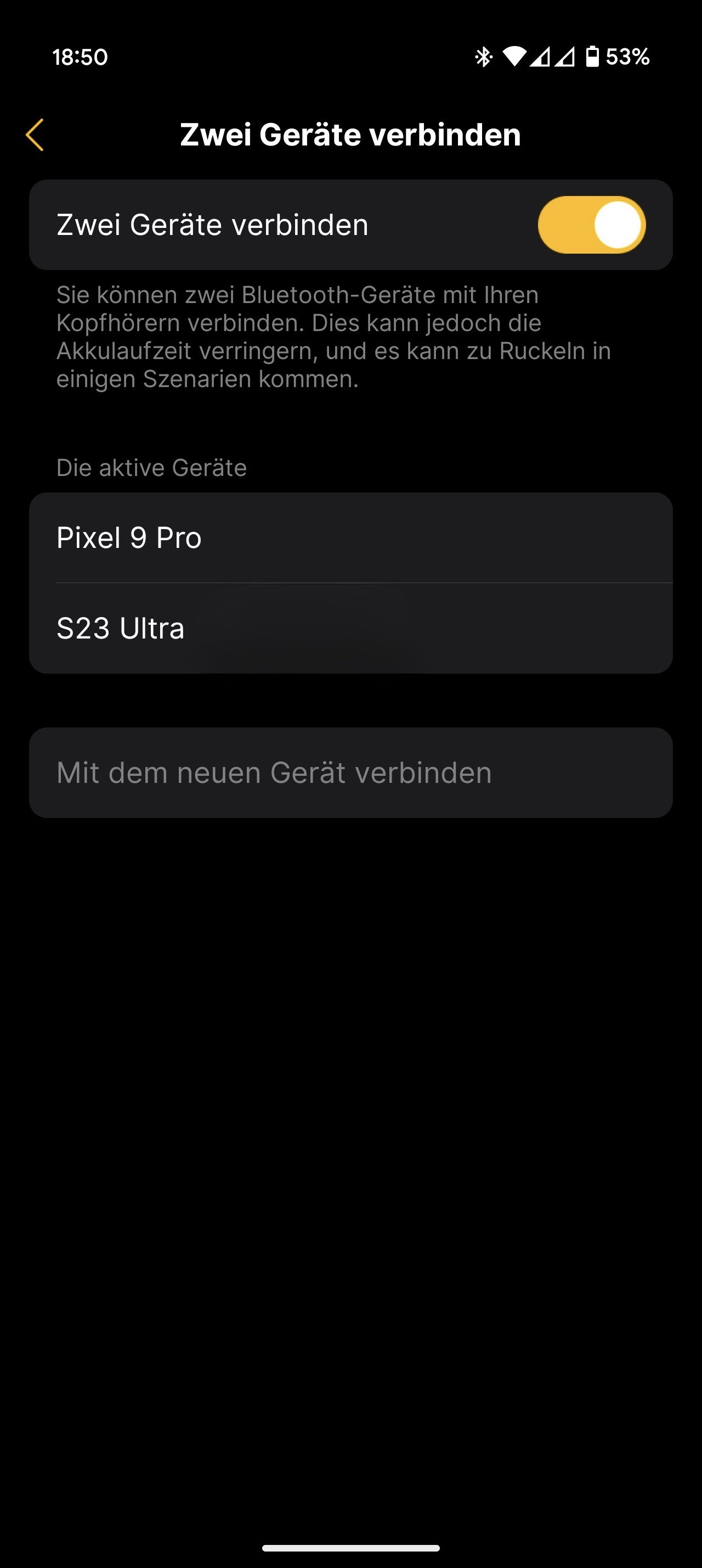 Auch die gleichzeitige Verbindung mit zwei Geräten wird unterstützt: Musik vom PC hören und bei Anrufen automatisch aufs Smartphone wechseln – in meinem Test funktionierte das meist reibungslos. Nur wenn auf beiden Geräten gleichzeitig Musik lief, wusste der Kopfhörer nicht, welches Gerät Vorrang hat.