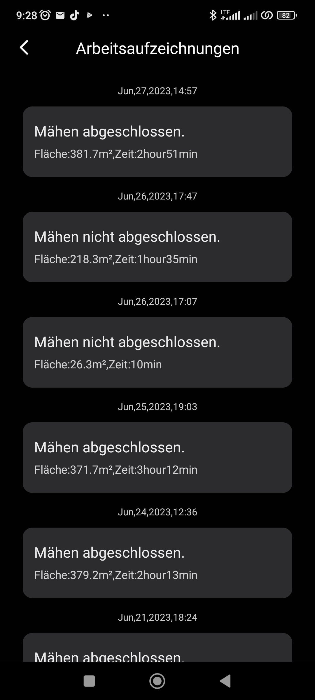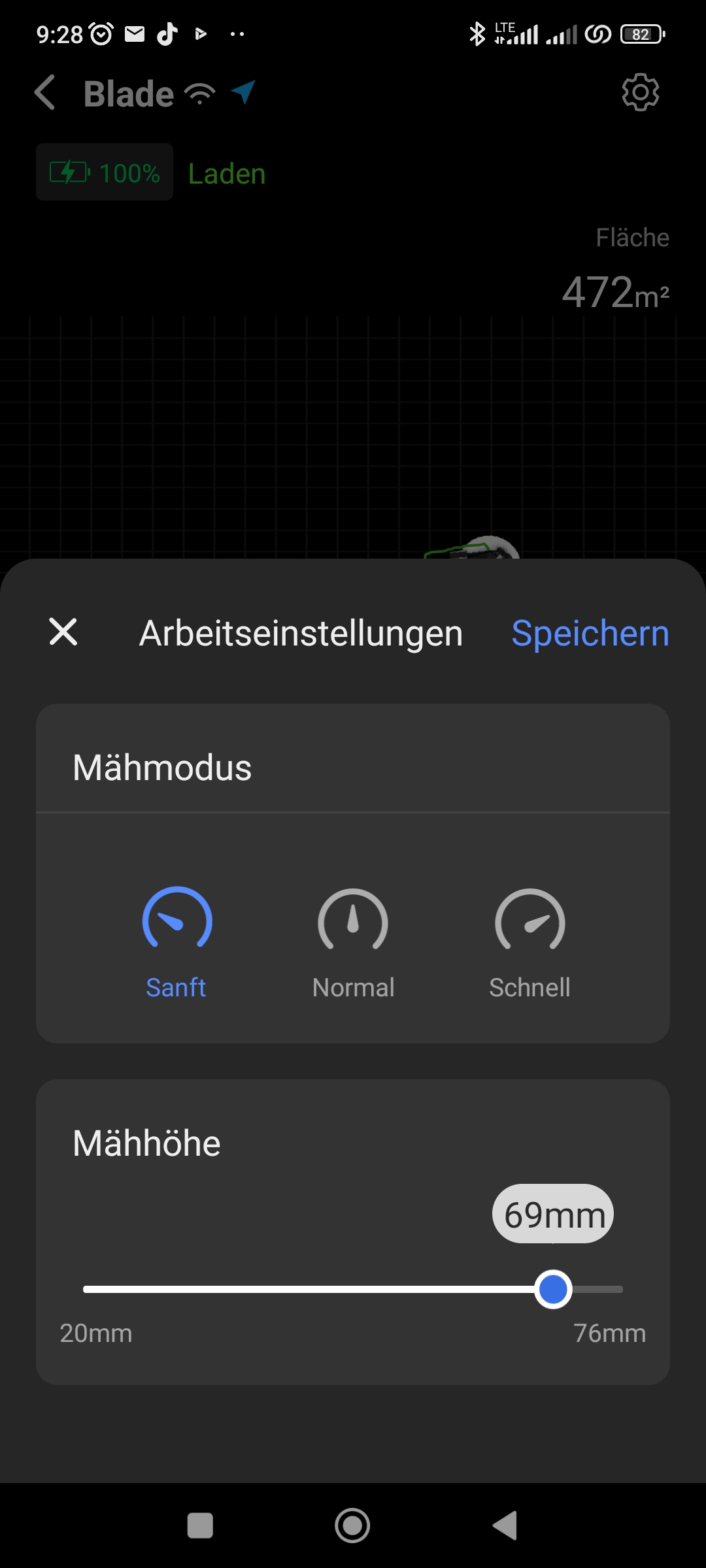 Neben allgemeinen Informationen, Freigaben und Firmwareupdates lässt sich die Geschwindigkeit in drei Stufen regulieren. Wenn Zeit keine Rolle spielt, solltet ihr den Sanft-Modus wählen. Zum einen ist bei diesem Modus das Schnittbild am besten und bei Normal und Schnell werden die Wendemanöver teilweise so schnell ausgeführt, dass der Rasen darunter leidet. Die Schnitthöhe lässt sich von 20 bis 76 Millimeter stufenlos einstellen. Natürlich kann der Rasenmähroboter auch zeitgesteuert für jeden Tag oder jede Uhrzeit programmiert werden. Die Mähaufträge werden protokolliert und können im Nachgang bezüglich Zeit und Erfolg ausgewertet werden. Die angelegten Arbeitsbereiche/verbotenen Bereiche können im Nachgang noch bearbeitet werden. Wobei Bearbeiten hier relativ ist. Man kann die Bereiche hier nur löschen oder neue hinzufügen.