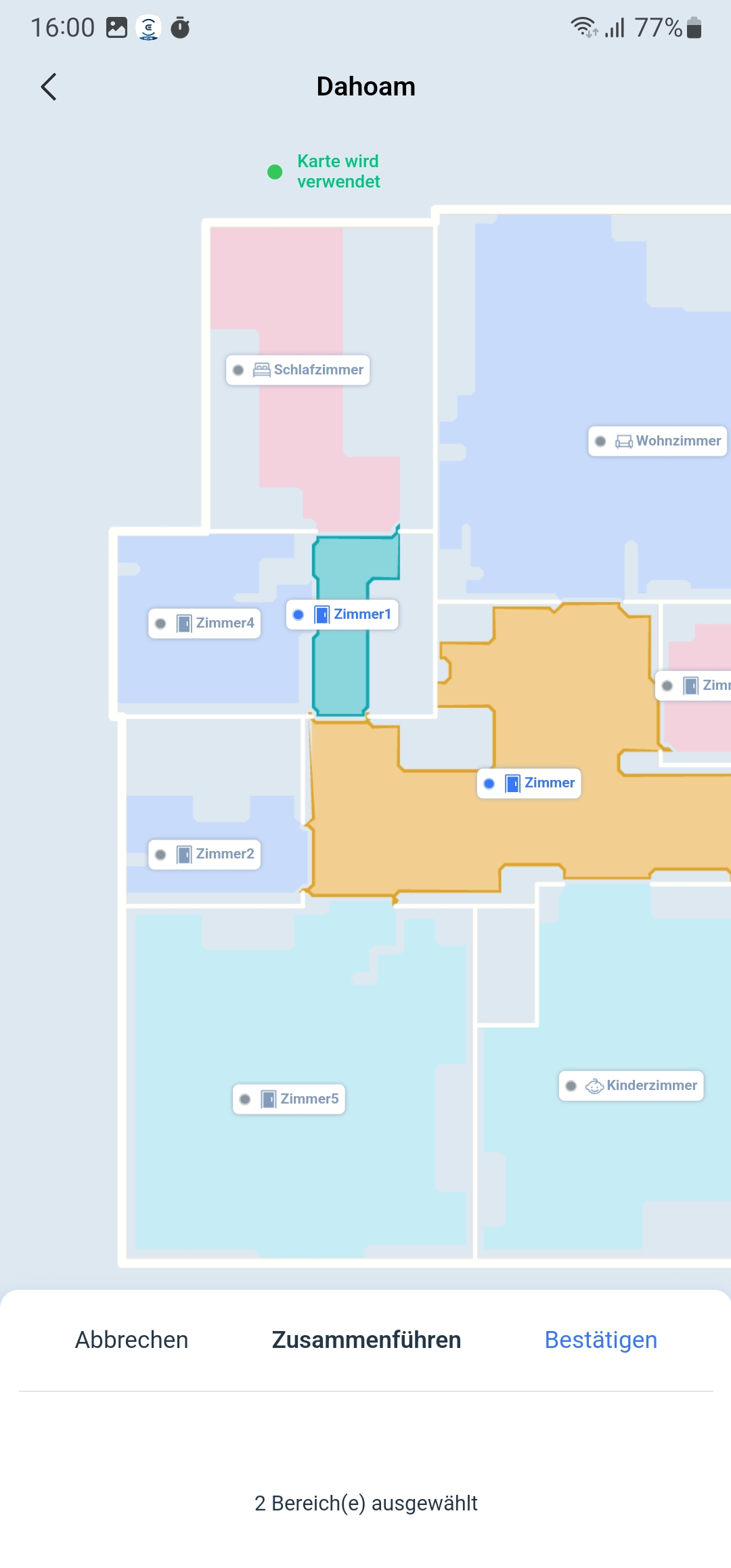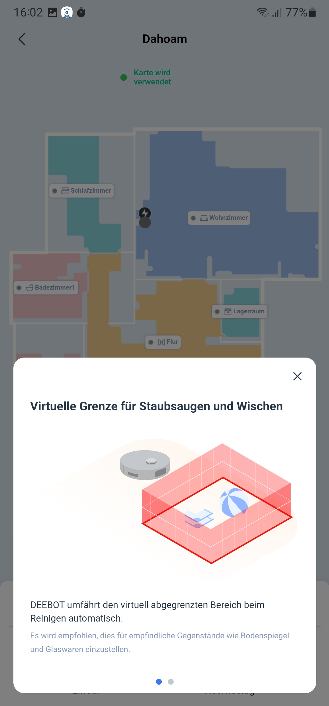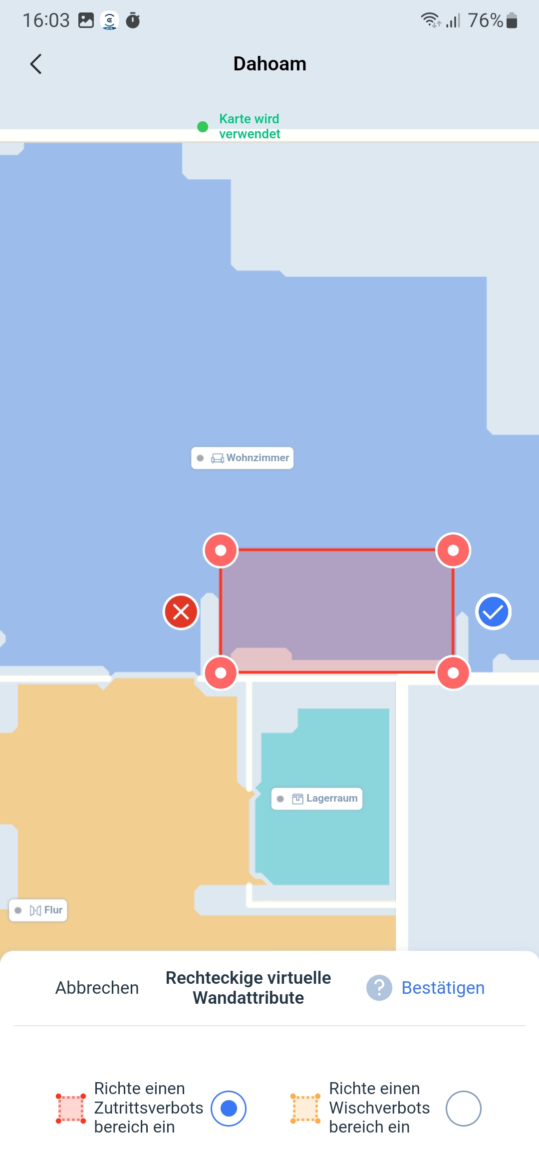 Meine knapp 100m² große 4-Raum-Wohnung war bereits nach 6 Minuten vollständig “kennengelernt”. Die Räume wurden recht zuverlässig erkannt und gespeichert. Zwei Räume musste ich im Nachhinein leicht verändern bzw. die Aufteilung nachträglich etwas anpassen, da Flur und Hauptbadezimmer sowie Flur und Küche zu einem Raum zusammengefasst wurden. Sind die Räume entsprechend aufgeteilt und umbenannt, empfiehlt es sich, bei Bedarf direkt virtuelle Grenzen für die Bereiche zu ziehen, die auf keinen Fall gesaugt oder gewischt werden sollen. Die App verlangt eine gewisse Mindestgröße des Bereichs, der nicht befahren werden soll. In meinem Fall ist der TV- und HiFi-Bereich zu klein um diesen zu definieren. Ich musste hier etwas Abhilfe schaffen und virtuelle Wände erstellen.
