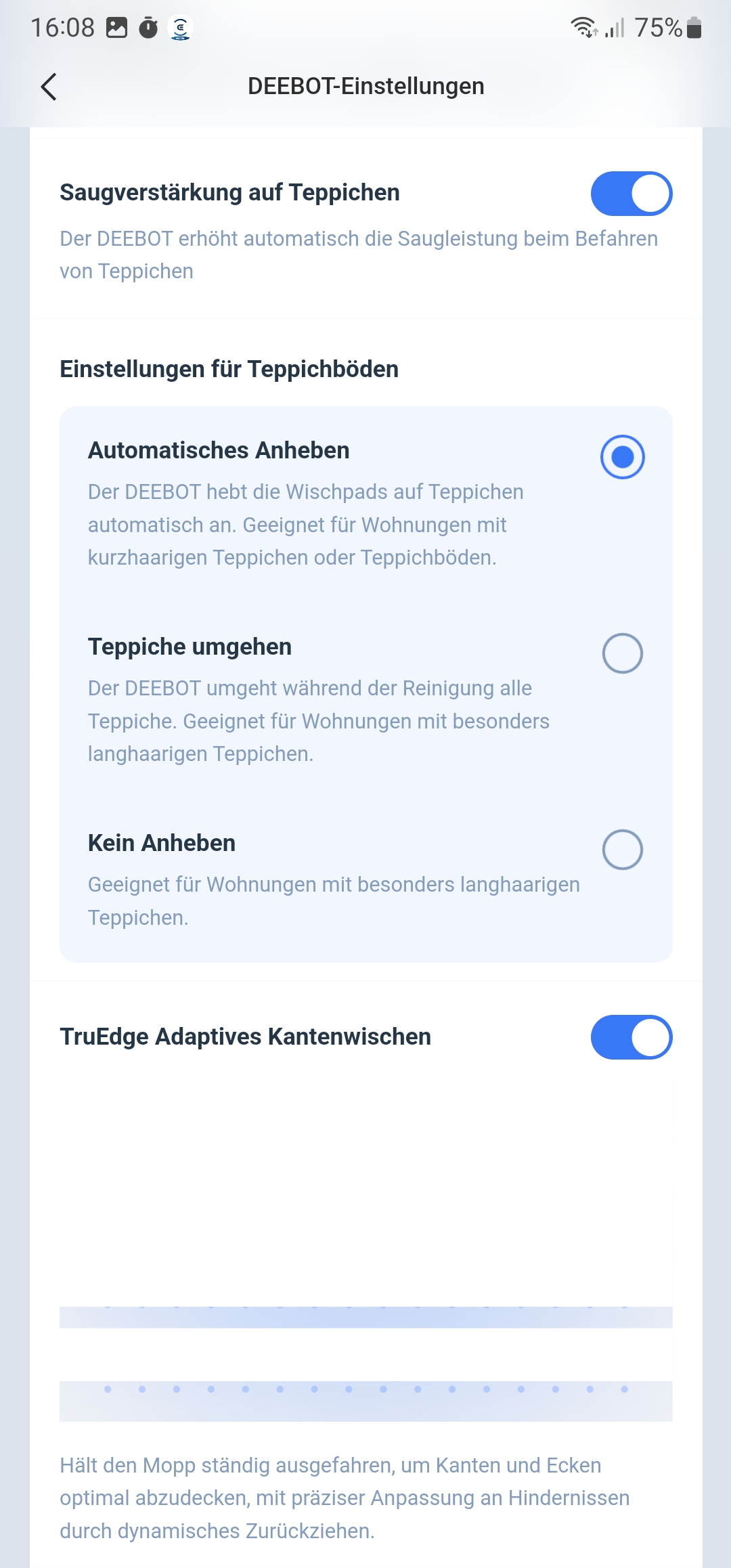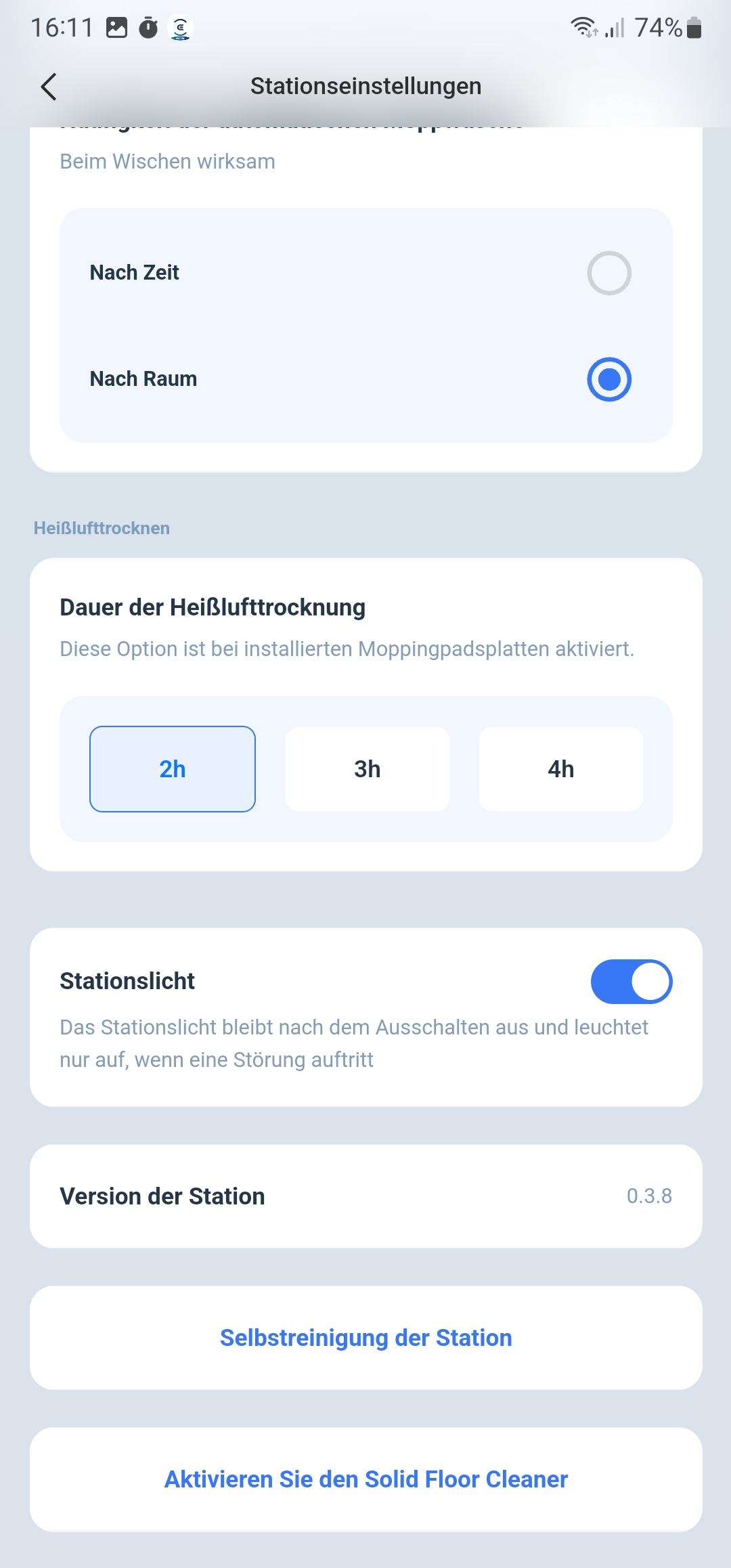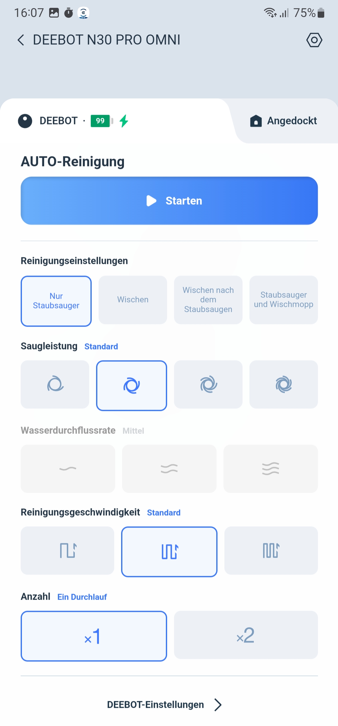 Grundsätzlich empfehle ich, vor allem beim Wischen, die Reinigungsgeschwindigkeit auf “vollflächig” einzustellen. Dadurch werden engere Bahnen gefahren und die Mopps reinigen den Bereich mehrmals versetzt. Dies erhöht natürlich die Reinigungsdauer und damit den Batterieverbrauch, sorgt aber dafür, dass die Bereiche intensiver gereinigt werden. Ansonsten gibt es noch “Standard” oder wenn es besonders schnell gehen soll, “Schnell”. Bei letzterer Variante wird allerdings deutlich an Reinigungseffizienz eingebüßt.