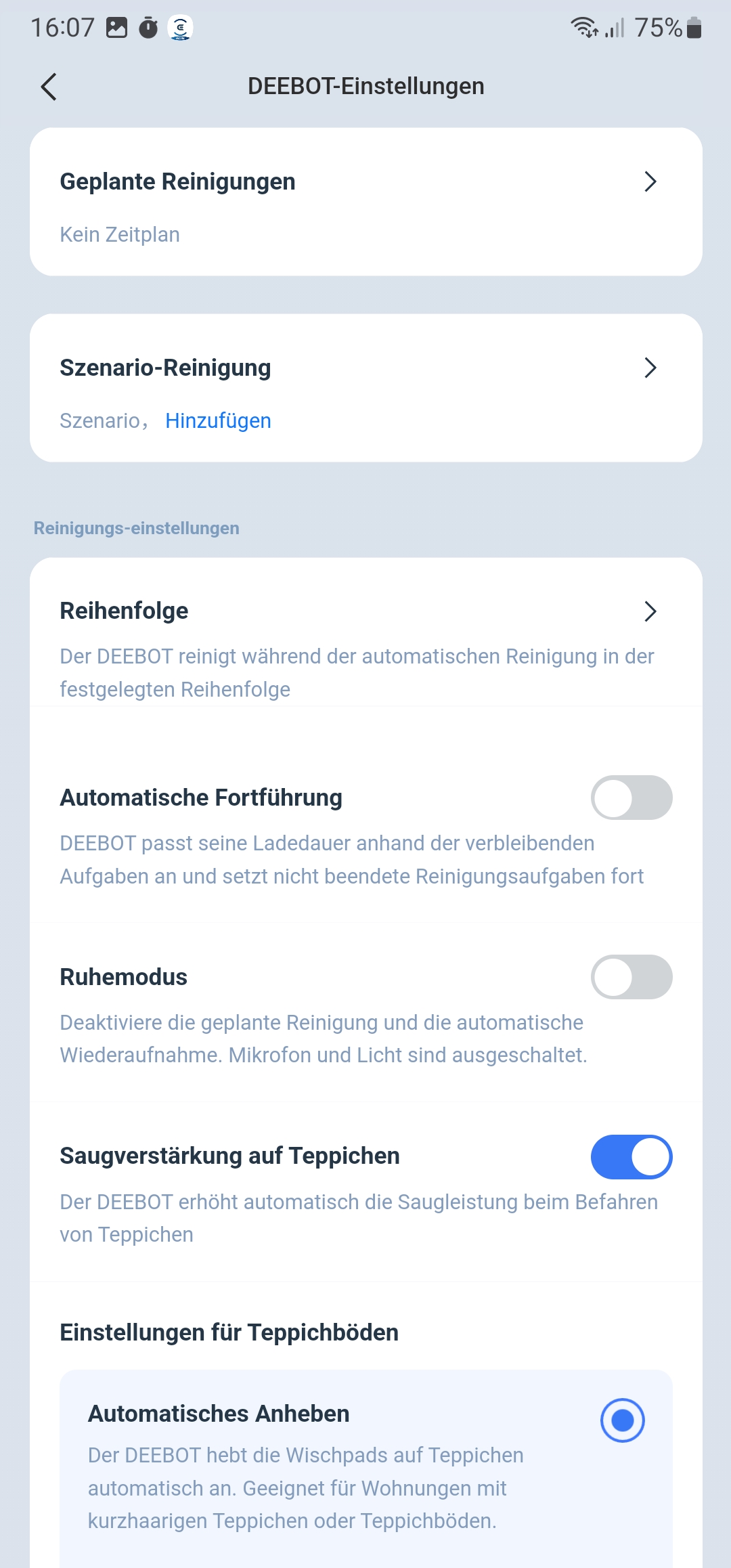 Ansonsten bietet die App die üblichen Einstellmöglichkeiten, die man auch von der Konkurrenz kennt. Zu den Grundfunktionen gehören die Erstellung von Reinigungsplänen, die Szenarienreinigung (getrennt nach Räumen), die Anpassung der Reinigungsreihenfolge, die Wiederaufnahme des Reinigungsvorgangs nach Akkuladung und die Einstellung der Saugleistung beim Überfahren von Teppichen. Zusätzlich kann eingestellt werden, dass der N30 Pro die Mopps während des Wischvorgangs anhebt, um Teppiche möglichst nicht zu befeuchten. Wer besonders hochflorige Teppiche hat, sollte stattdessen die Möglichkeit aktivieren, dass Teppiche umfahren werden. Um Ecken und Kanten effektiver zu reinigen, kann einer der Mopps seitlich ausgefahren werden. Dabei hat man die Wahl zwischen dem Standardmodus und dem Extremmodus, bei dem ständig der Kontakt zu schwer erreichbaren Stellen gesucht wird. Wie es sich für eine gute Basisstation gehört, bietet die Ecovacs Home App dem Nutzer die freie Wahl, wie oft die automatische Entleerung des Staubbehälters durch den Saugroboter erfolgen soll. Solltet ihr Haustiere besitzen oder die komplette Wohnung gereinigt werden, empfiehlt sich die zusätzliche Entleerung.