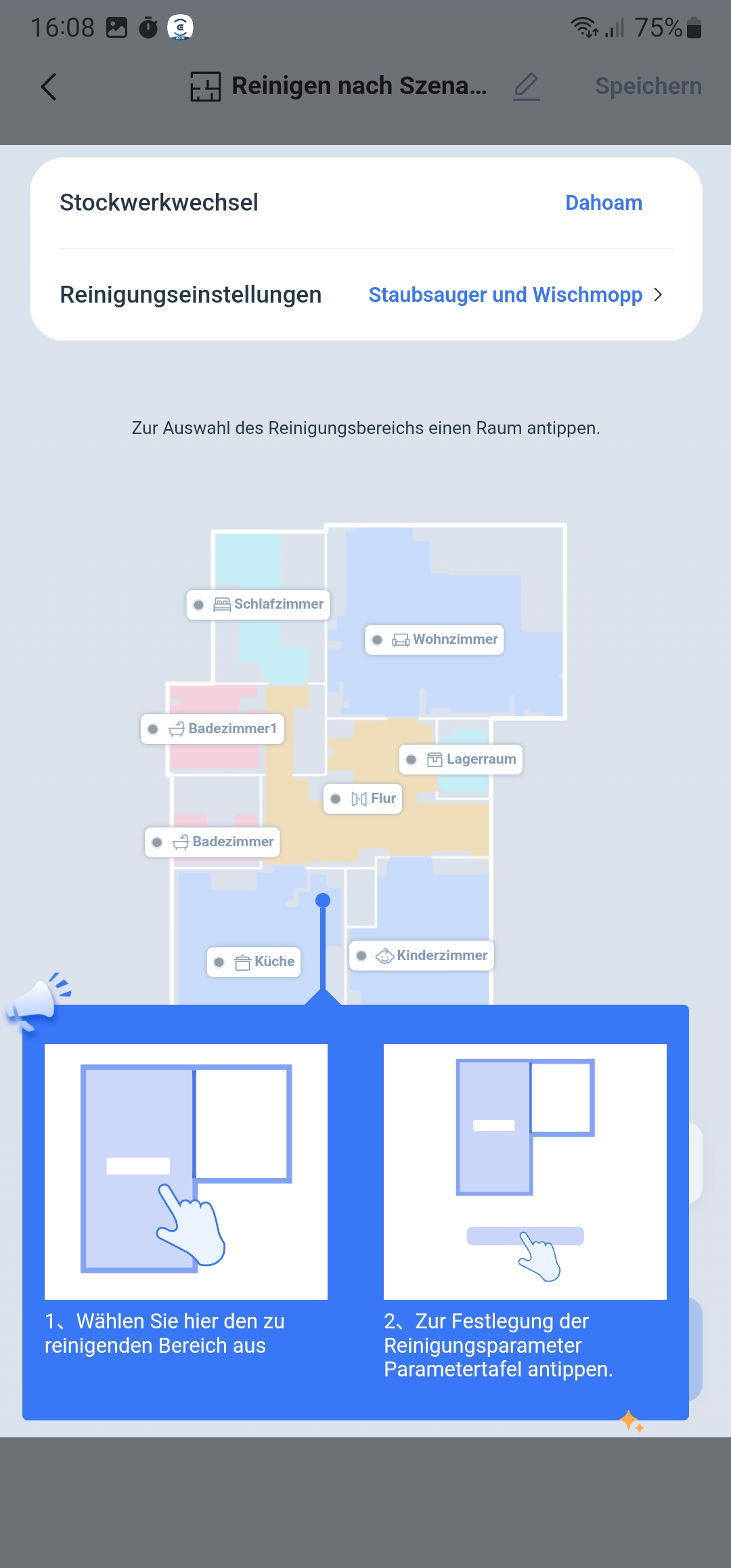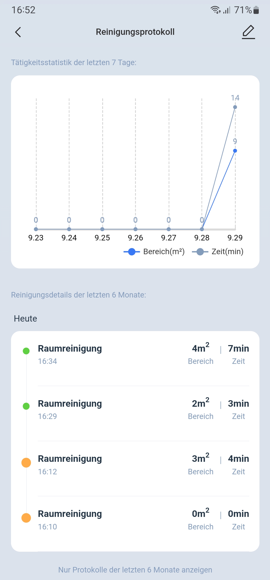| Staubsaugen & wischen | Maximal+ | standard | mittel | 13m² | 14 Minuten | 23% | 61 Minuten |