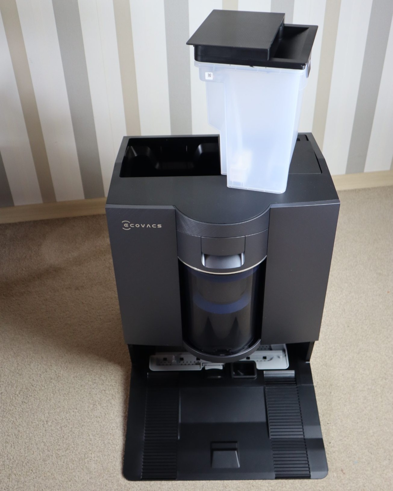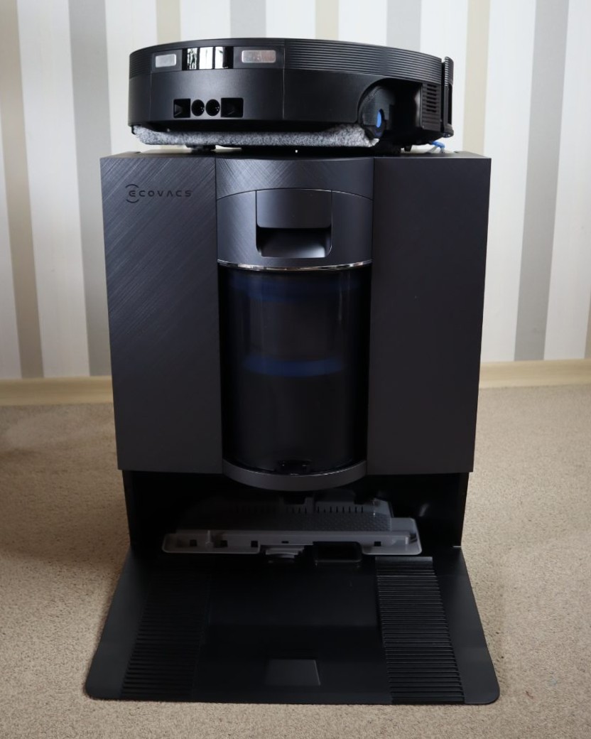 Die Basisstation übernimmt die komplette Wartung des Ecovacs Deebot X12 Omnicyclone. Die Neuerung fanden wir schon beim Vorgänger klasse: Sie verzichtet auf Staubbeutel und nutzt stattdessen eine zweistufige Trennung. Das System sammelt den Schmutz in einem 1,6 Liter fassenden Behälter, was laut Hersteller für rund 48 Tage Betrieb ausreicht. Durch einen Abstreifring entleert ihr den Behälter über dem Mülleimer, ohne mit dem Staub in Berührung zu kommen.