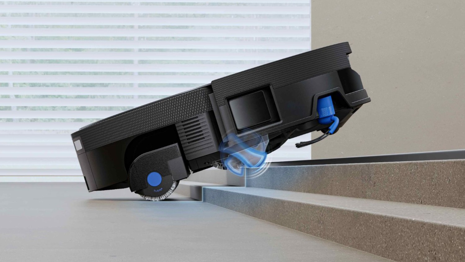 Zusätzlich integriert der Hersteller ein mechanisches Fahrwerk. Laut Ecovacs überwindet der Roboter mit dem Klettersystem einzelne Türschwellen von 2,4cm Höhe. Hierfür klappt ein Haken am Rad heraus. Zudem bewältigt er aufeinanderfolgende Stufen von bis zu 4 Zentimetern Gesamthöhe, was für Wohnungen mit entsprechenden Absätzen einen klaren Mehrwert darstellt.