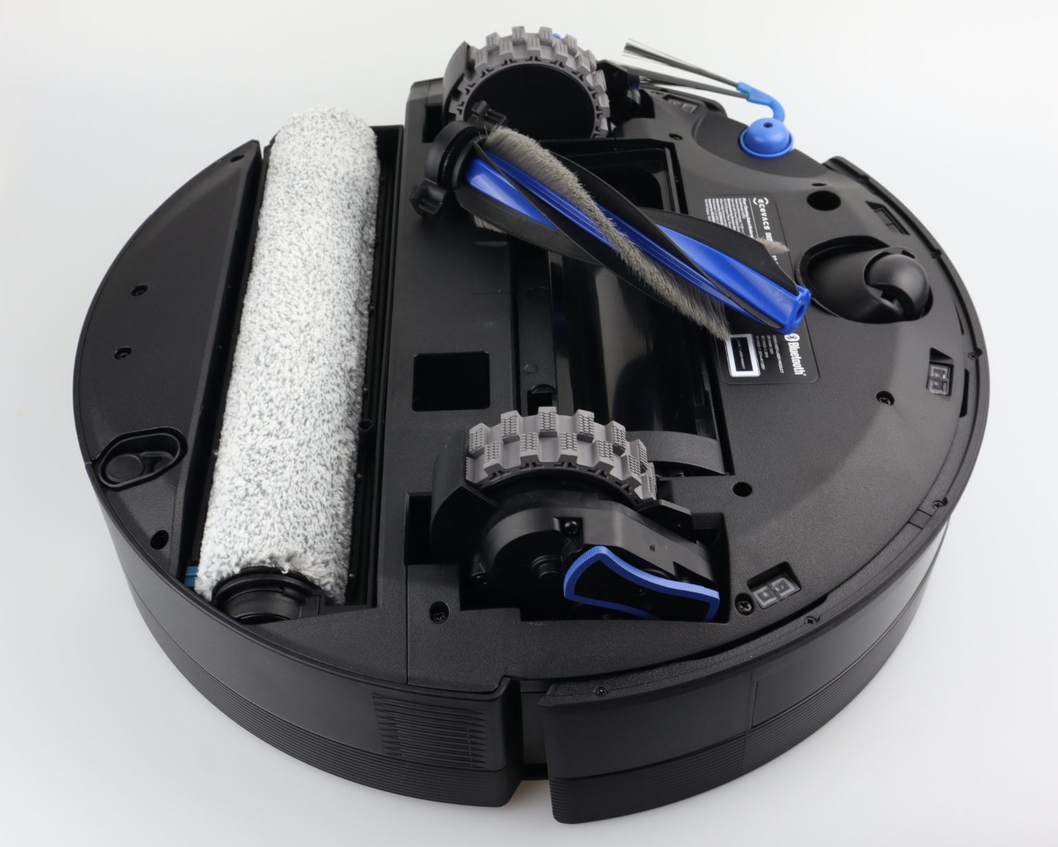 Für die Randreinigung fährt der Roboter die Walze um etwa 2,6 Zentimeter nach außen aus. Teppiche erkennt das Gerät zuverlässig über Sensoren und hebt die nasse Walze automatisch um 15 Millimeter an. Zudem fährt in diesem Moment eine physische Abdeckung über die Walze, um den Kontakt zu Teppichfasern vollständig zu blockieren.