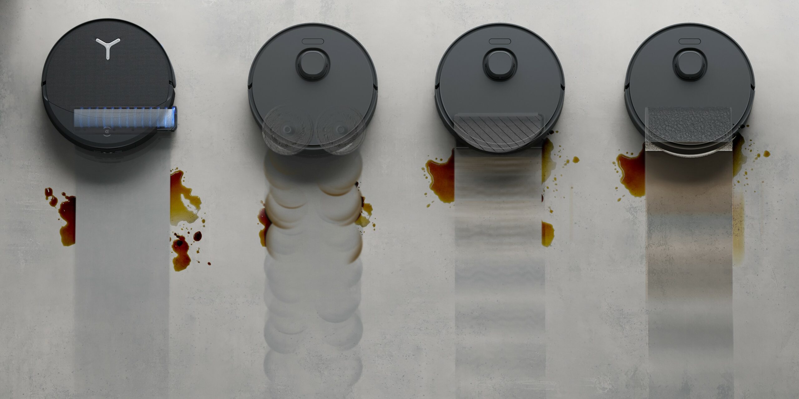 Der konstruktive Vorteil einer Walze und des Systems: Ein System aus 32 Düsen spült die Rolle während der Fahrt durchgehend mit Frischwasser, während das Schmutzwasser separat abgeleitet wird. Zudem sind im Saugroboter selbst drei Tanks verbaut: Frischwasser (110ml), Abwasser und der Staubbehälter. Der Roboter wischt also kontinuierlich mit einer sauberen Walze. In der Basisstation wird die Walze dann z.B. nach jedem Raum gründlich gesäubert.
