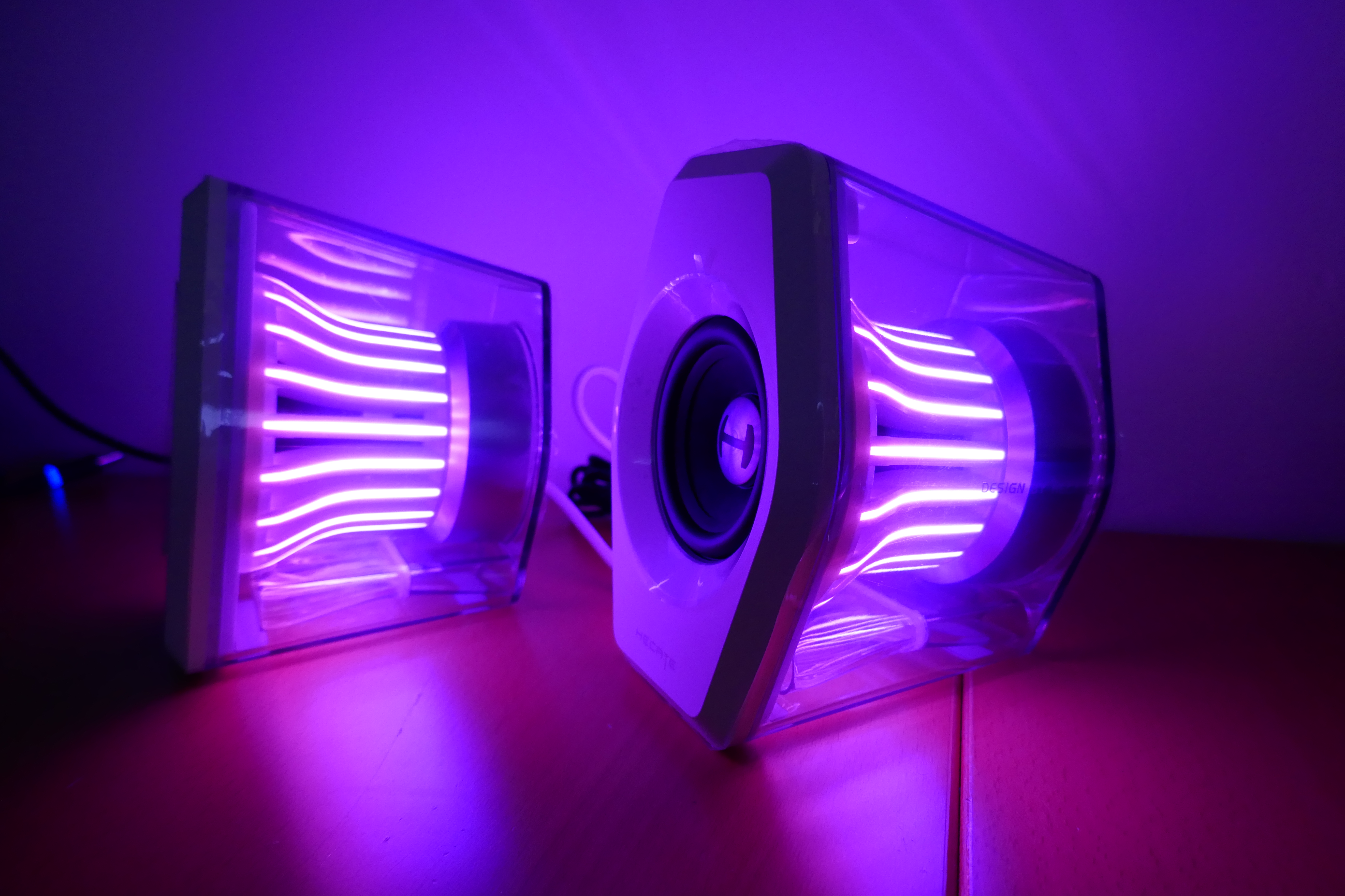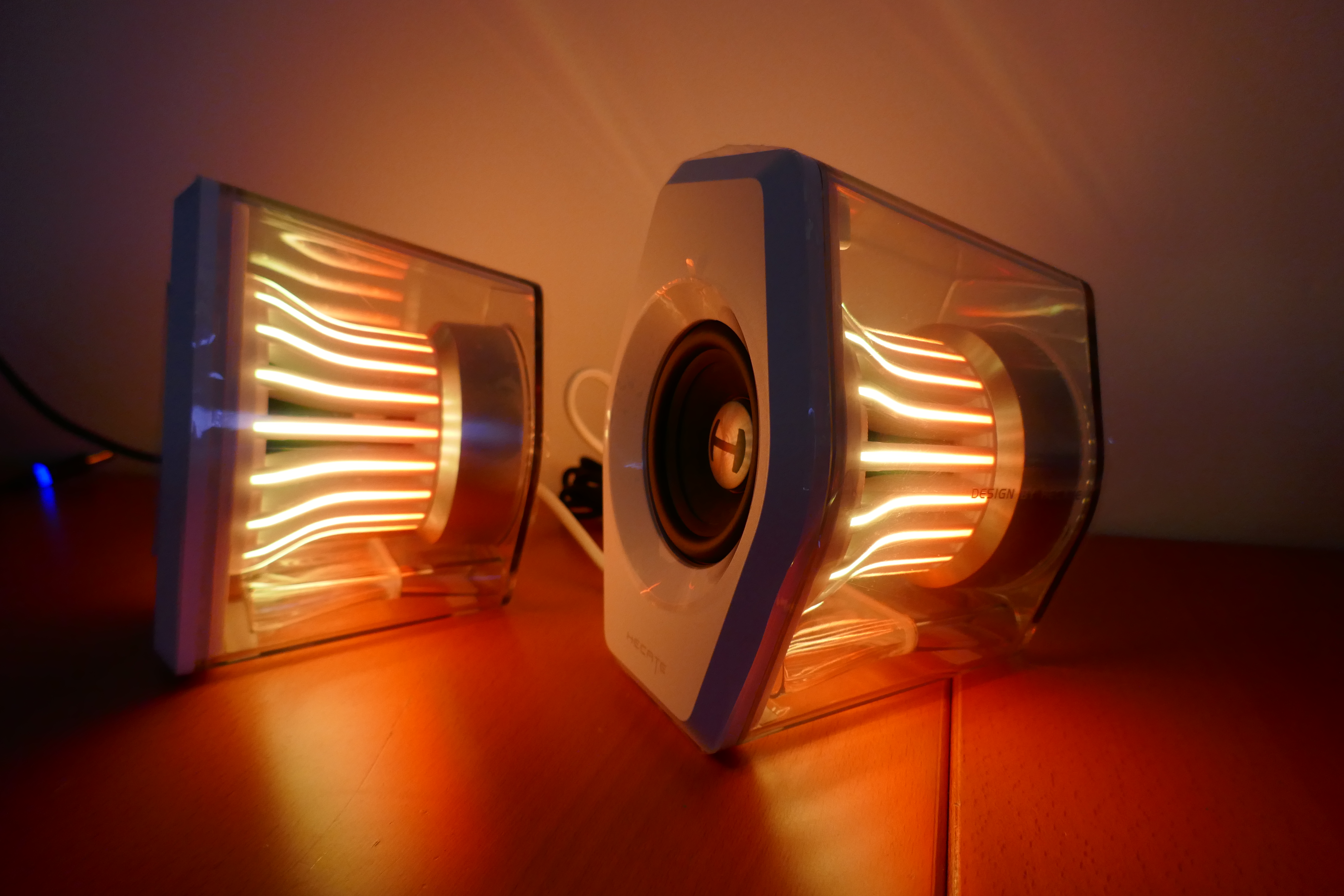 Gaming-Speaker wie die G2000 Pro sind nicht jedermanns Sache, aber optisch hat Edifier hier einen Hingucker gezaubert, den es so nicht als günstige No-Name-Variante gibt. Unser Opener-Bild als 3D-Render steht deutlich hinter dem realen Eindruck zurück. Das überwiegend durchsichtige Gehäuse hat was für sich; auch die LED-Effekte können sich sehen lassen und wirken keinesfalls billig.