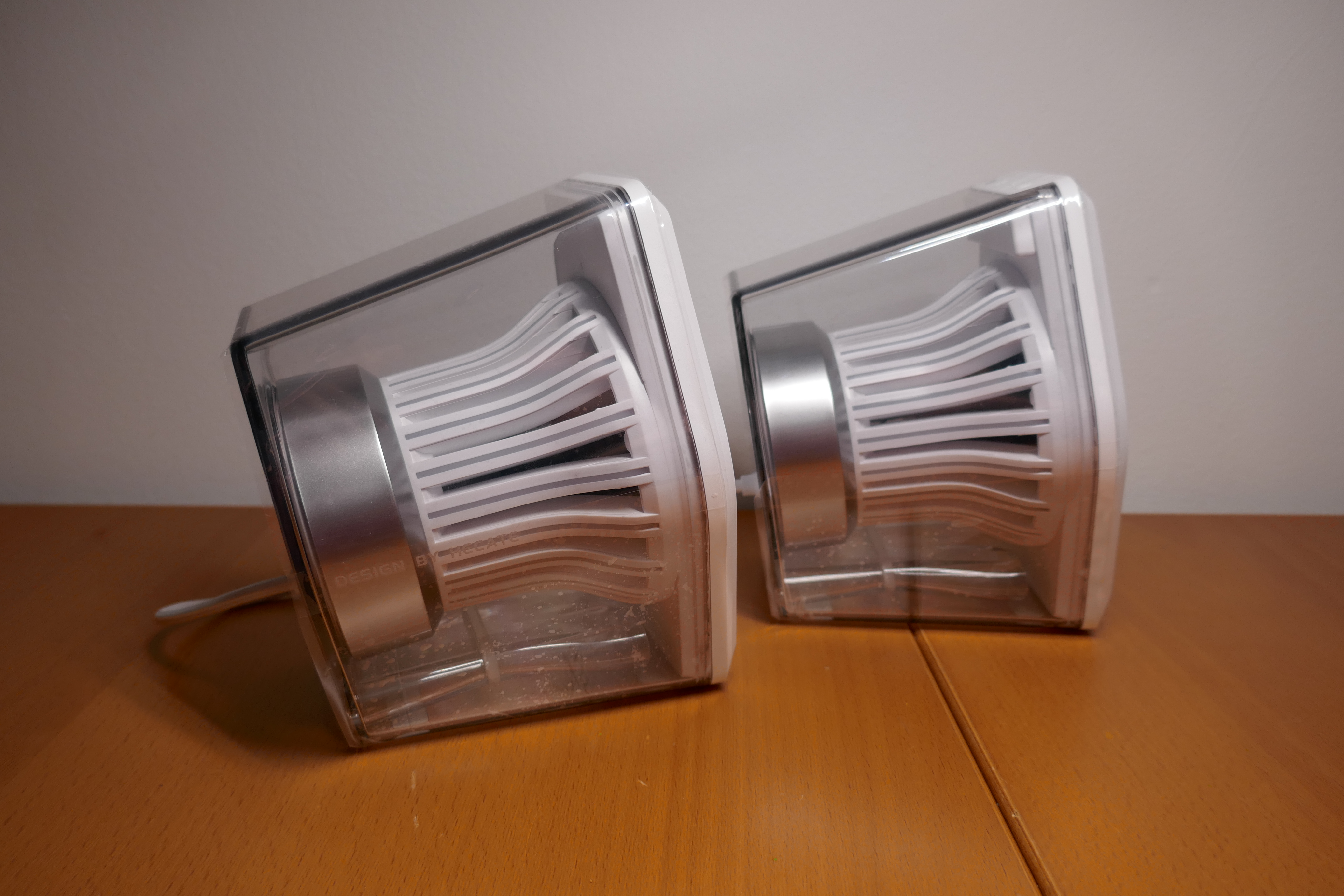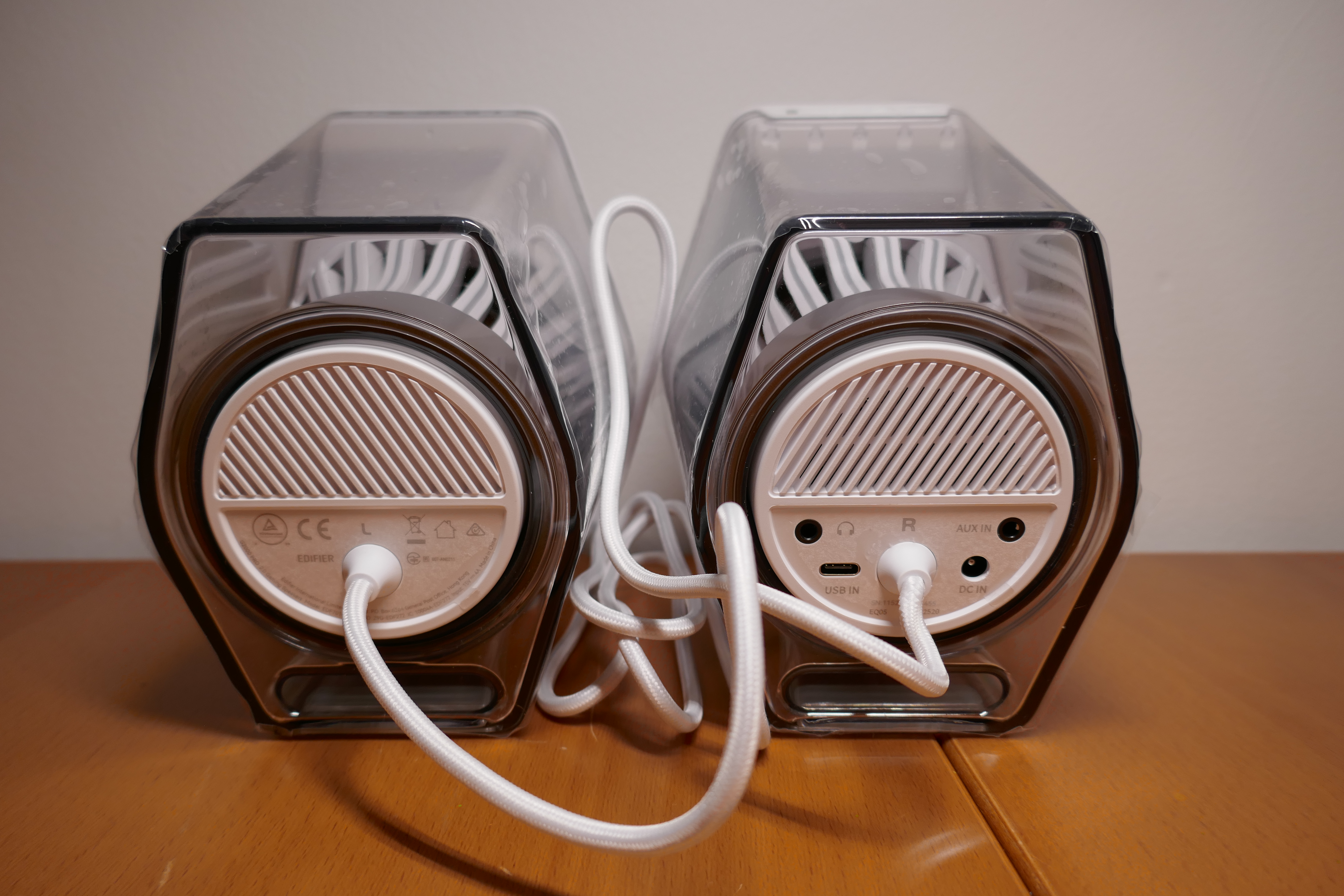 Obwohl die Grundform stark an die Edifier G2000 (zum Test) erinnert, fallen die Änderungen sofort auf. Der geschlossene, blickdichte Korpus weicht einer transparenten Variante aus Plexiglas. In deren Zentrum sitzt der Lautsprecher; von hinten betrachtet lässt sich der Treiber erahnen. Die Lautsprecher sind gewachsen und kommen nun jeweils auf 297 x 180 x 251 Millimeter, bei einem Gewicht von rund 800 Gramm pro Speaker. Zahlreiche LED-Streifen liegen am Klangkörper an und verleihen diesem einen futuristischen, für Gaming-Equipment typischen Look.