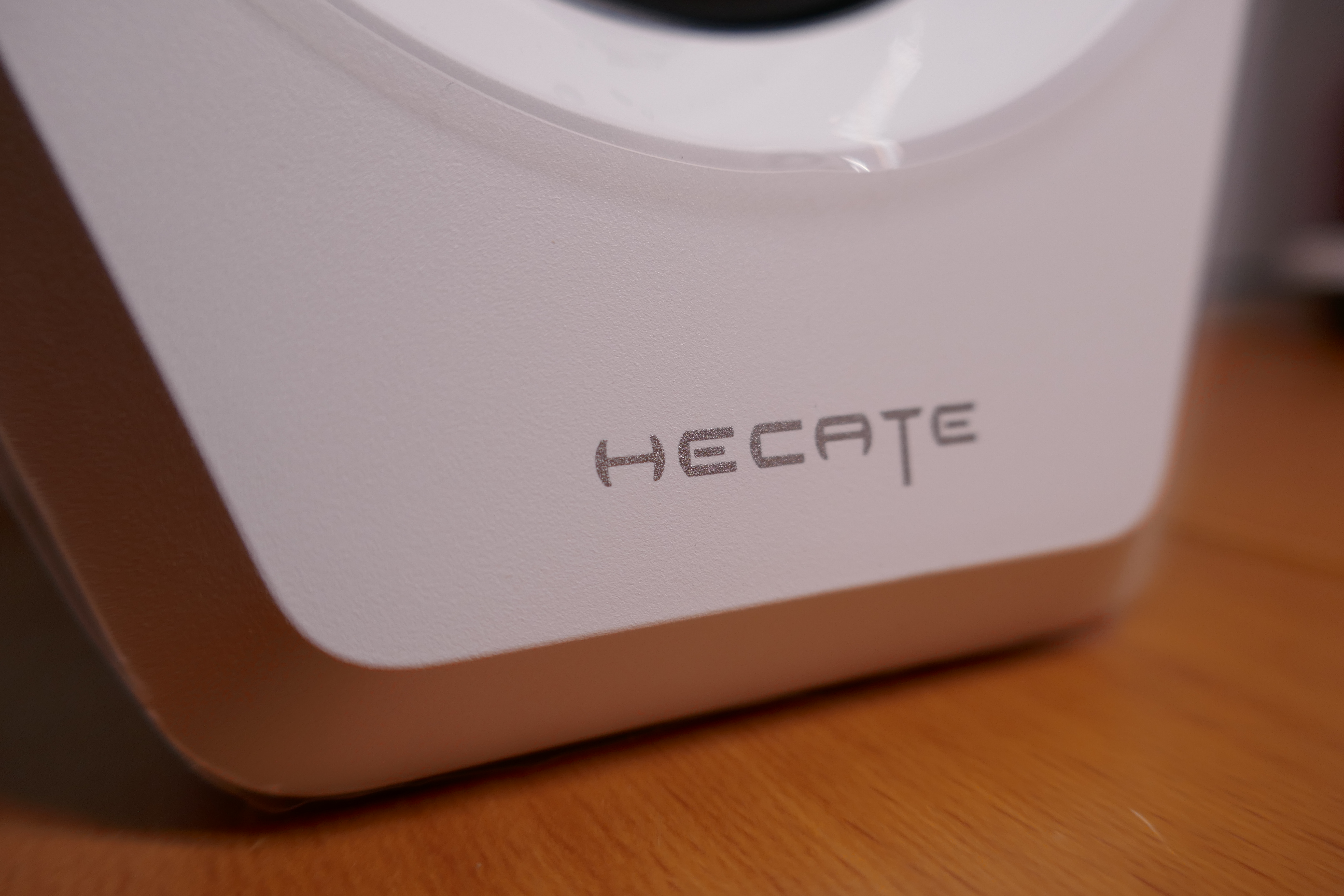 Ebenfalls in der Rückseite integriert ist das breite Bassreflexrohr, das für zusätzliche Tiefe ohne echten Tieftöner sorgen soll. Gesteuert werden die G2000 Pro über ein Tastenfeld an der Oberseite der rechten Einheit. Neben dem Einschalten und einer Mediensteuerung lassen sich hier auch der Verbindungskanal sowie der Klangmodus ändern. An der Front befindet sich der neue 3-Zoll-Treiber, in dessen Zentrum das H des Logos prangt. Direkt darunter macht ein Schriftzug klar, dass diese Lautsprecher der Hecate-Serie zuzuordnen sind.