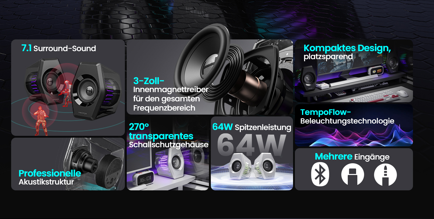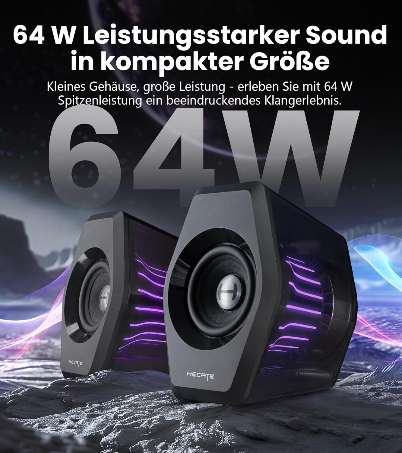 Trotz ihrer Größe konnten schon die G2000 eine beeindruckende Leistung von 16 Watt RMS auffahren. Diese Leistung kommt auch in den G2000 Pro zum Einsatz, allerdings pro Speaker. Wir sprechen also von 32 Watt RMS und sogar einer Maximalleistung von 64 Watt – mehr als genug für die Lautsprecher und die zusätzlichen LEDs.