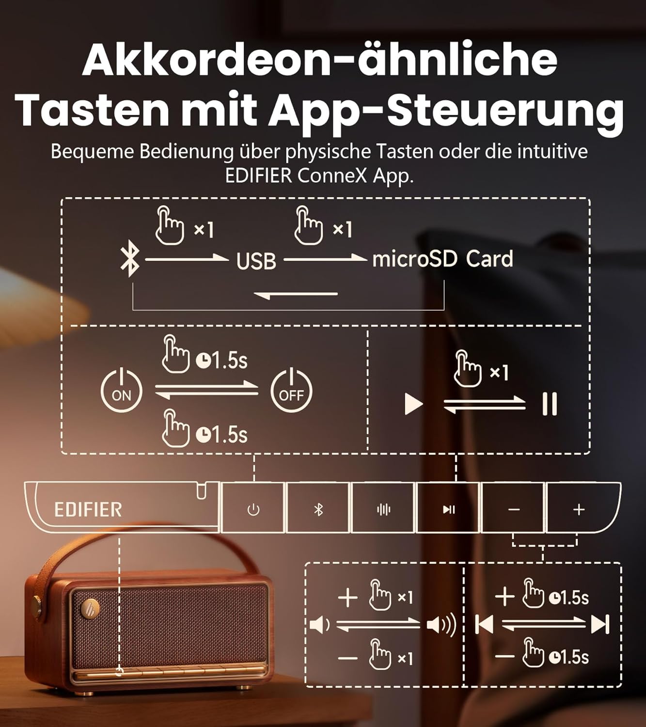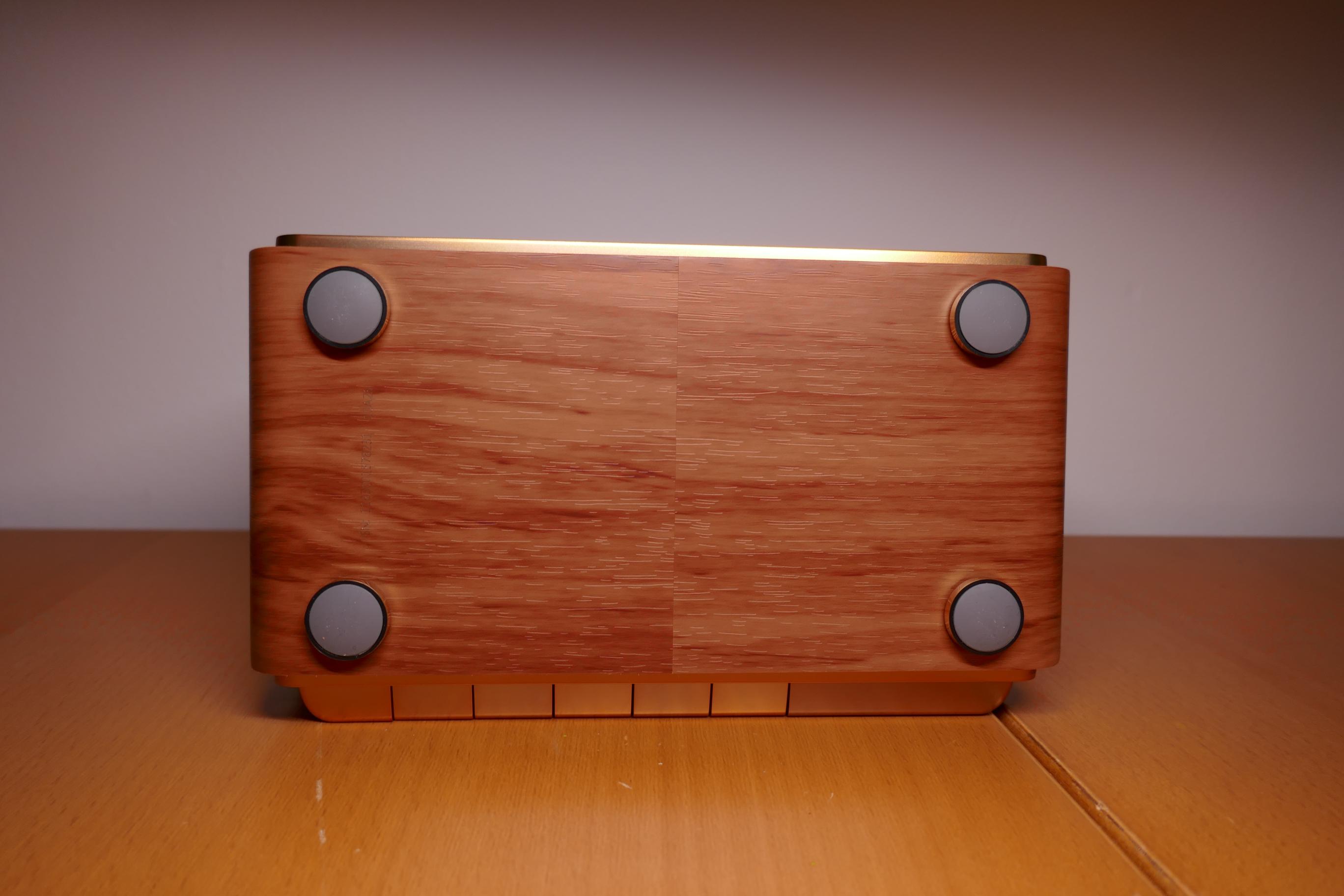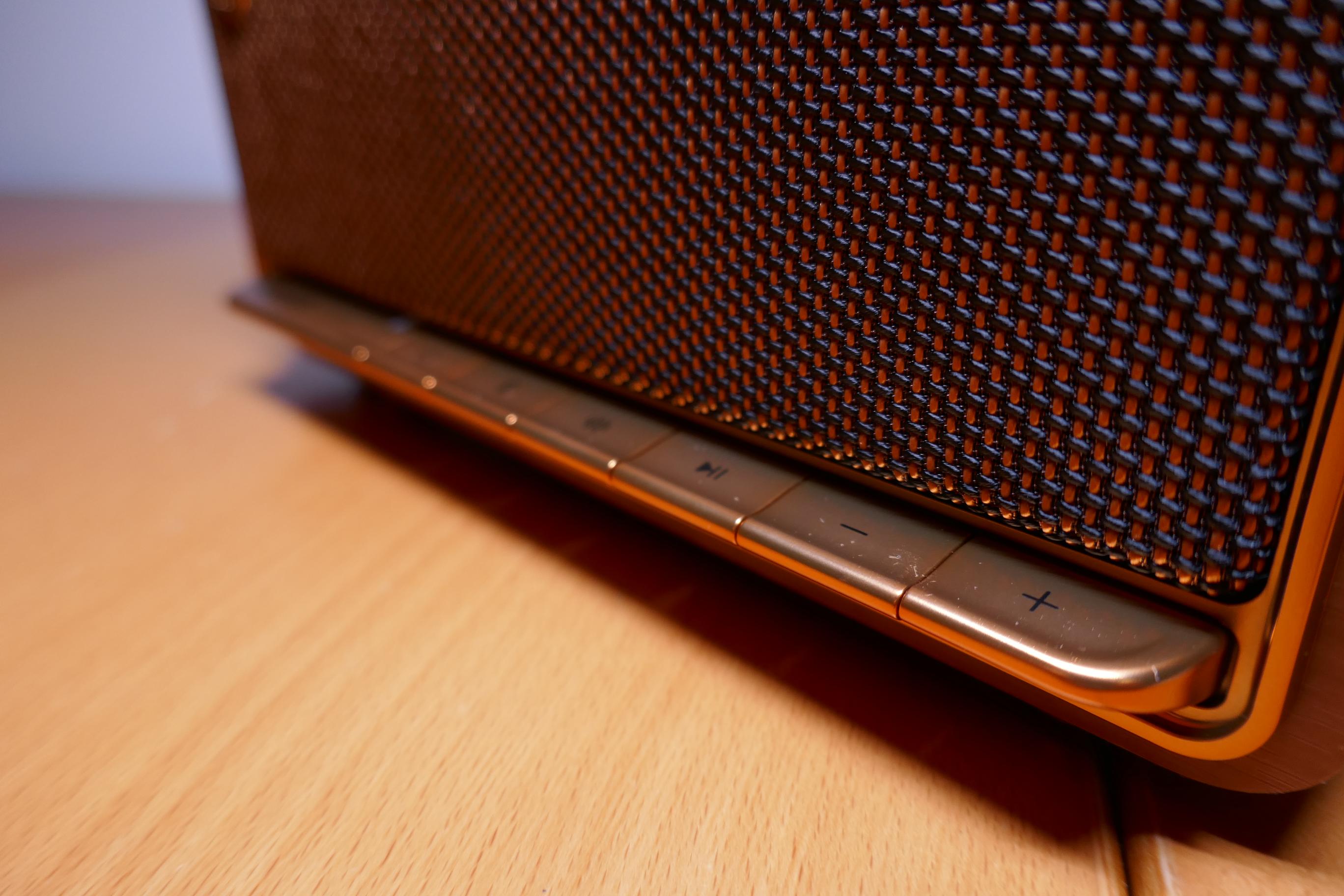 Aushängeschild und maßgeblich verantwortlich für den Retro-Look sind die physischen Tasten an der Front. Sechs Tasten stehen bereit, darunter die übliche Mediensteuerung, ein Power-Button und ein Bluetooth-Button. Ein weiterer Knopf koppelt zwei Geräte für den Stereo-Modus.