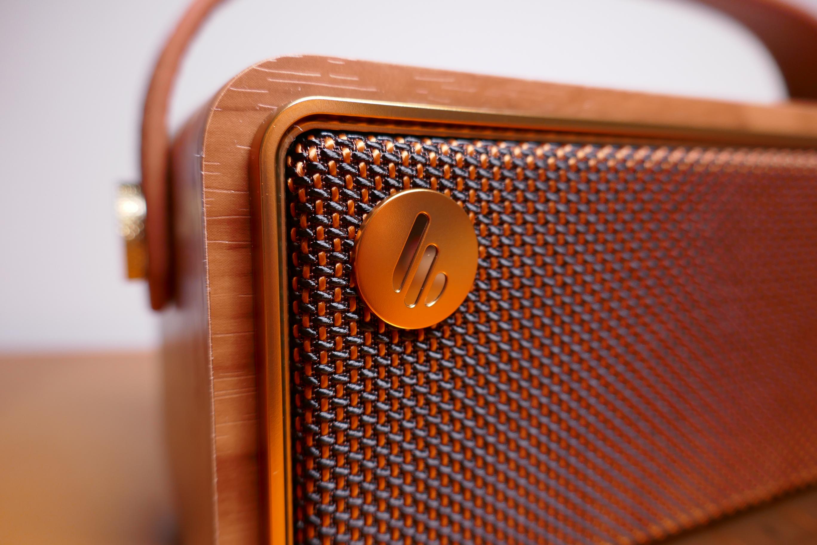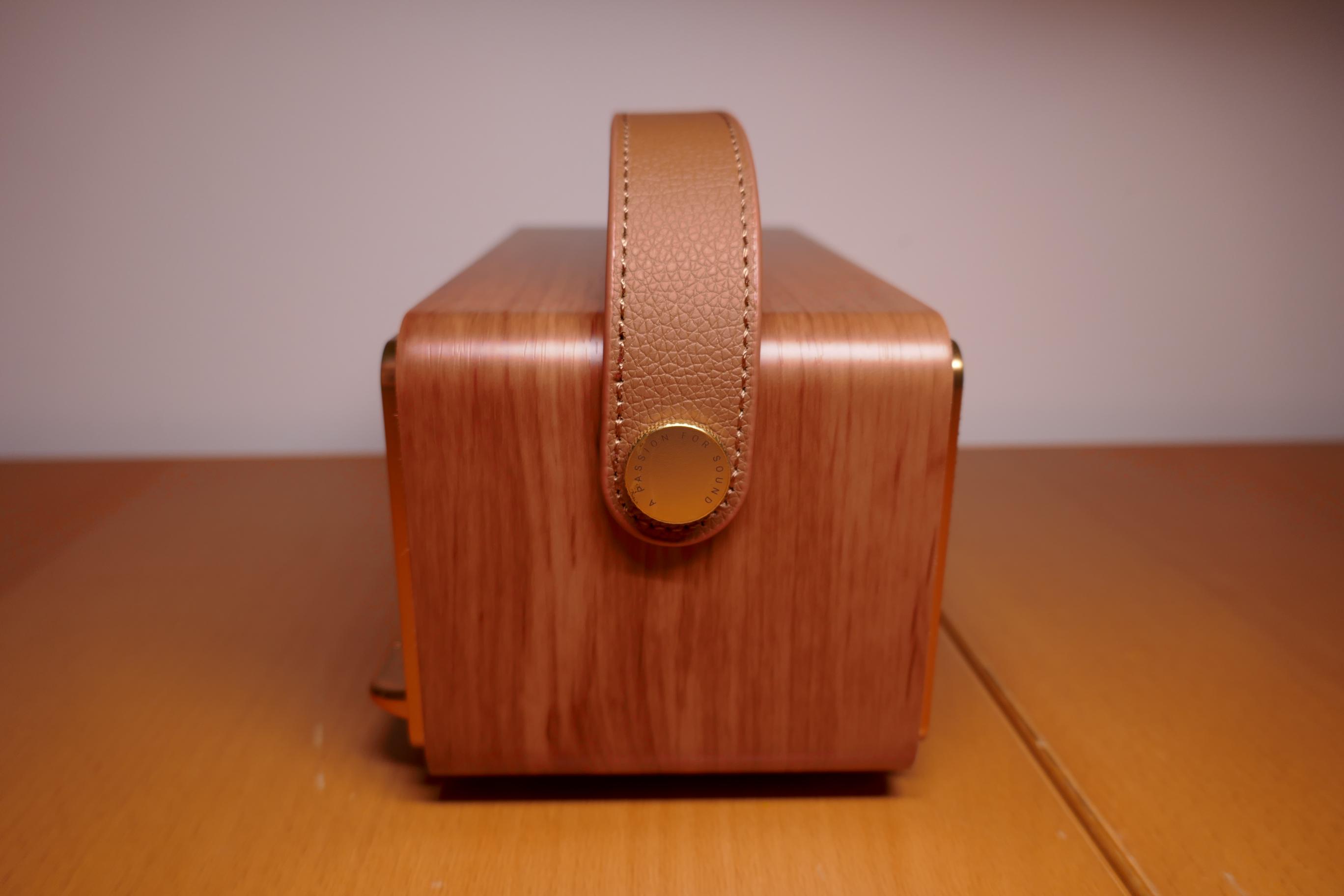 Der „Kofferradio-Look“ wird durch ein Trageband aus Kunstleder verstärkt. Ihr könnt den MP330 in dem von uns getesteten Braun, in einer schwarzen Variante mit silbernen Akzenten oder in einer weißen Variante mit goldenen Akzenten erstehen. Die Farbe des Tragegriffs richtet sich dabei nach der Farbe des Gehäuses.