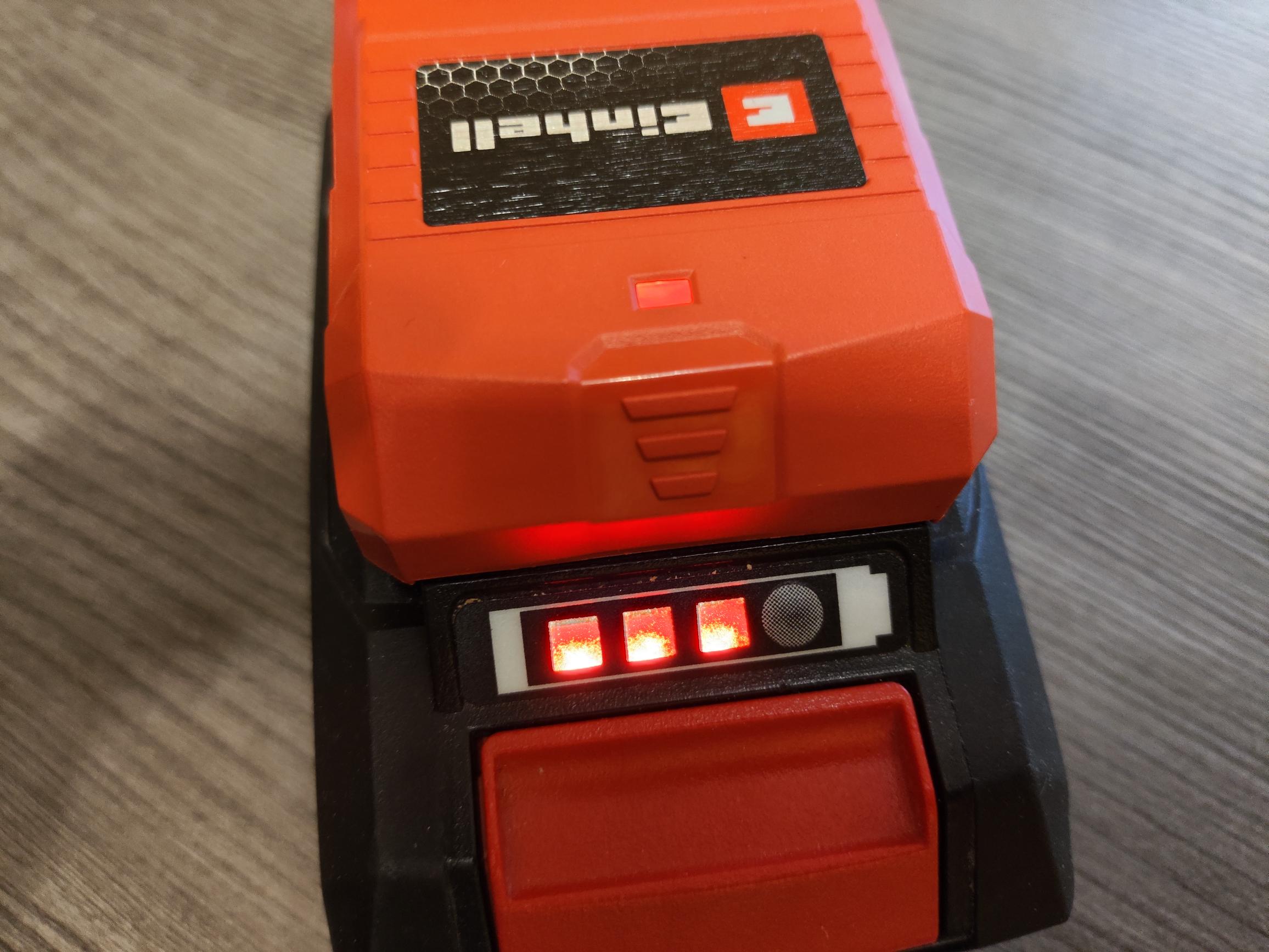 Für die Inbetriebnahme steckt ihr lediglich den Adapter auf den Werkzeugakku, drückt die Taste und schon könnt ihr bis zu zwei Geräte gleichzeitig laden. Die rote Status-LED auf der Oberseite signalisiert die Bereitschaft des Adapters. Ist kein Verbraucher angeschlossen, schaltet er sich nach rund 30 Sekunden automatisch ab, um den Akku nicht unnötig zu entleeren. Über eine Akkustandanzeige verfügt der Adapter nicht. Diese ruft ihr wie gewohnt direkt am Akku (3-Balken-Anzeige) ab.