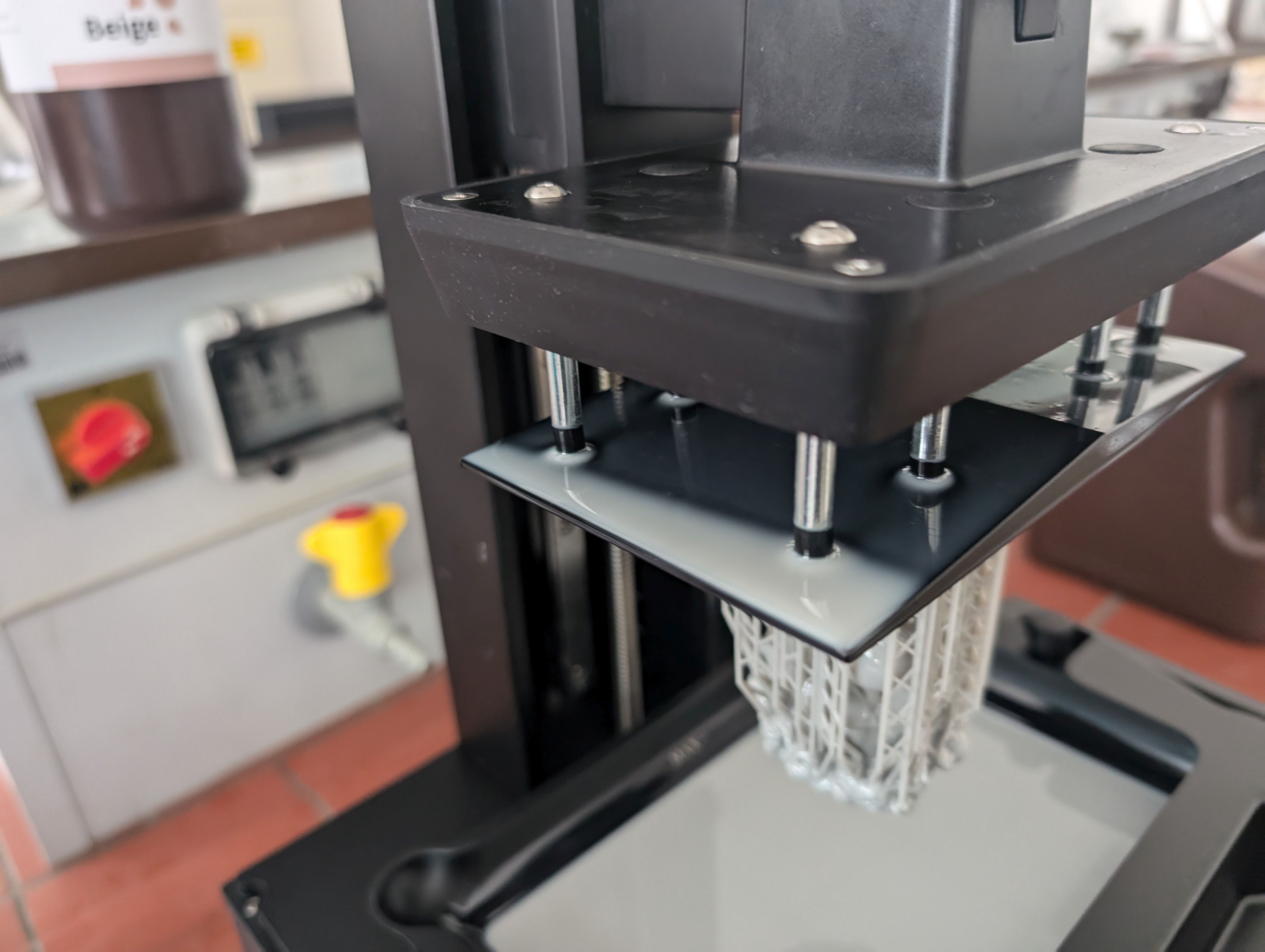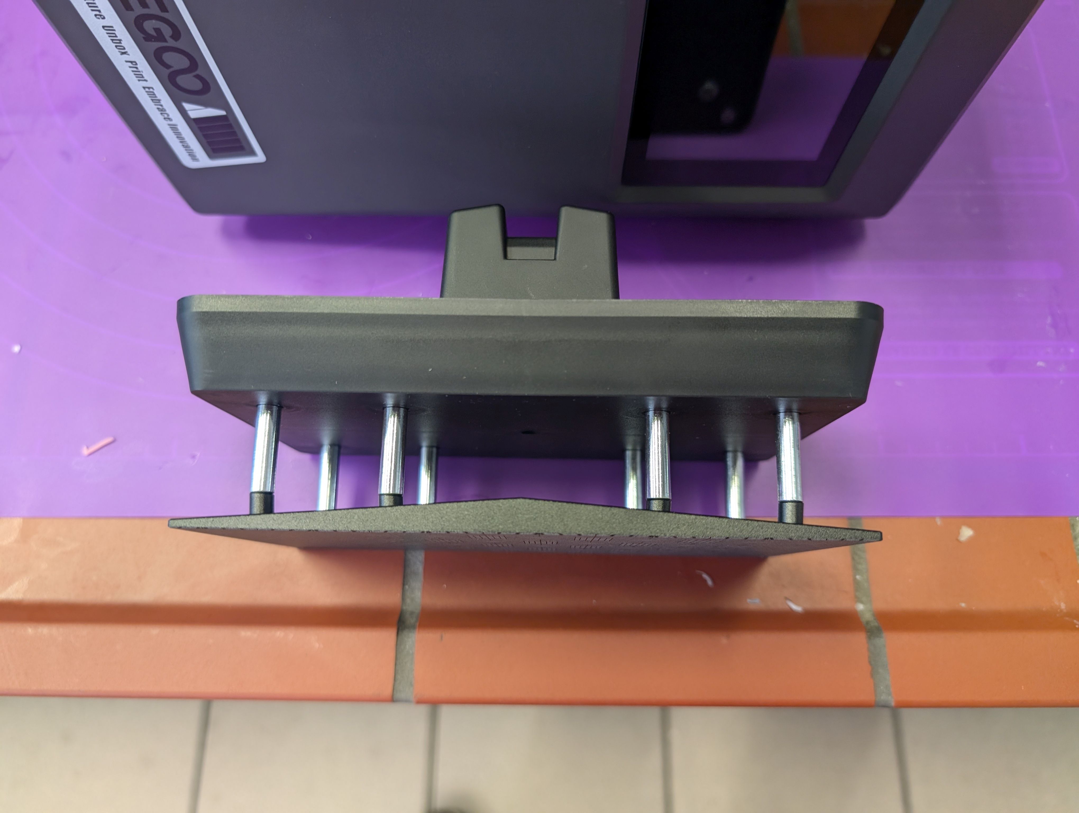 Das weniger erfreuliche Thema ist die Reinigung. Selbst nach einer Nacht Abtropfzeit hängt an die Druckplatte noch einiges an Harz. Gott sei Dank gibt es ja die „Sabberschürze“, denn trotz Einhandbedienung tropft noch einiges beim Abnehmen der Druckplatte herunter. Ich habe es mir angewöhnt, dass ich sie nach Abnahme des Druckergebnisses in einem Isopropanol-Bad mit einem Silikonspatel reinige. Das gestaltet sich aber hier schwierig, da die acht Verbindungsbolzen doch erheblich stören.