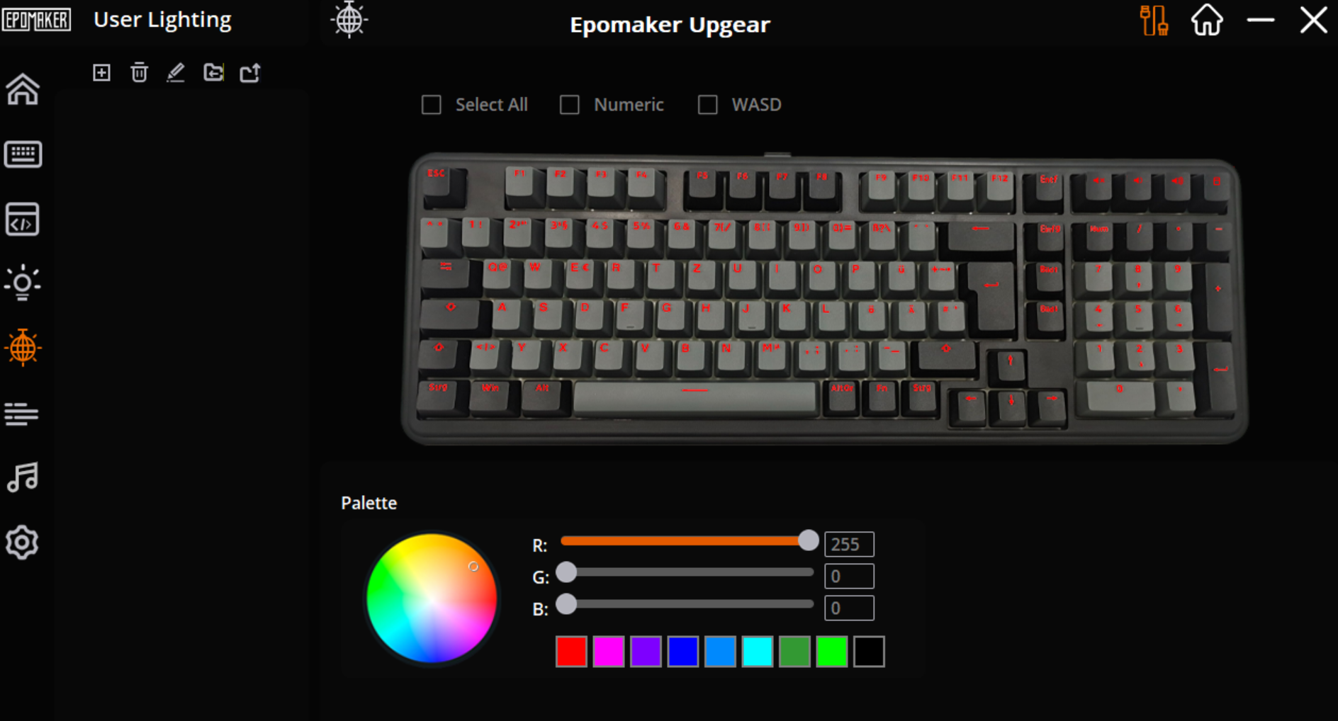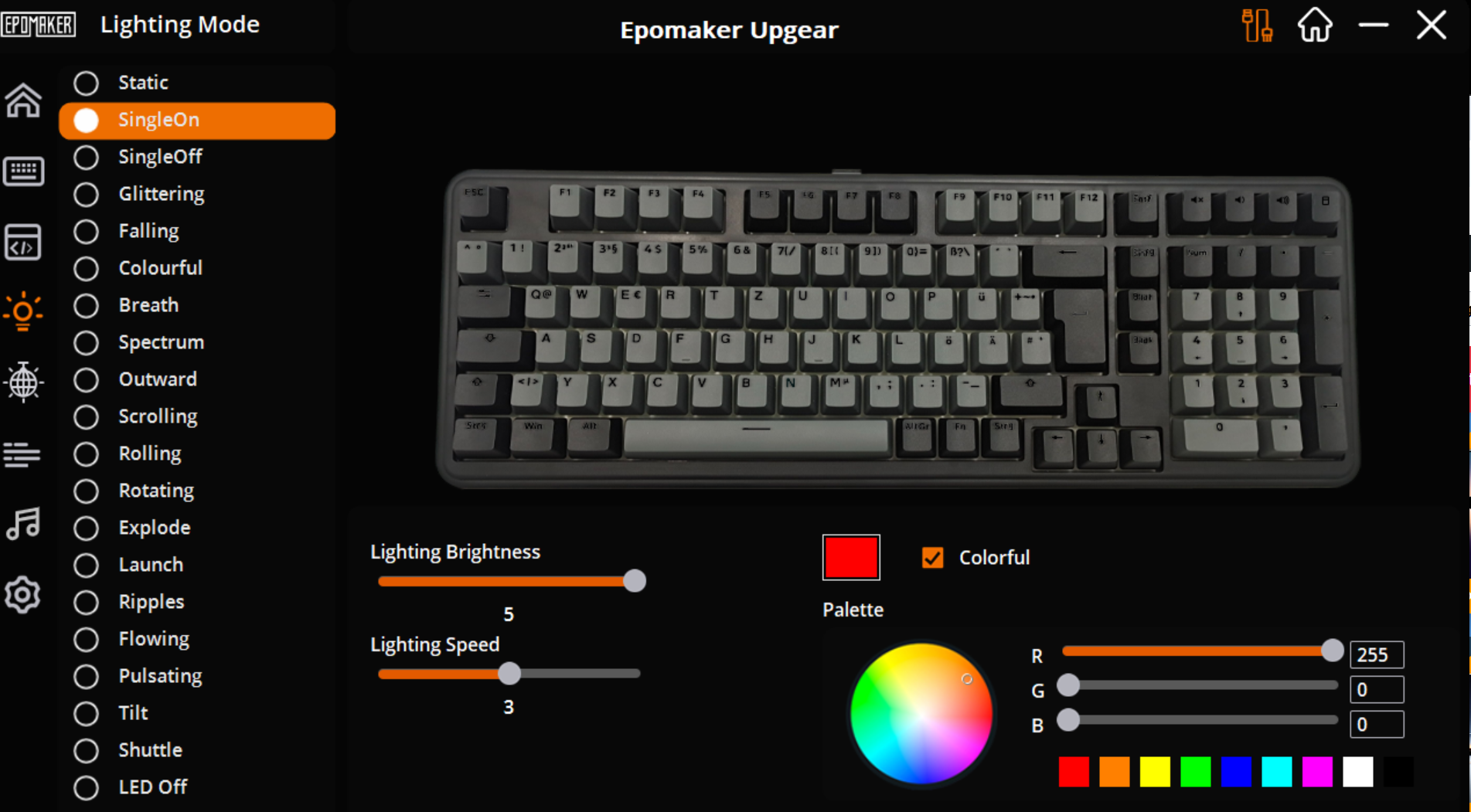Das notwendige Windows-Programm heißt “Epomaker Upgear” und kann einfach über die Webseite des Herstellers bezogen werden. Es ist nur in Englisch verfügbar. Zur Nutzung und Konfiguration der Tastatur wird ein USB-C-Kabel benötigt. Über Bluetooth oder einen 2,4-GHz-Dongle wird die Tastatur leider nicht erkannt. Ich liefere euch hier Screenshots aus der Software. Es gibt durchaus viele Einstellungsmöglichkeiten, gerade für Makros und für eine individuelle LED-Beleuchtung. Das funktioniert auch alles ganz ordentlich, aber die Software wirkt nicht durchdacht und ist nicht direkt an die Tastatur angepasst. Die Open-Source-Software VIA sollte eigentlich auch unterstützt werden, hat im Test für weitergehende Einstellungen aber ungünstigerweise nicht funktioniert.